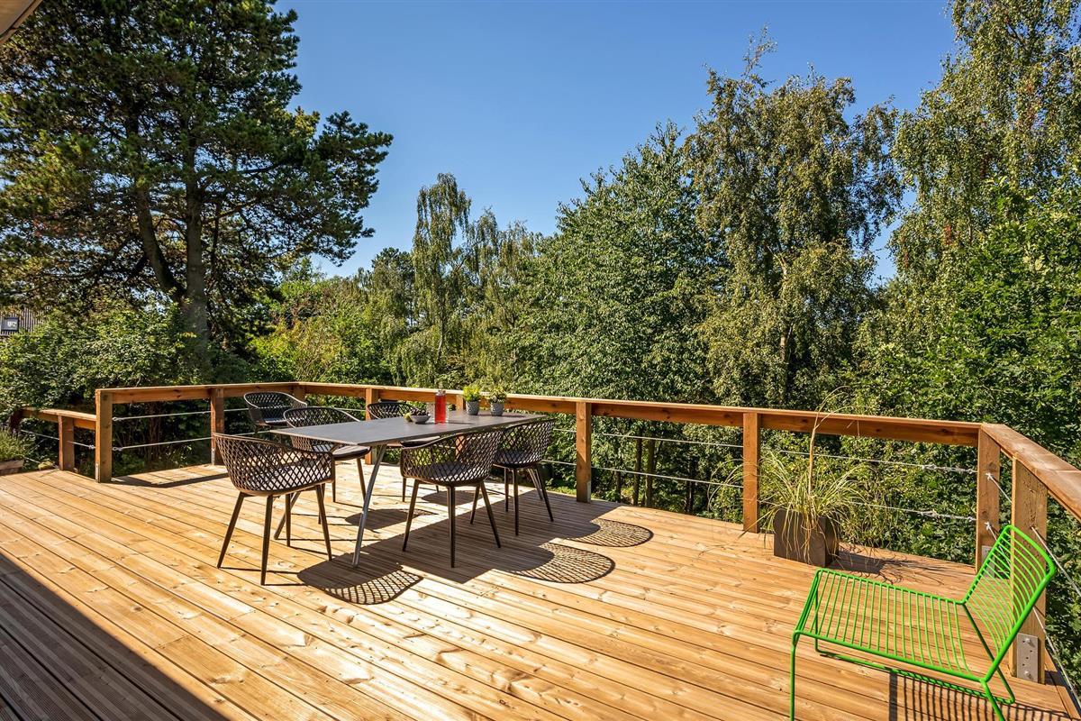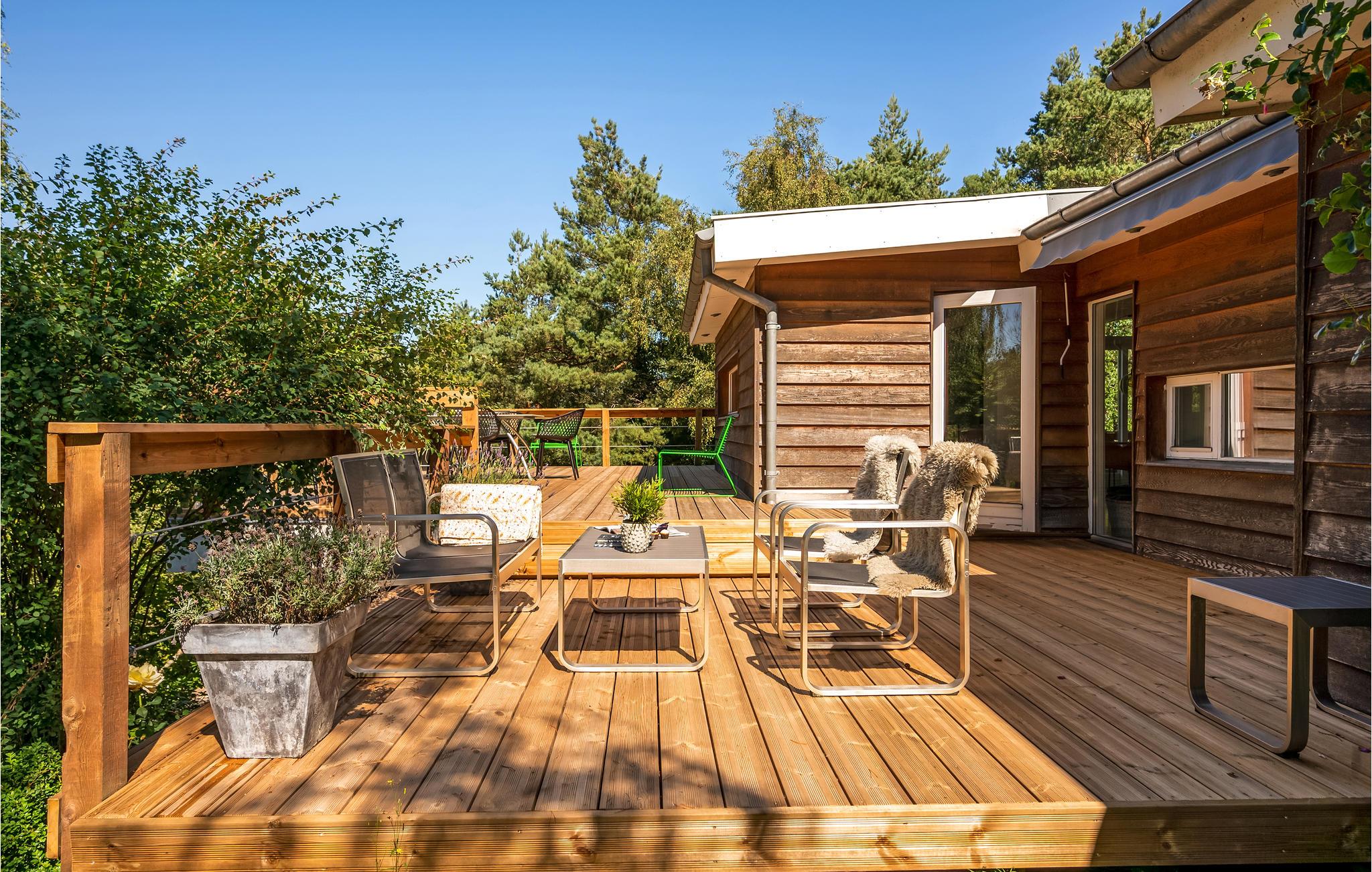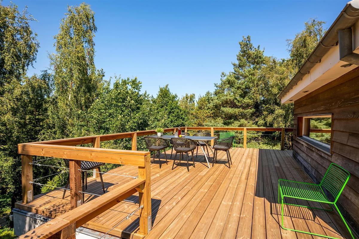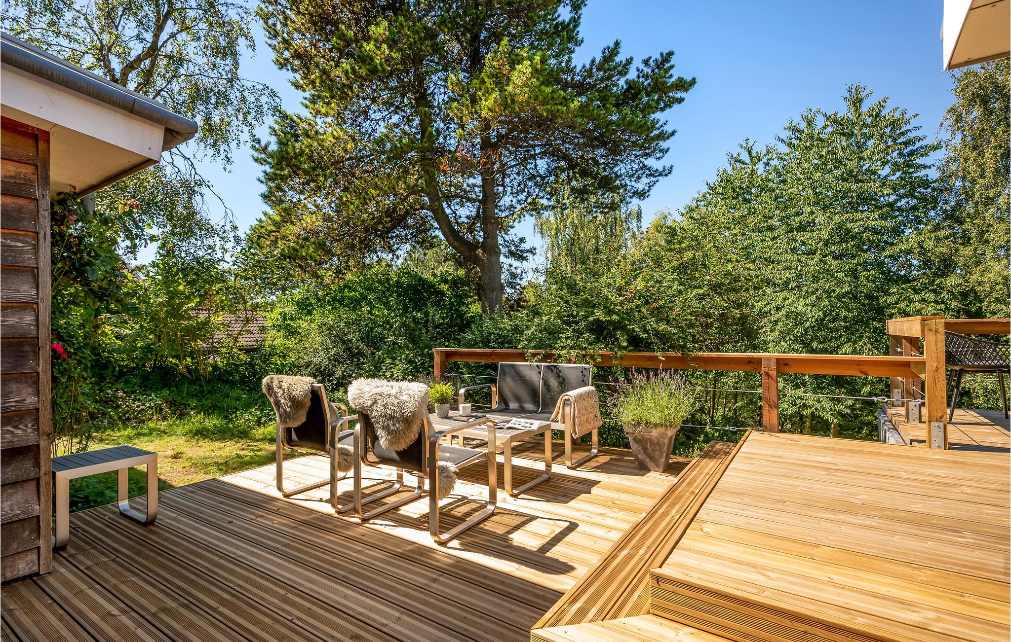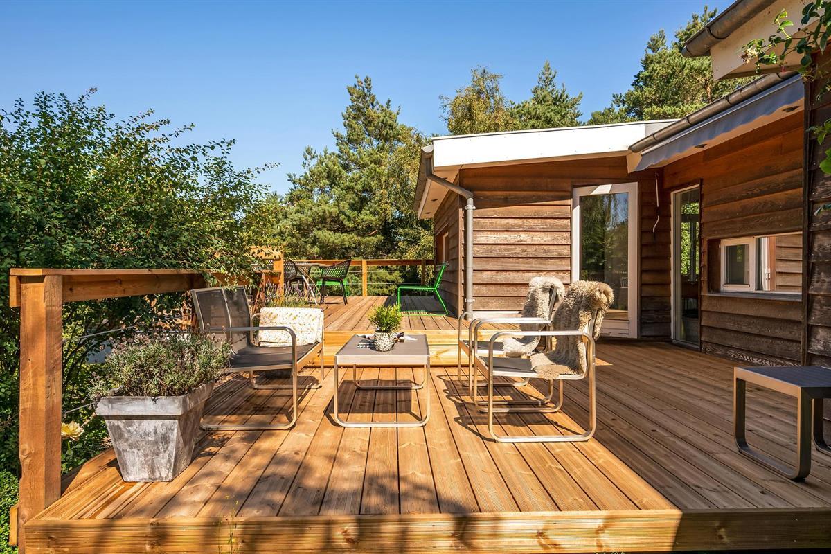 Uniek trapsgewijs vakantiehuis nabij Ebeltoft met stijlvol interieur en zonnige terrassen.