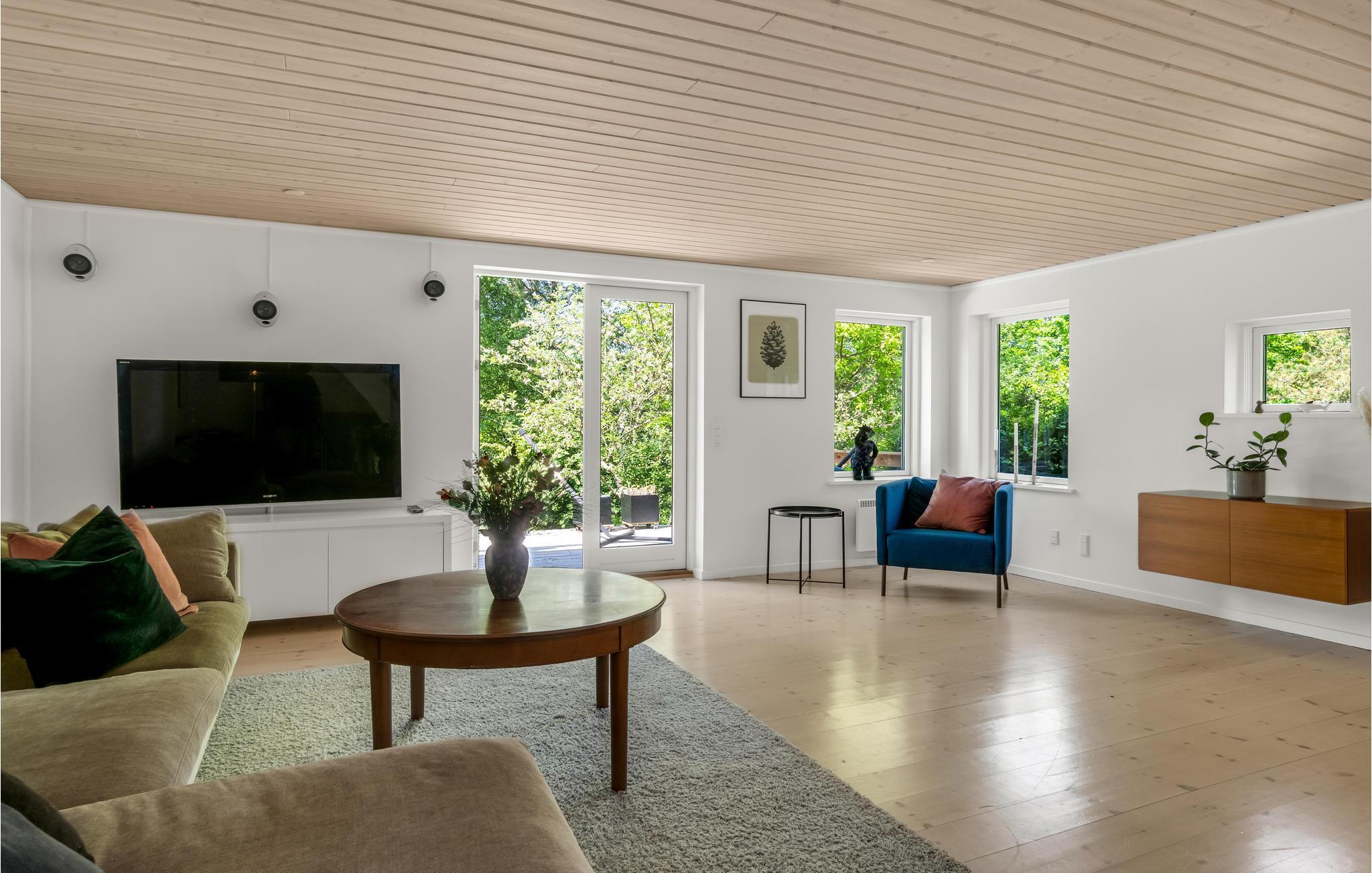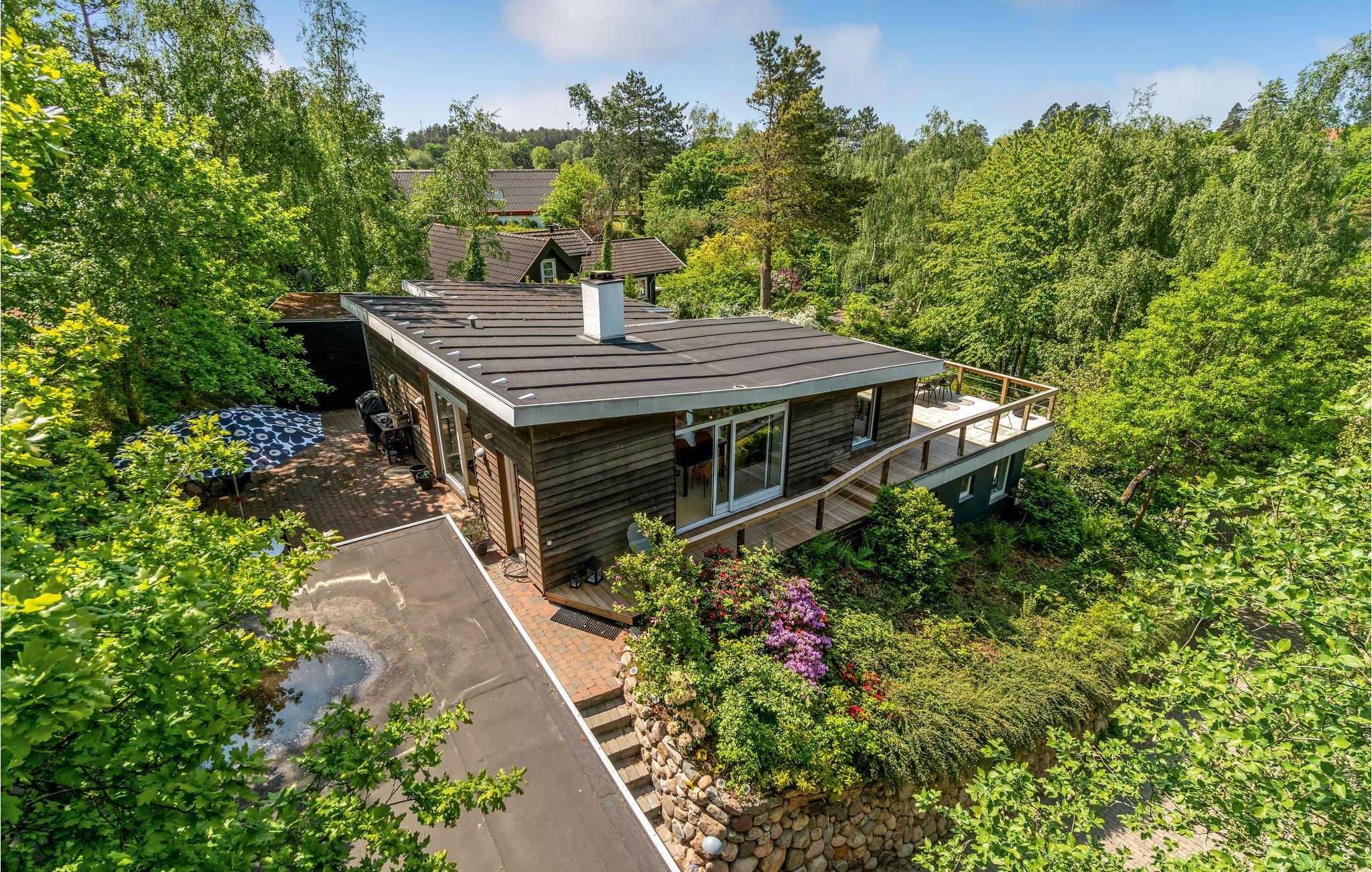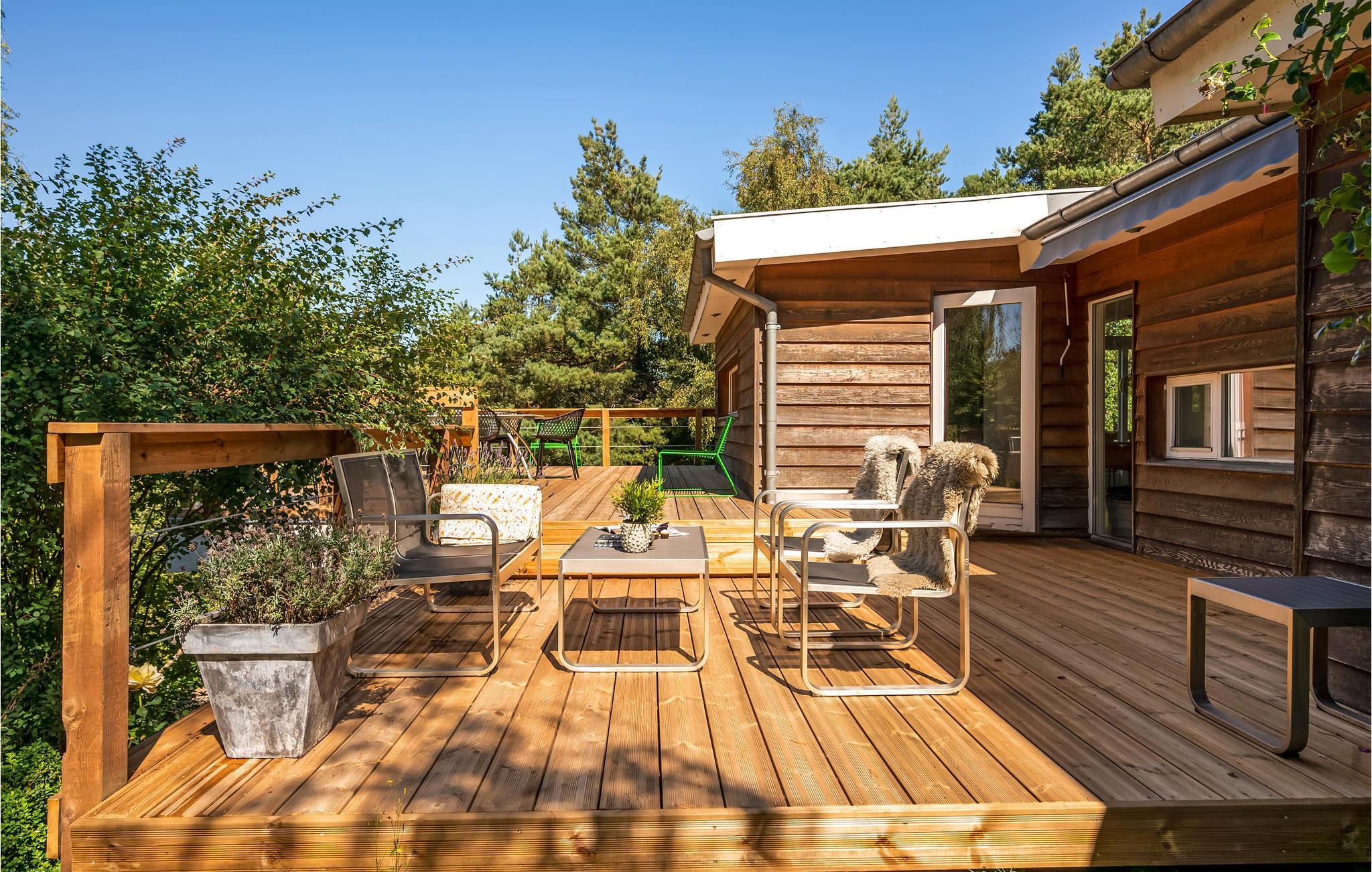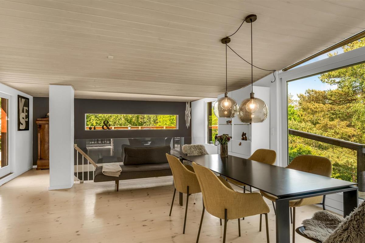 Uniek trapsgewijs vakantiehuis aan de rand van Ebeltoft met stijlvol interieur en ruime terrassen.