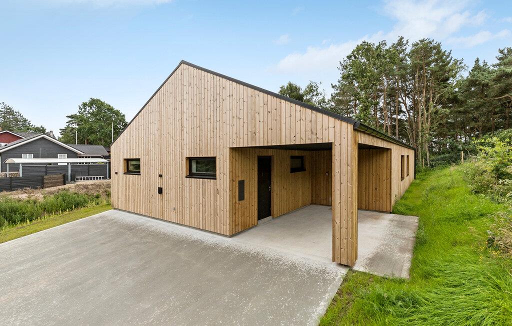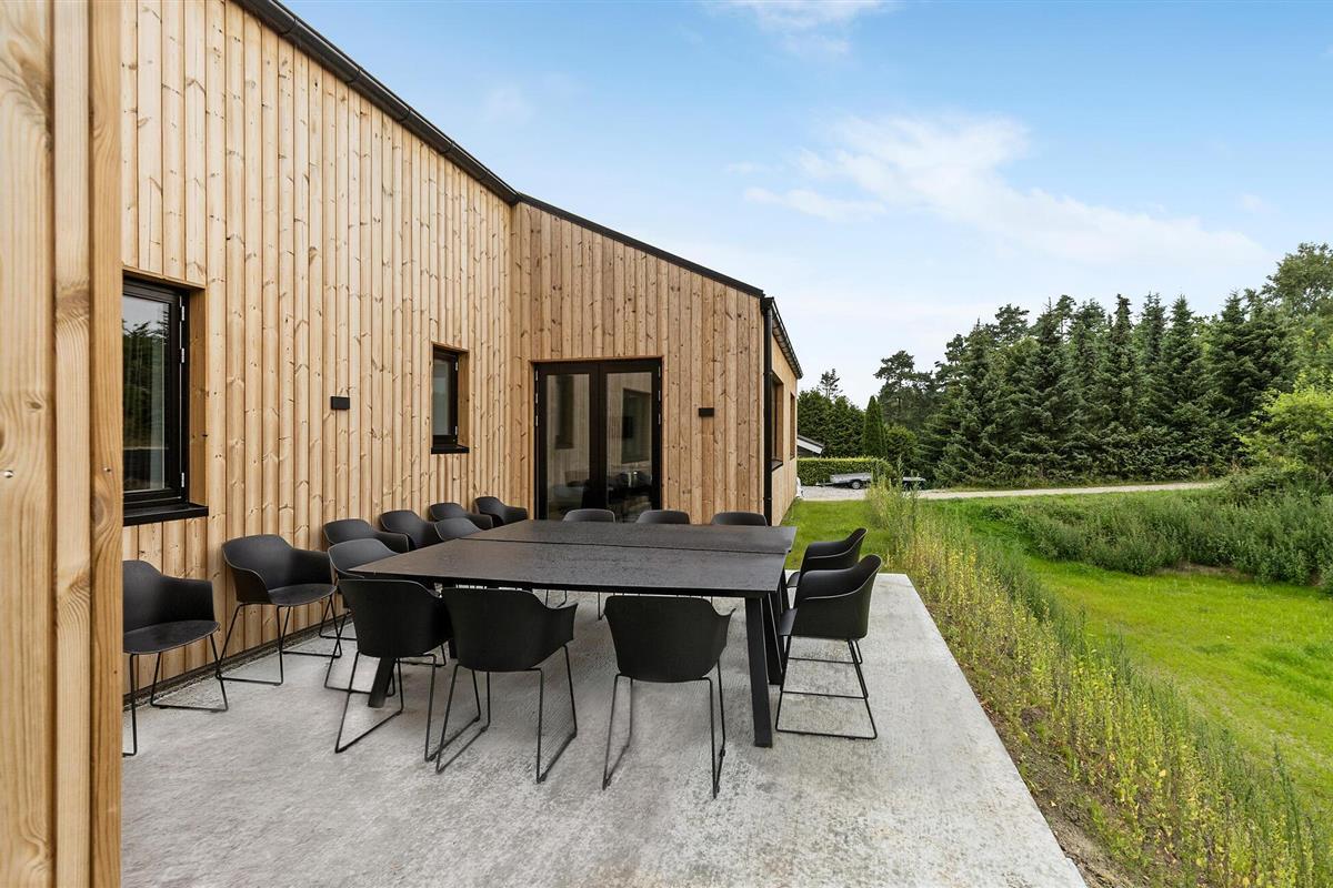 Net buiten Ebeltoft verwelkomt dit comfortabele en moderne vakantiehuis met Fins houten bad je in een groene omgeving.