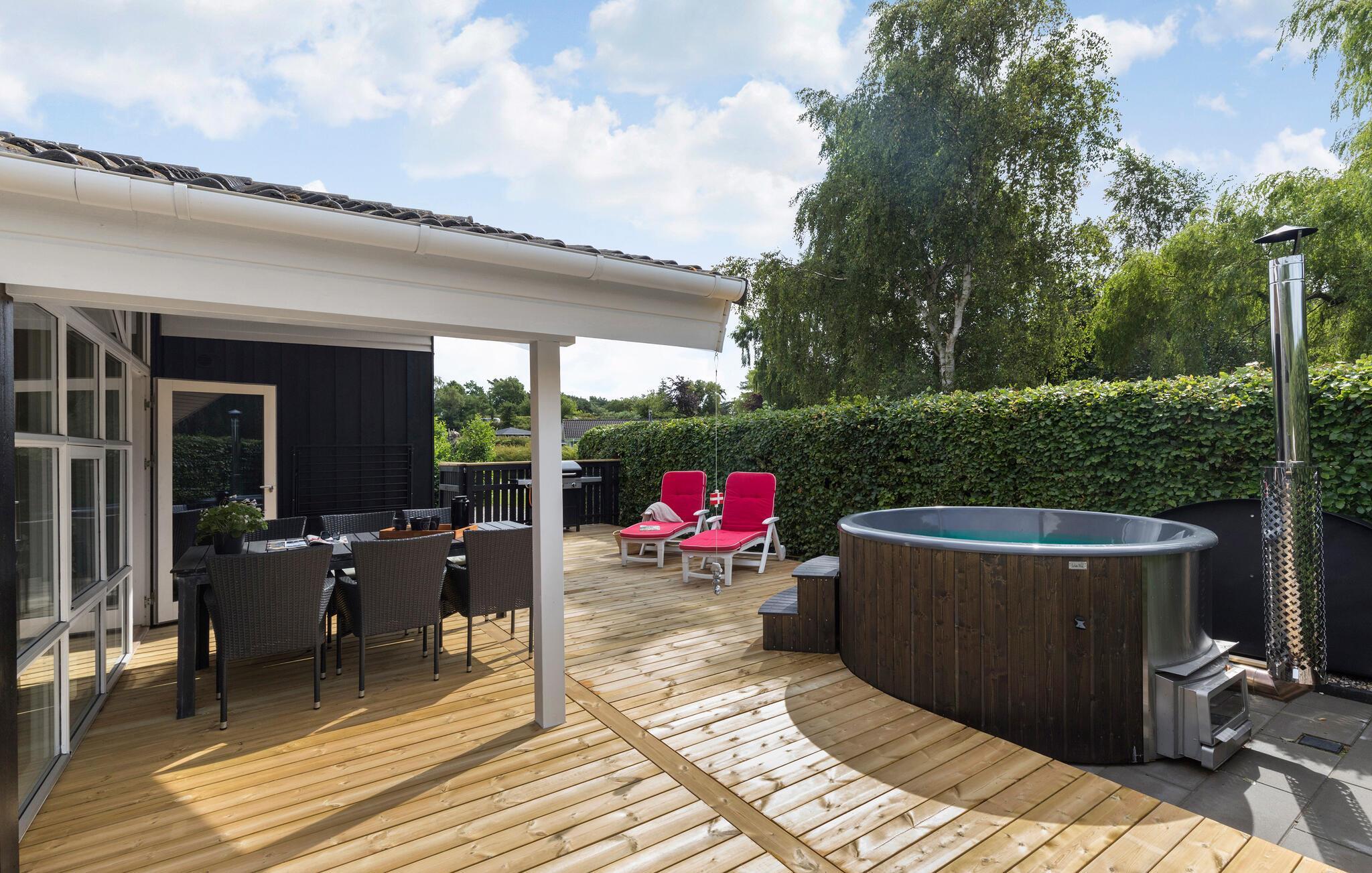 Ontdek dit moderne vakantiehuis in Ebeltoft met sauna en Finse hottub, vlak bij zee en winkels.