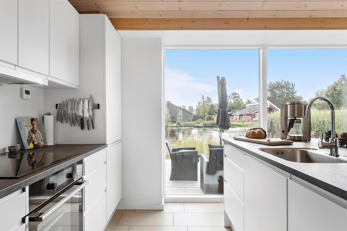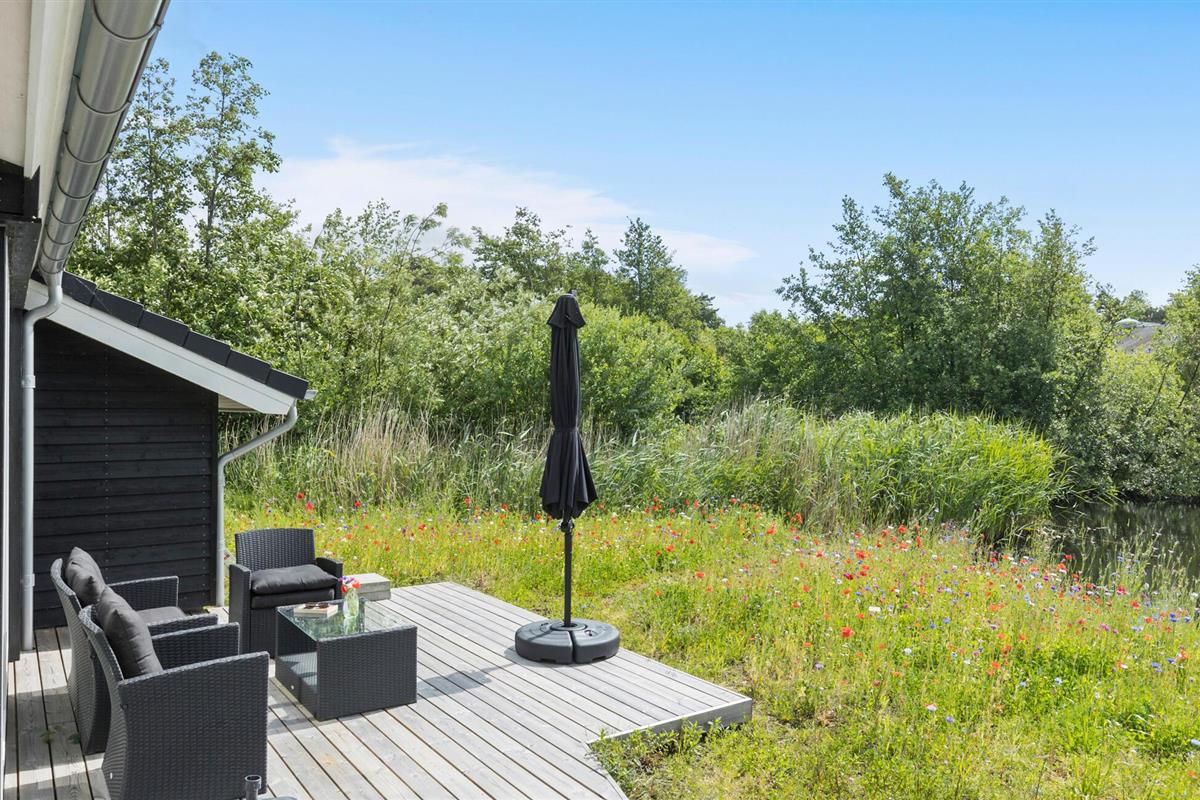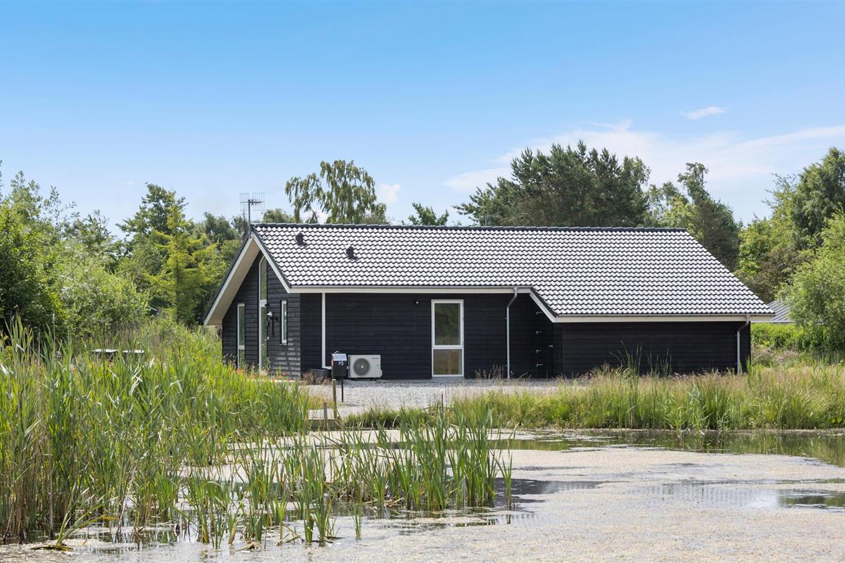 Ontdek dit moderne vakantiehuis bij Vibæk Strand met tuin, terras en uitzicht op het meer voor een ontspannen verblijf.