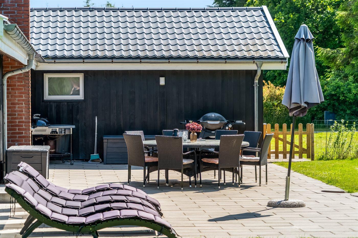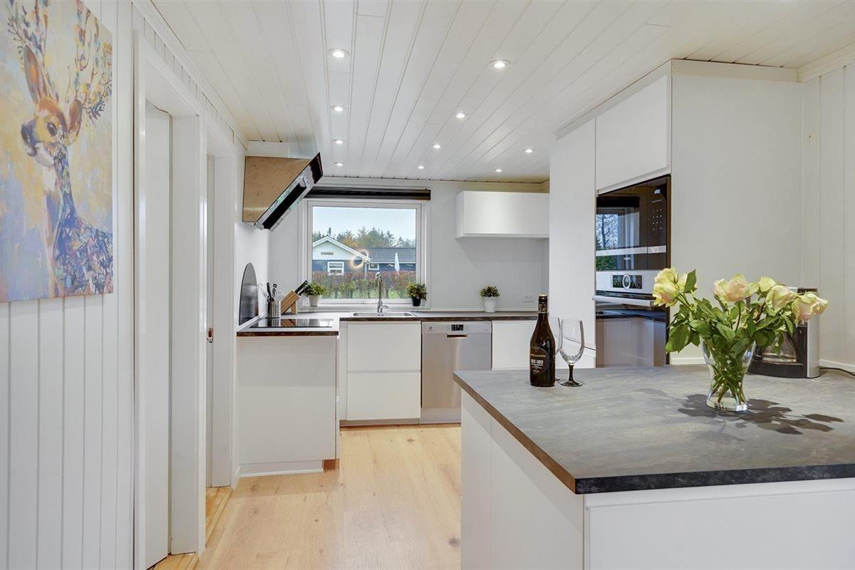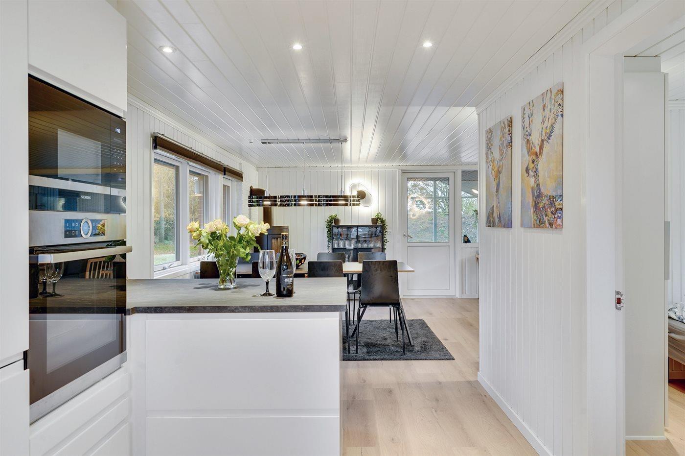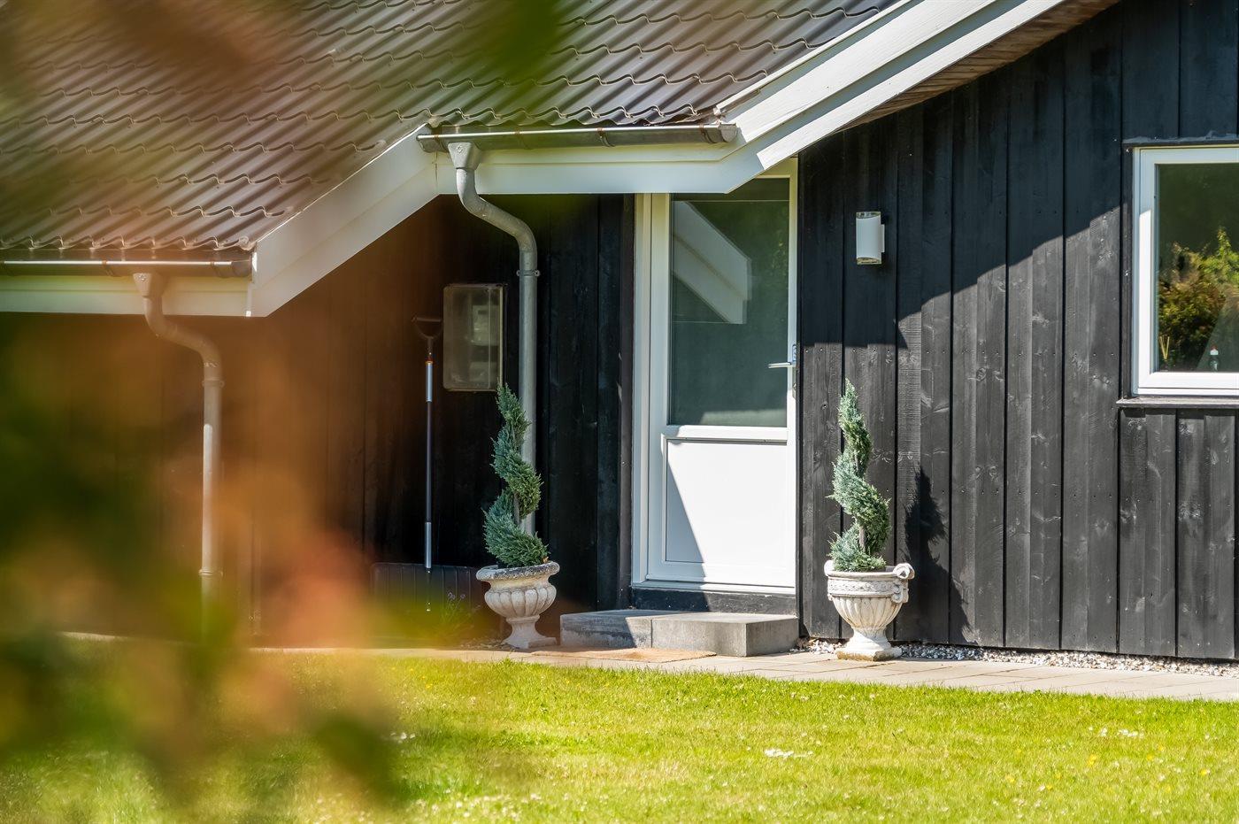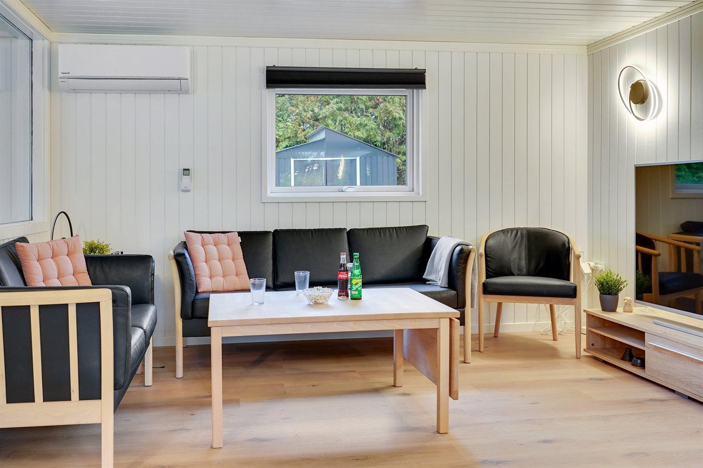 De vakantiewoning is gelegen op een 1500 m² groot aangelegde tuin. De grond is omheind. Afstand tot de zee 1300 m. Afstand tot de fjord 700 m. Dichtstbijzijnde winkel 650 m. Bij de vakantiewoning hoort 100 m² terras. Gereedschapsruimte. Zandbak. Voetbaldoel.Vuurplaats. Barbecue. Het huis heeft een stopcontact voor het opladen van een elektrische auto. Parkeerplaats bij het huis.