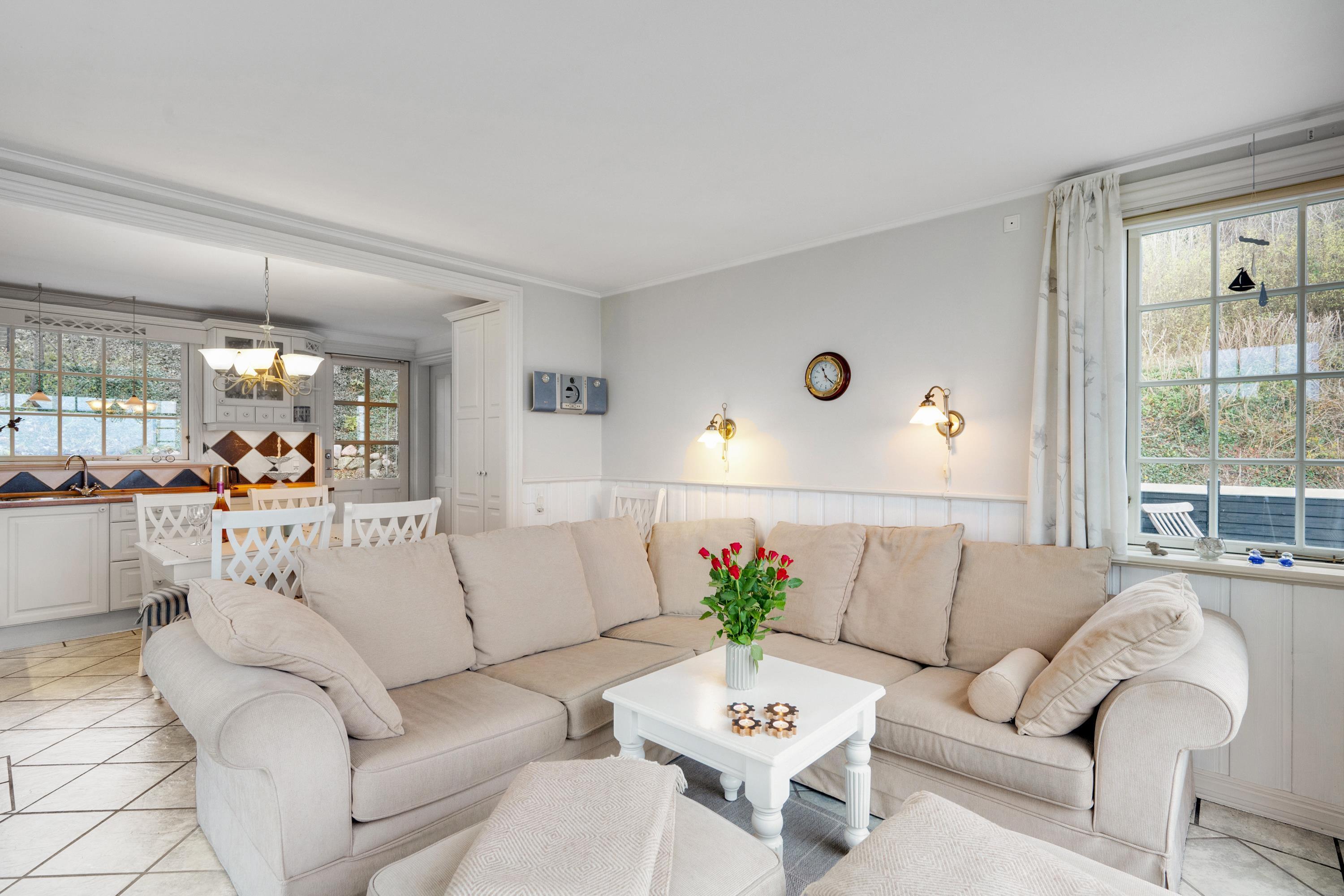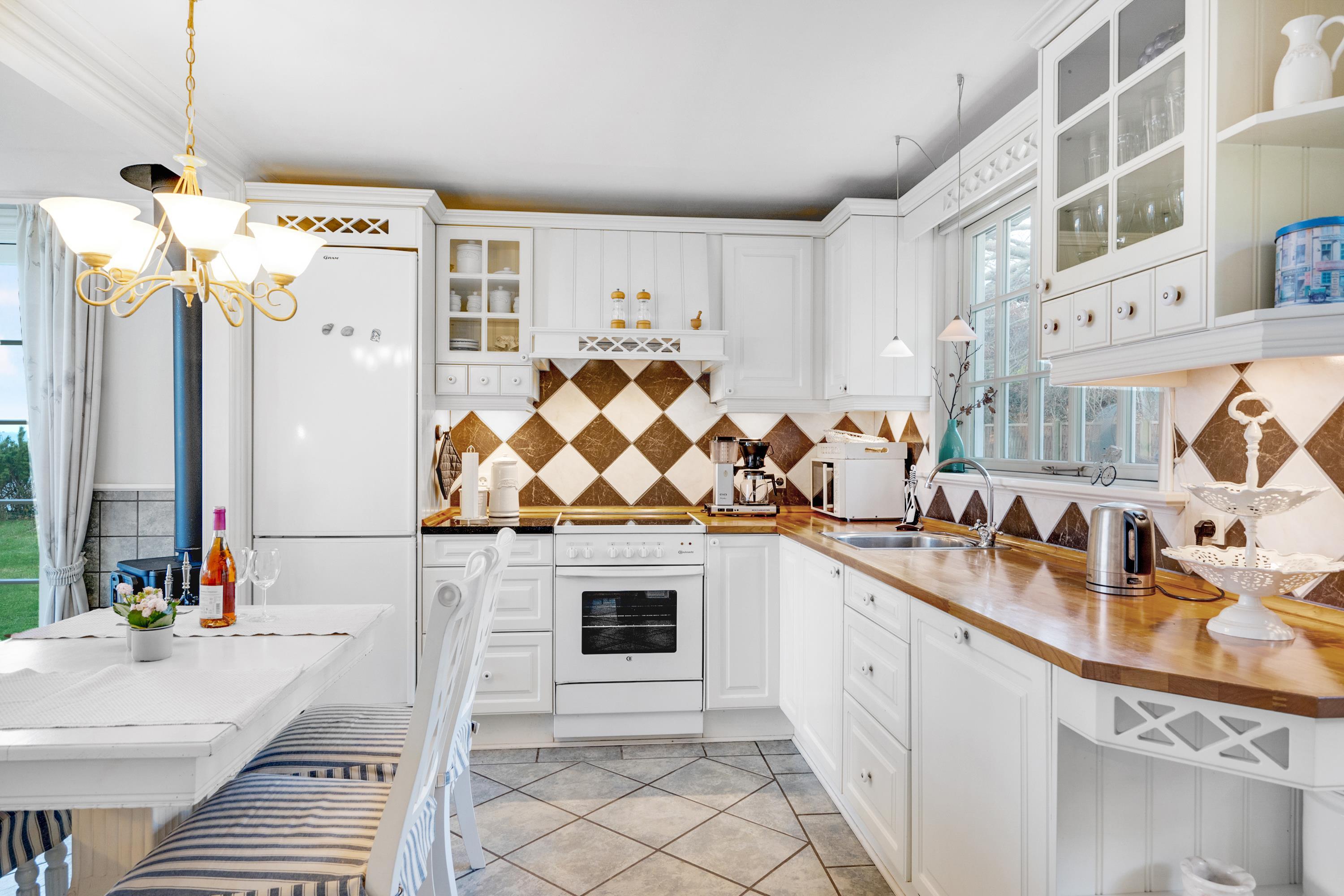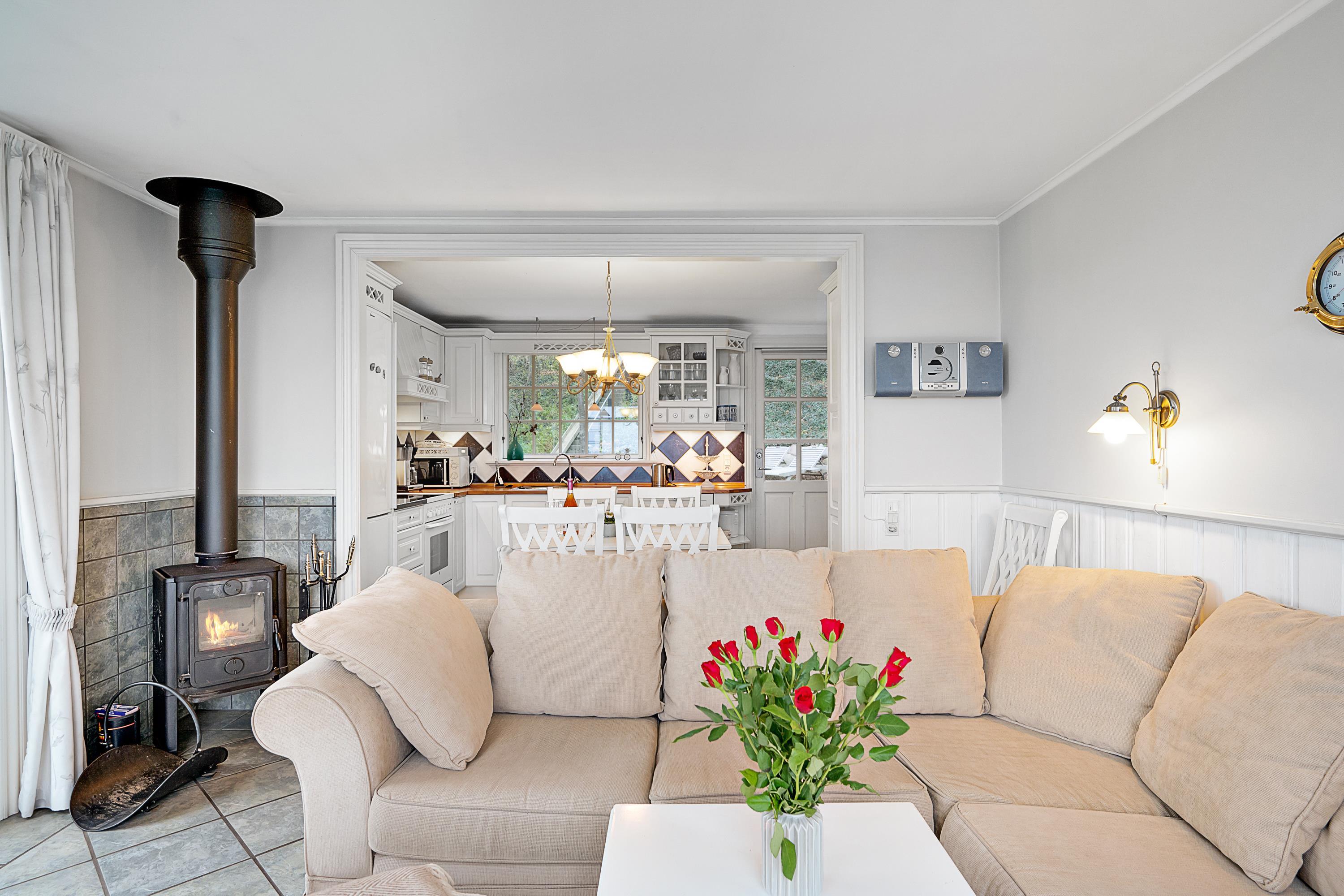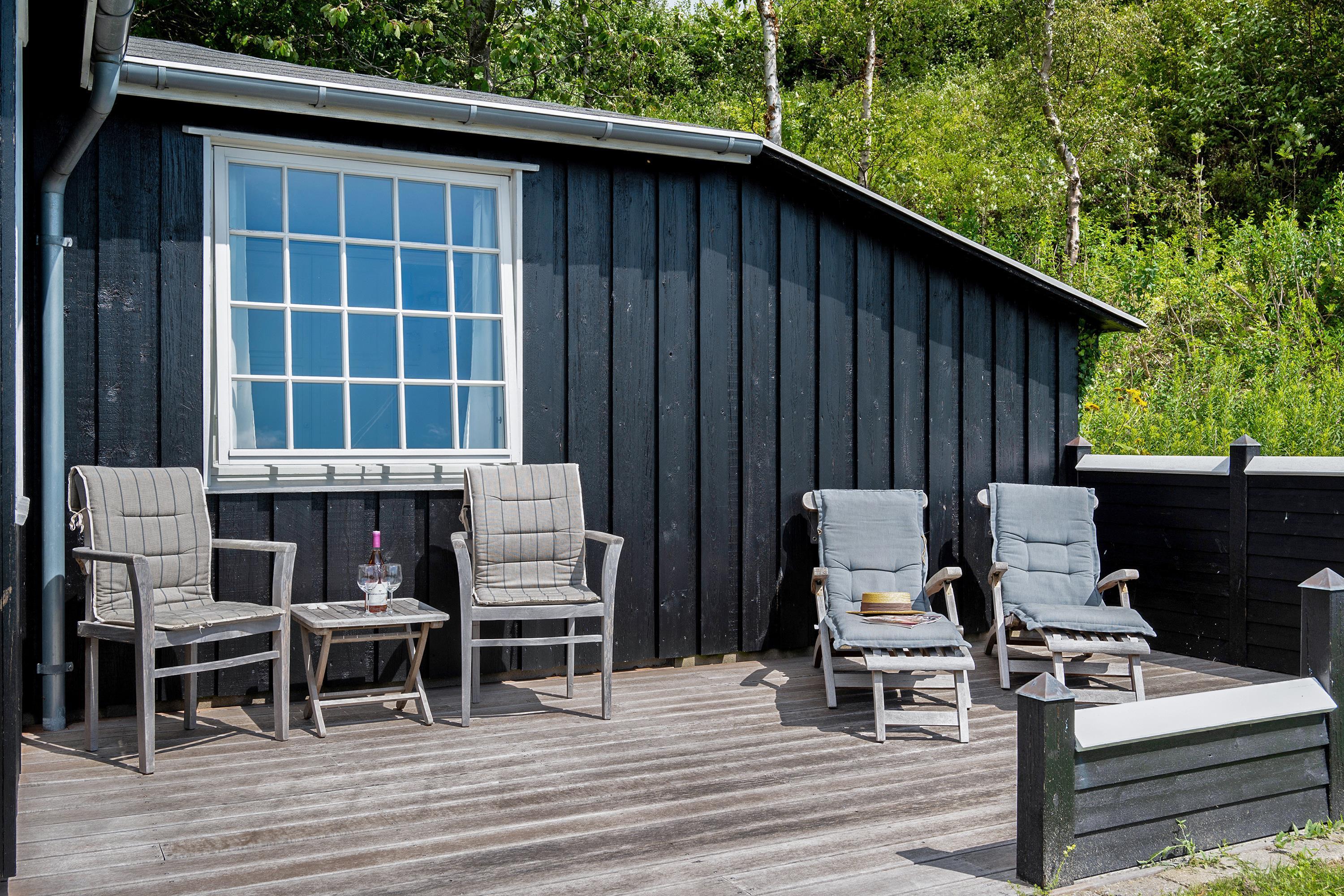The house features a truly cozy and well-furnished living room with a wood-burning stove, TV with Danish (including TV2) and German channels, as well as a DVD player and a stereo system with a CD player. From the living room, you can step out onto one of the lovely terraces with comfortable outdoor furniture. Adjacent to the living room is the delightful kitchen area, which includes a dishwasher. There is a beautiful bathroom with a shower.
