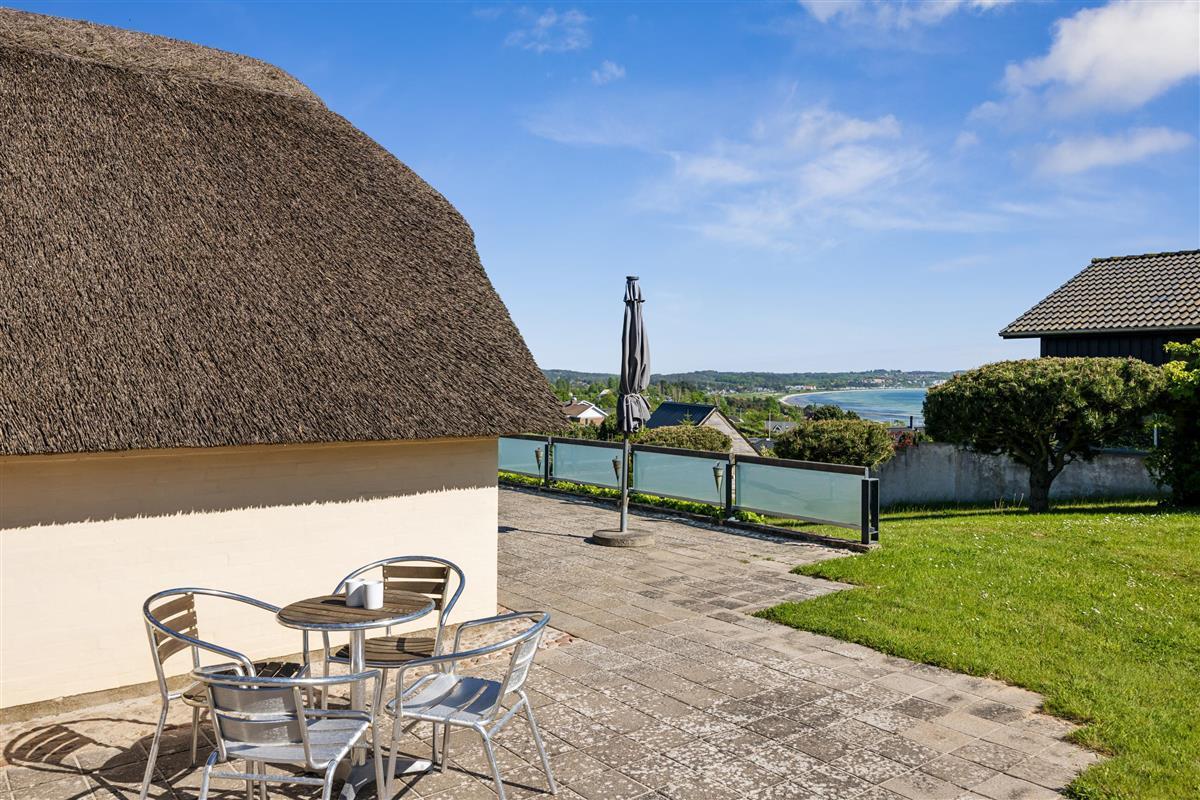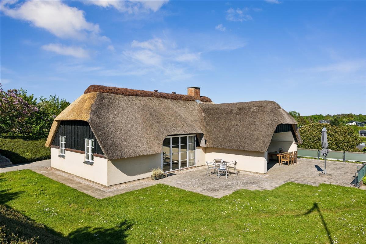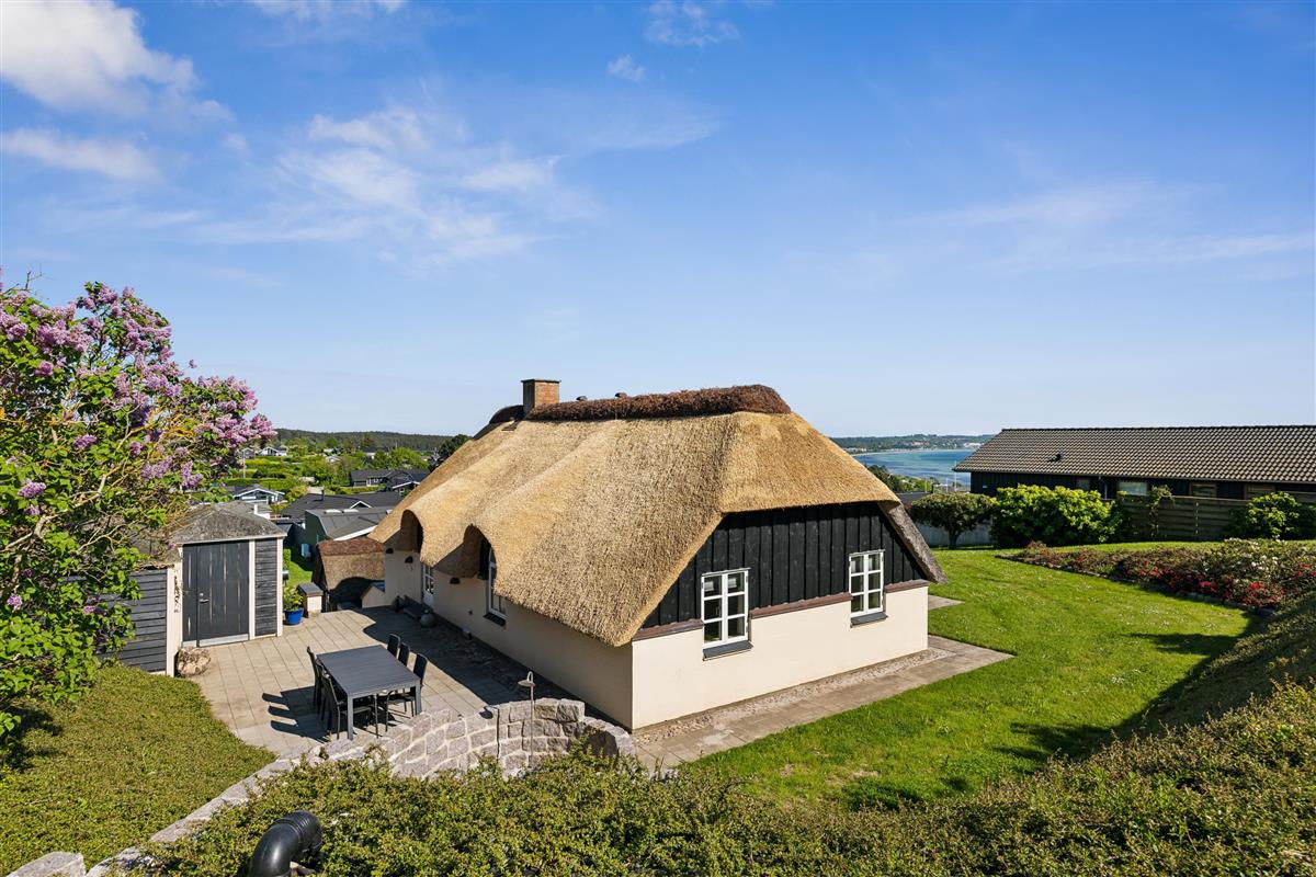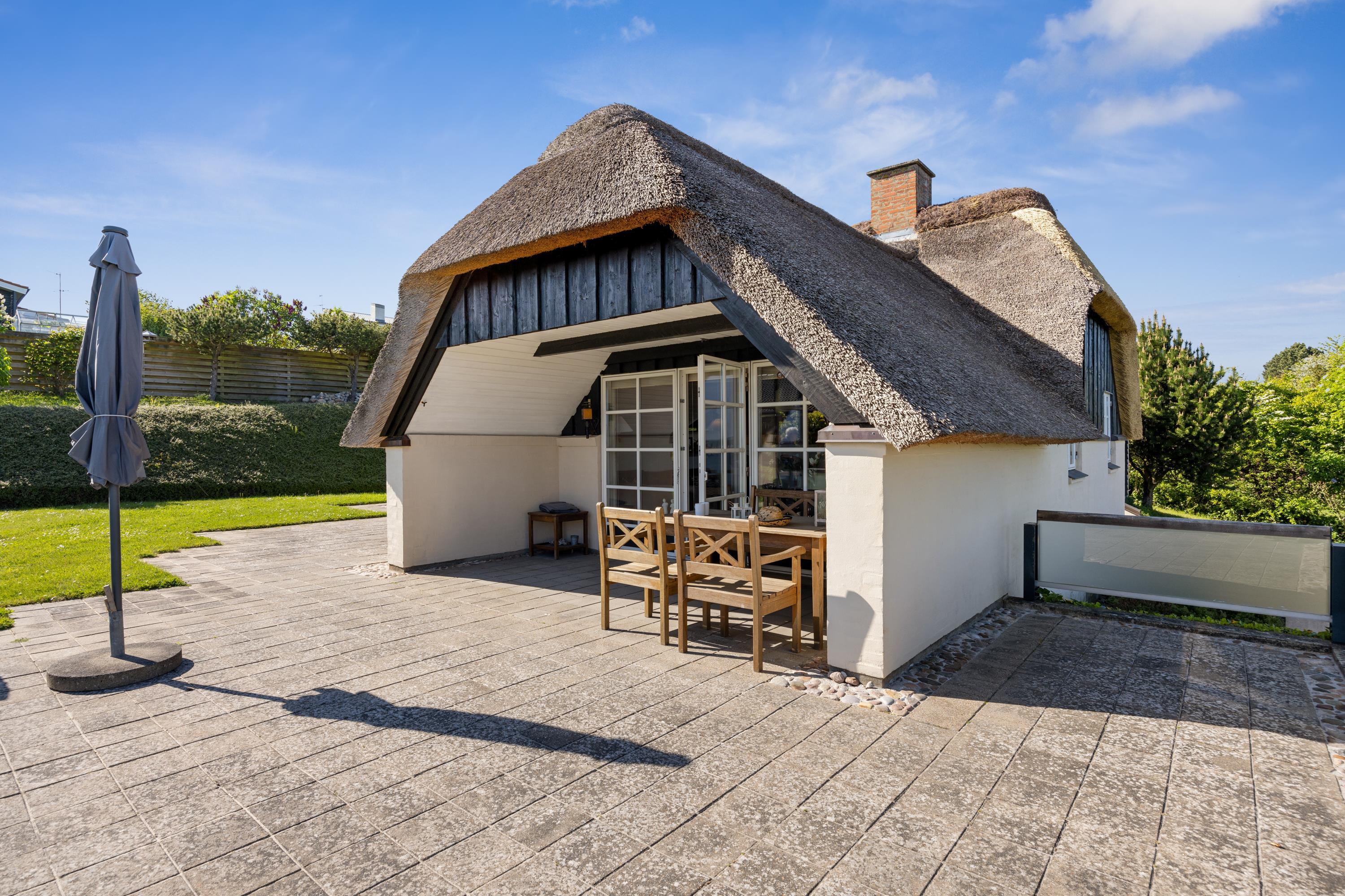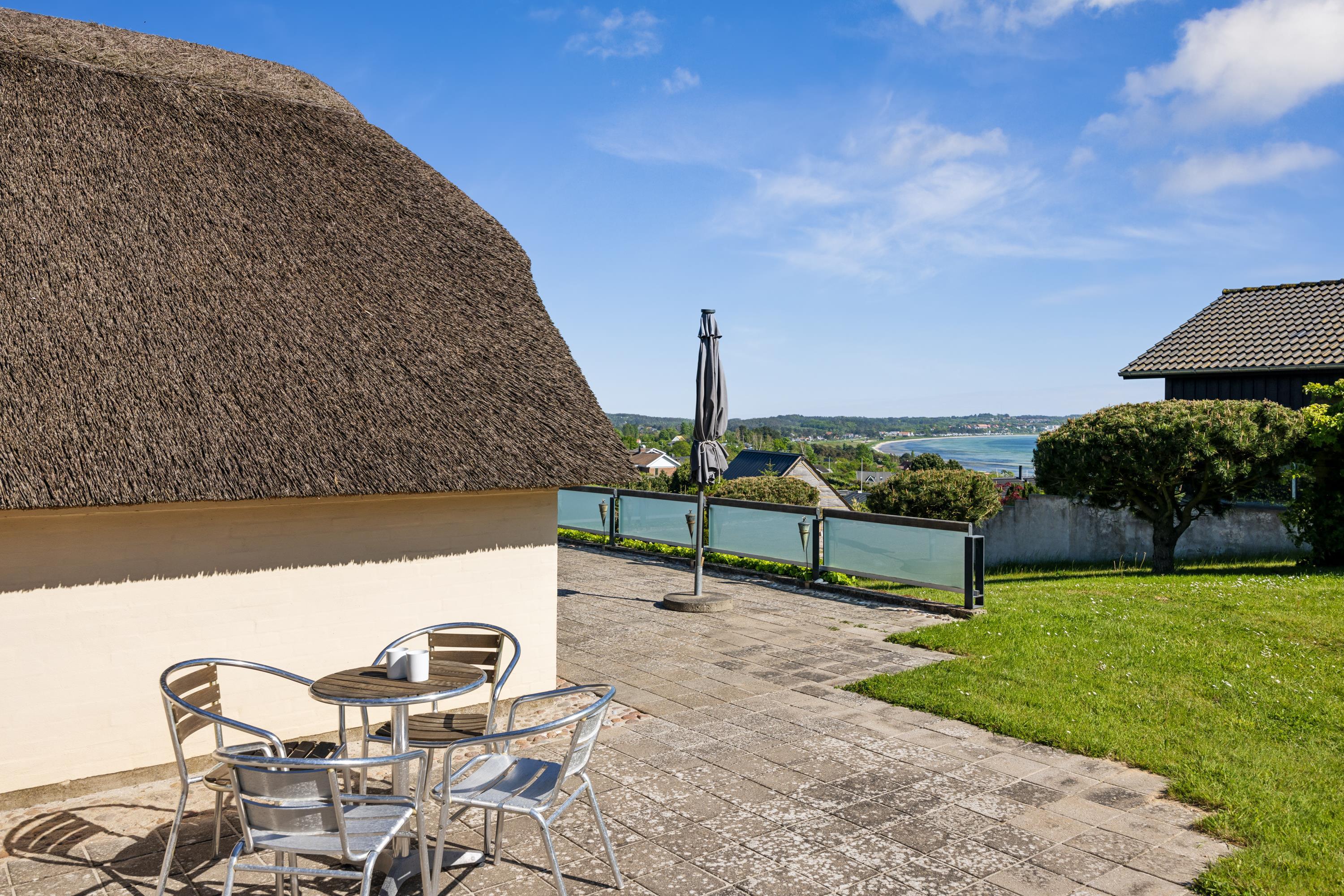 This exceptionally well-maintained holiday home is a rare gem. Here, you get 88 sqm of thatched charm, located high up with a panoramic view over Ebeltoft Bay and the hilly landscape of Egsmark Strand. The house is surrounded by lovely tiled terraces, partially covered facing south, and a secluded courtyard environment where you can enjoy the sun from morning to evening. The entire area is equipped with comfortable garden furniture, sun loungers, a barbecue, and a parasol. The house also has a carport and a lockable shed.