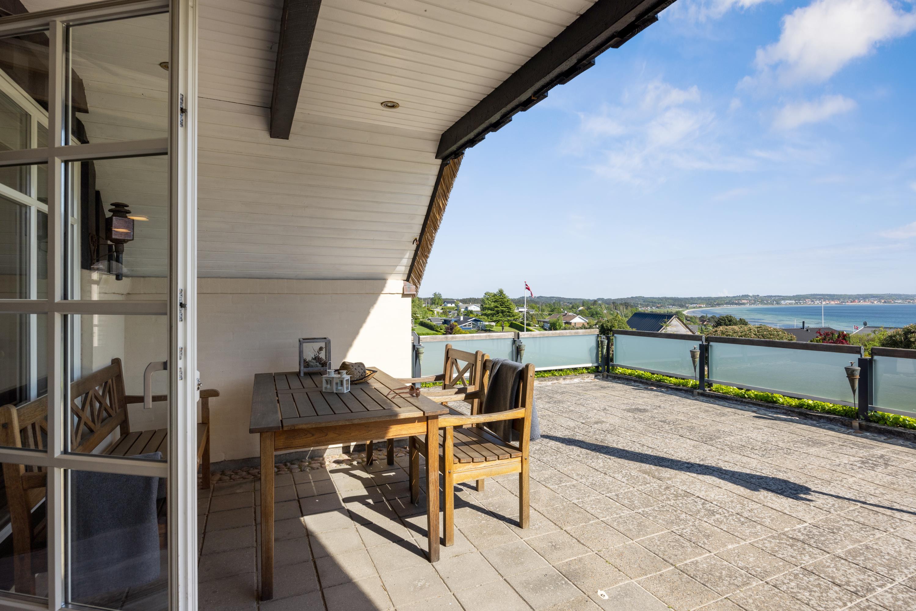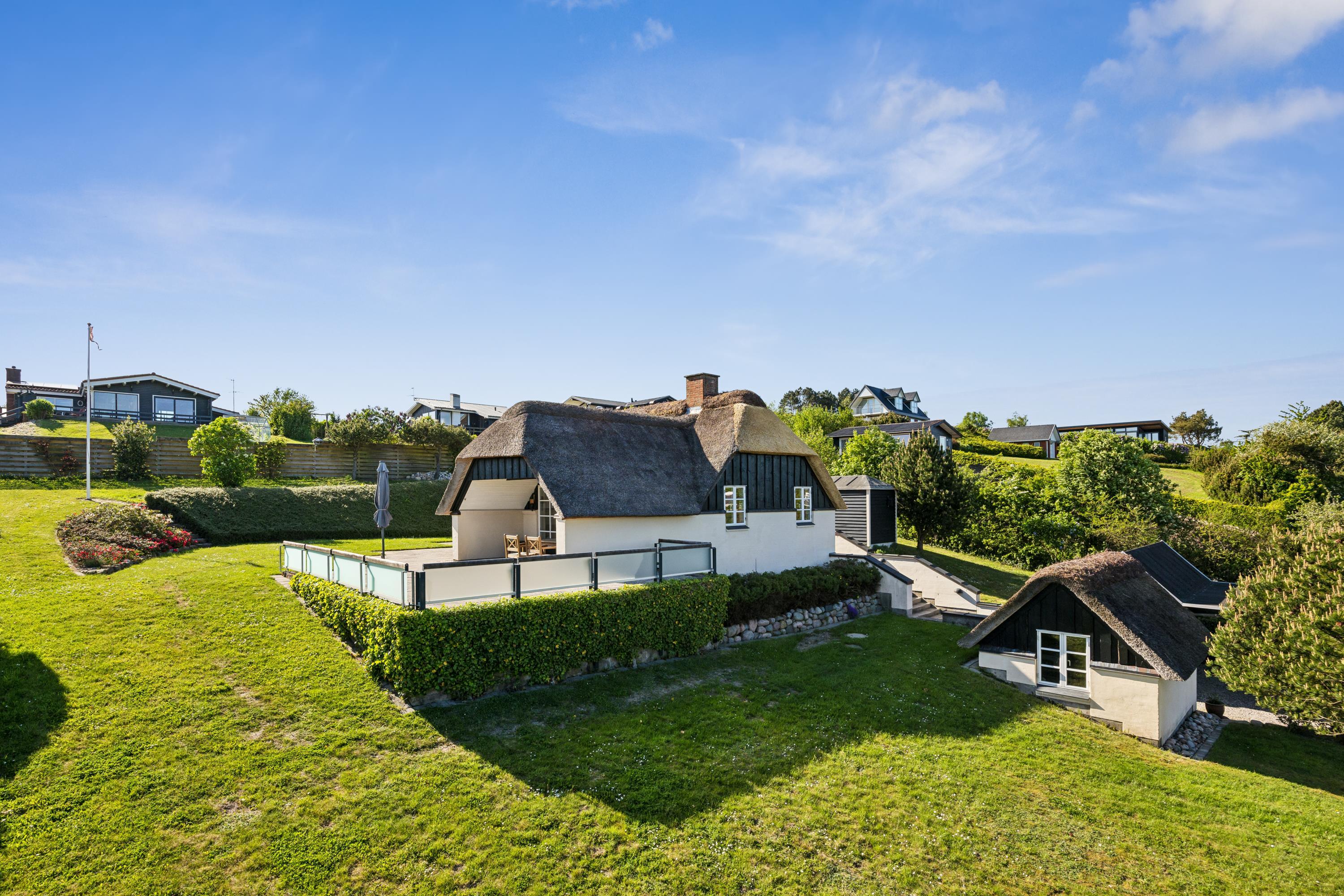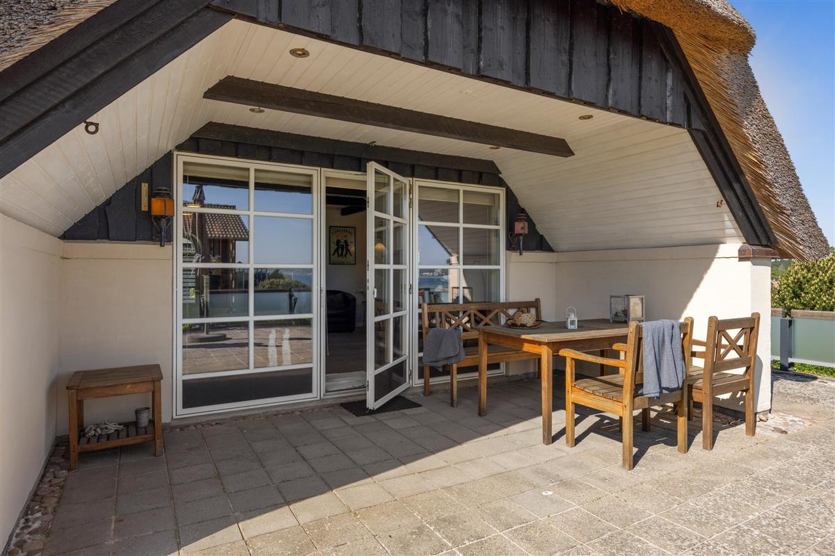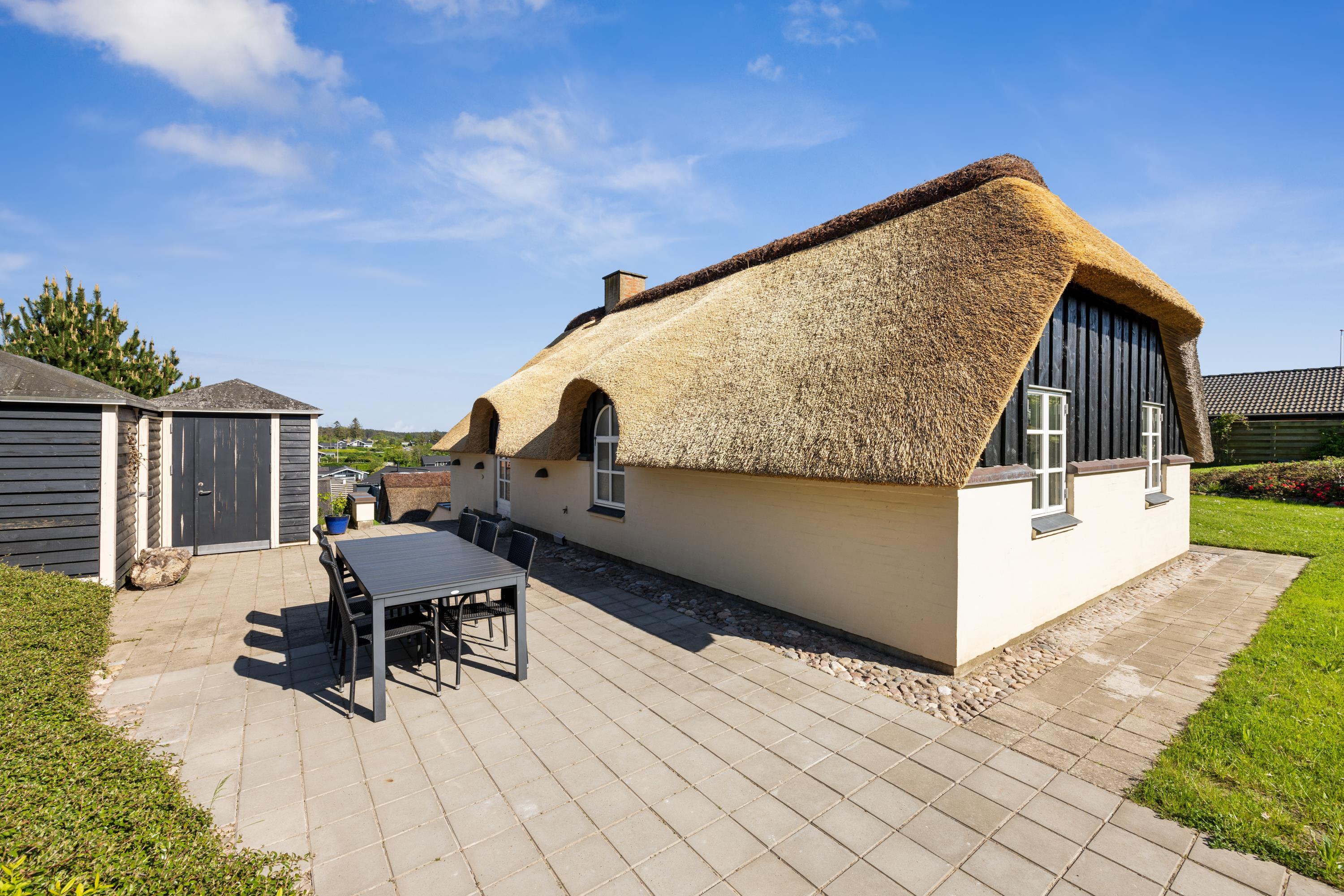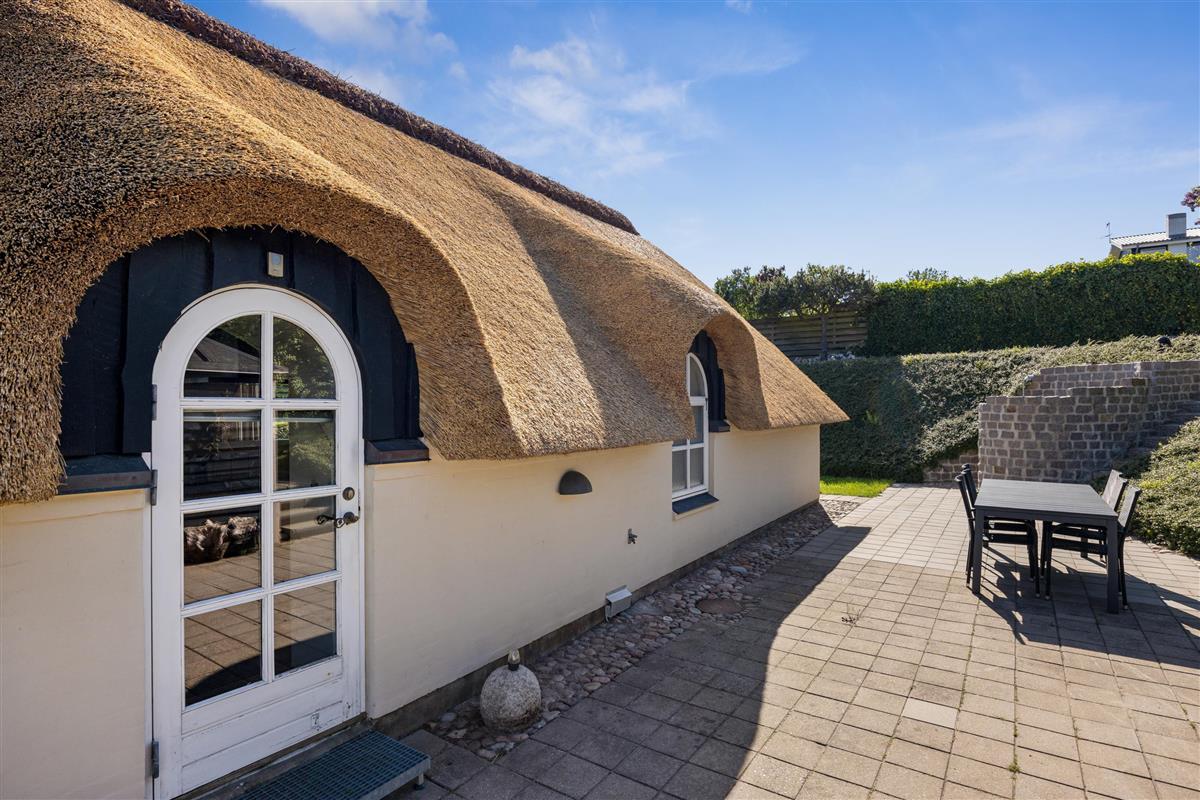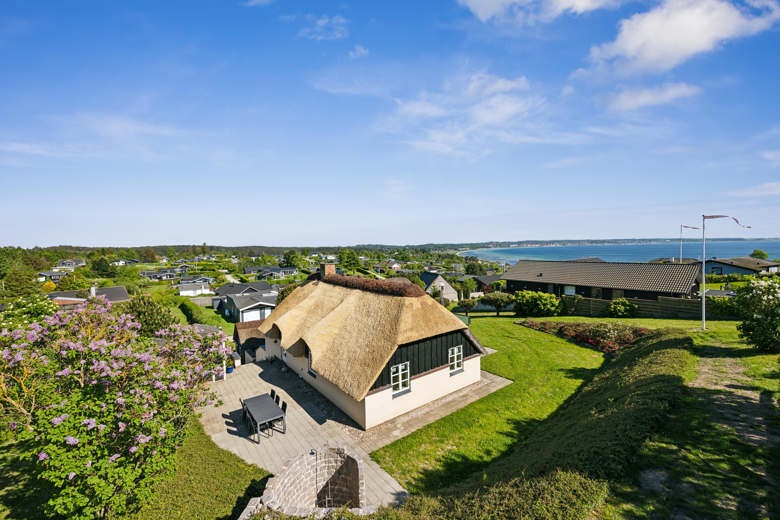 This exceptionally well-maintained holiday home is a rare gem. Here, you get 88 sqm of thatched charm, located high up with a panoramic view over Ebeltoft Bay and the hilly landscape of Egsmark Strand. The house is surrounded by lovely tiled terraces, partially covered facing south, and a secluded courtyard environment where you can enjoy the sun from morning to evening. The entire area is equipped with comfortable garden furniture, sun loungers, a barbecue, and a parasol. The house also has a carport and a lockable shed.