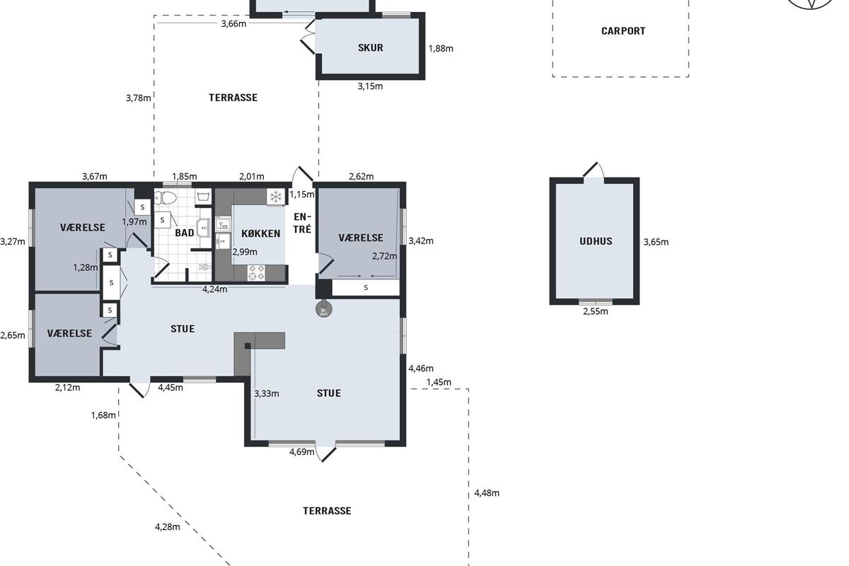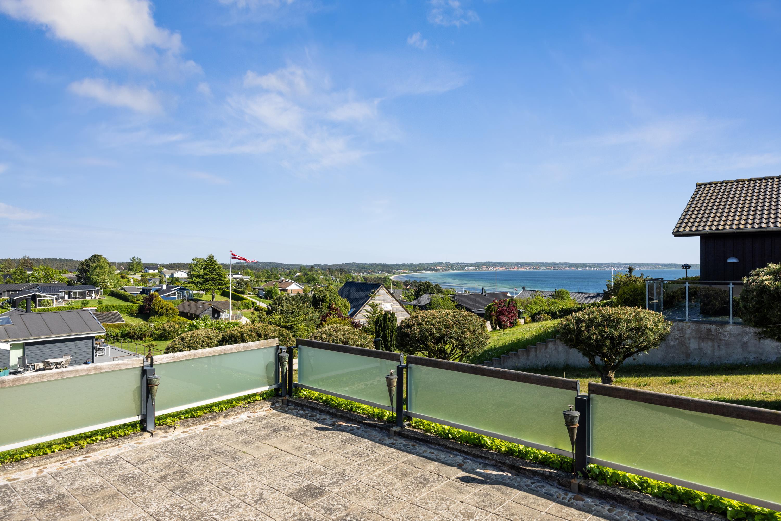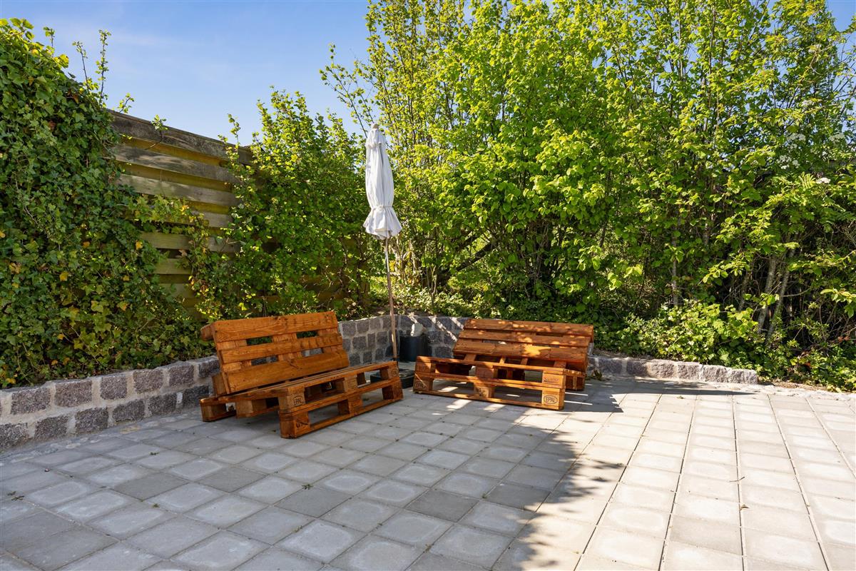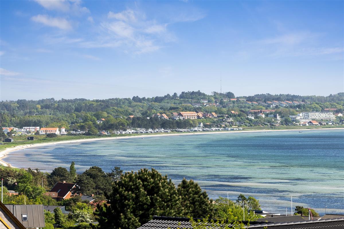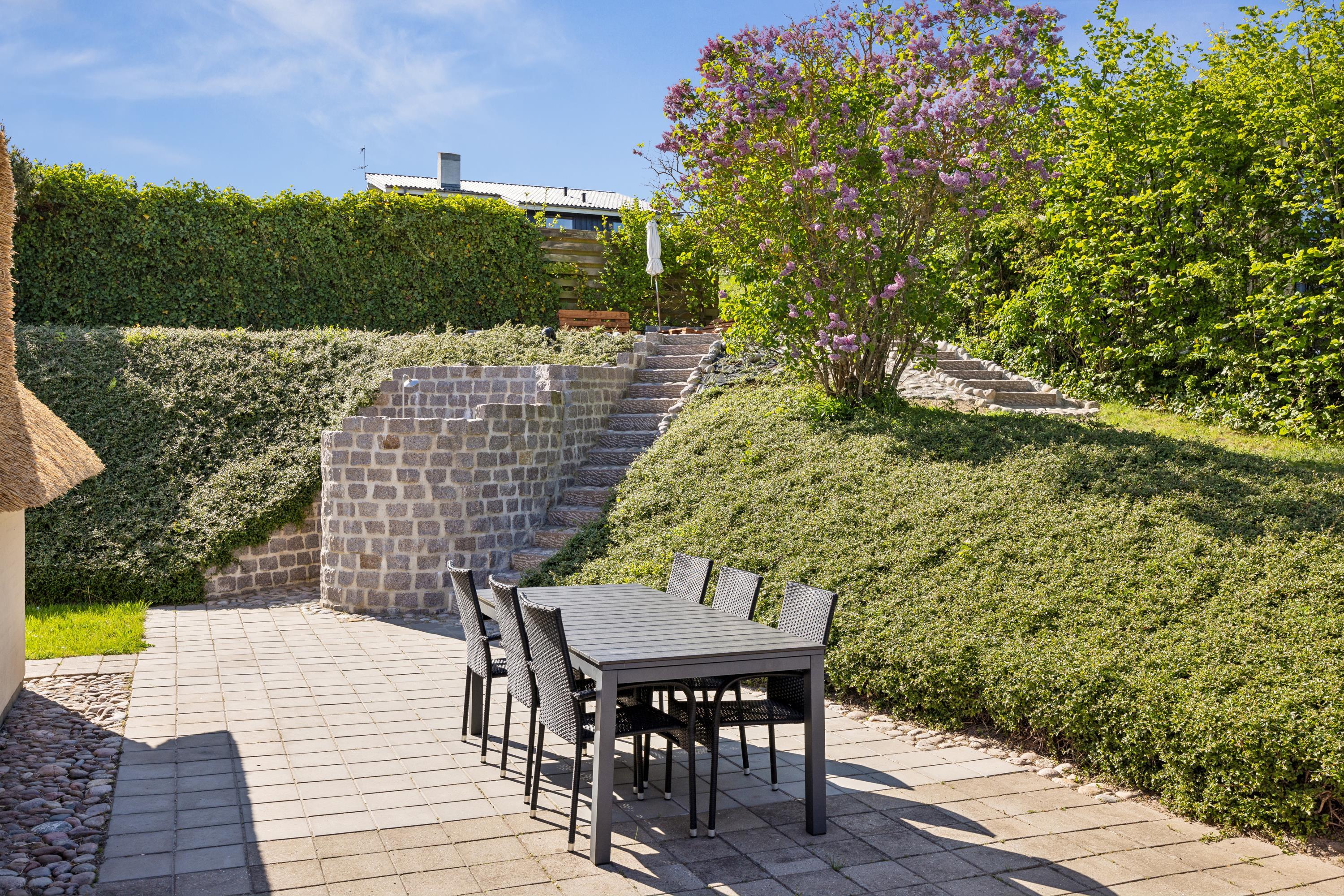 This exceptionally well-maintained holiday home is a rare gem. Here, you get 88 sqm of thatched charm, located high up with a panoramic view over Ebeltoft Bay and the hilly landscape of Egsmark Strand. The house is surrounded by lovely tiled terraces, partially covered facing south, and a secluded courtyard environment where you can enjoy the sun from morning to evening. The entire area is equipped with comfortable garden furniture, sun loungers, a barbecue, and a parasol. The house also has a carport and a lockable shed.
