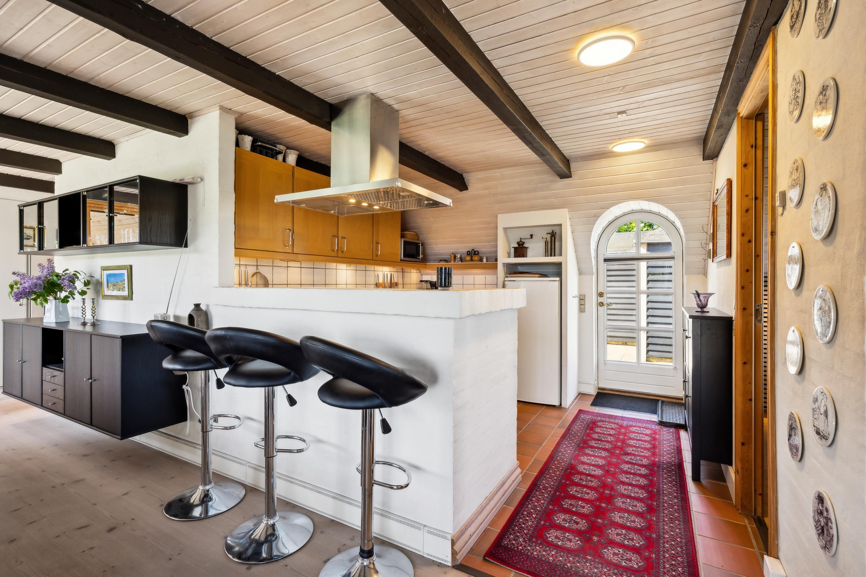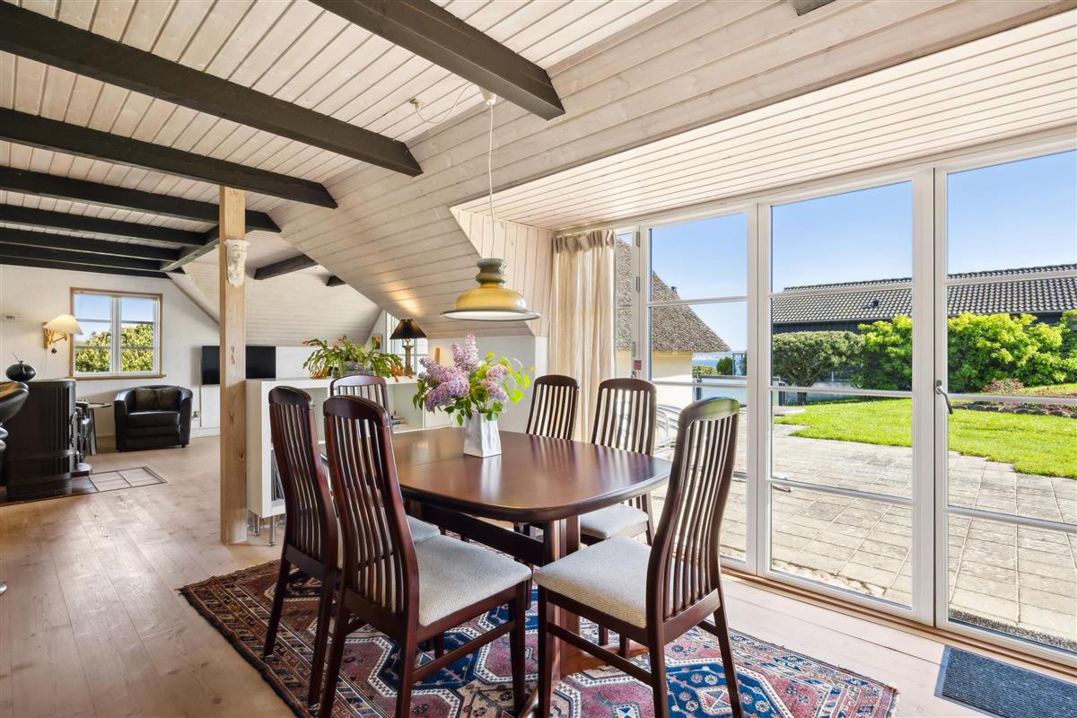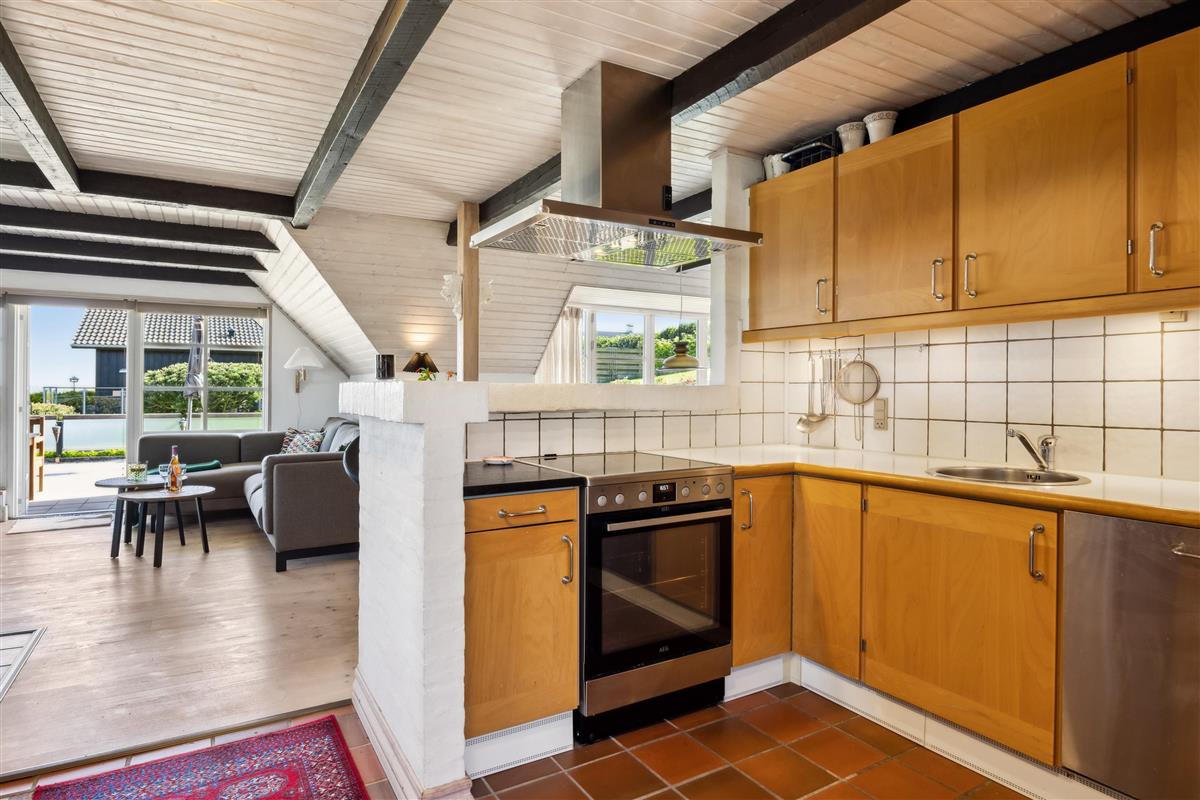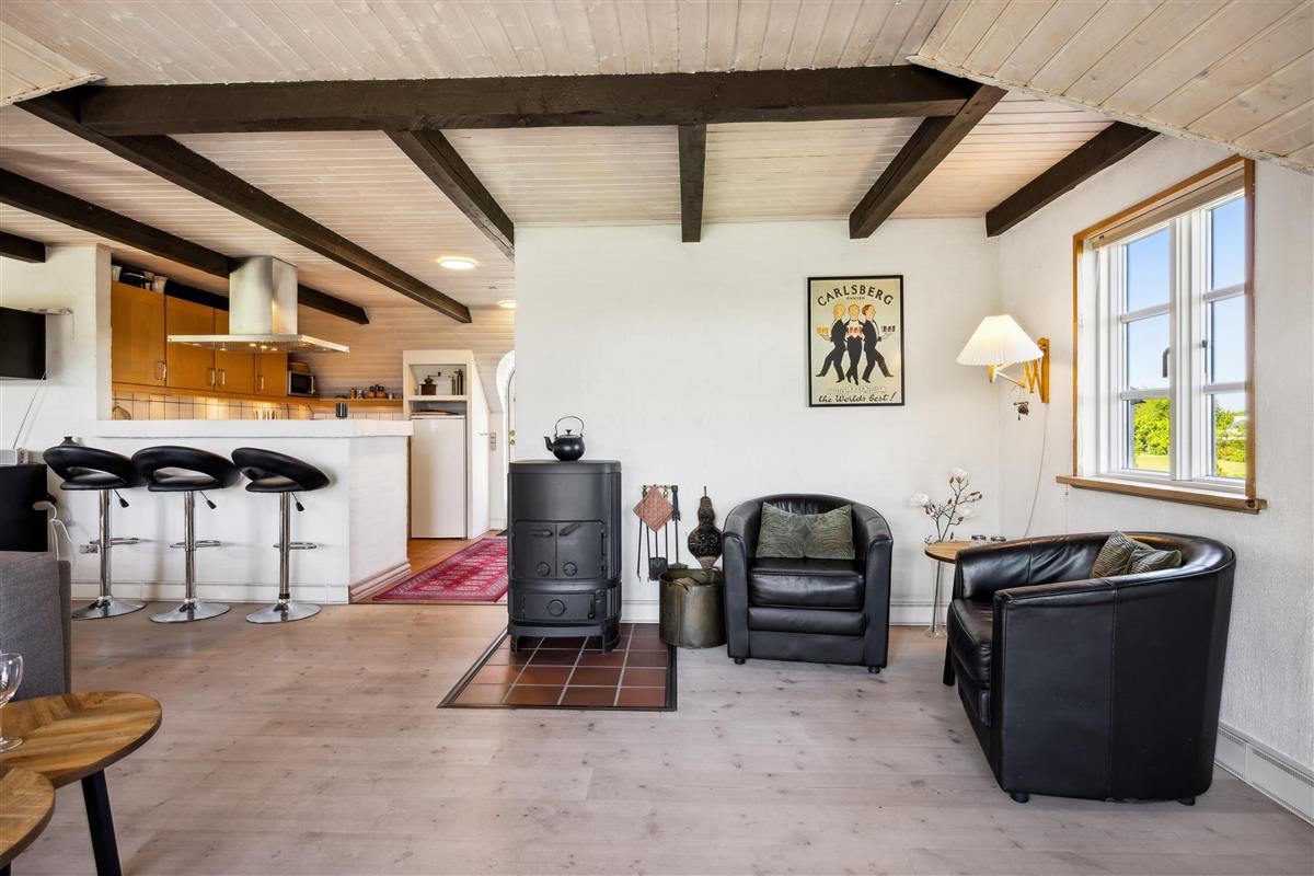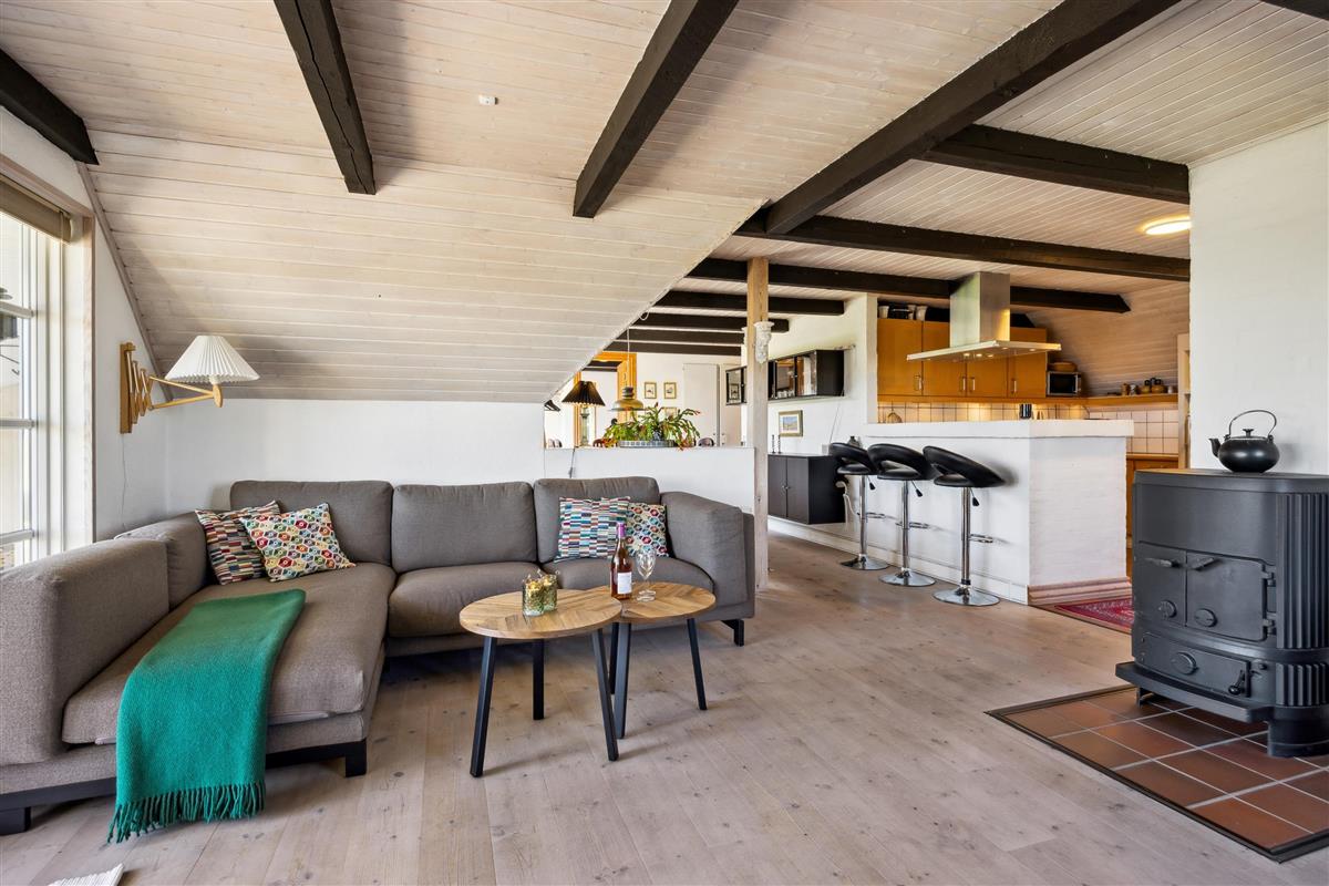 A large, well-appointed, and cozy living room features exposed ceiling beams, beautiful wooden floors, and access to the terrace. The living room includes a spacious sofa set, a wood-burning stove, a TV with Danish (including TV2) and German channels, as well as a radio. Adjacent to the living room is the dining area, which seats 6 and also has access to the view terrace. The well-equipped kitchen, with ample counter space, is in an open connection with the living room and has a stove with ceramic hobs and an oven, a fridge/freezer, and a dishwasher.