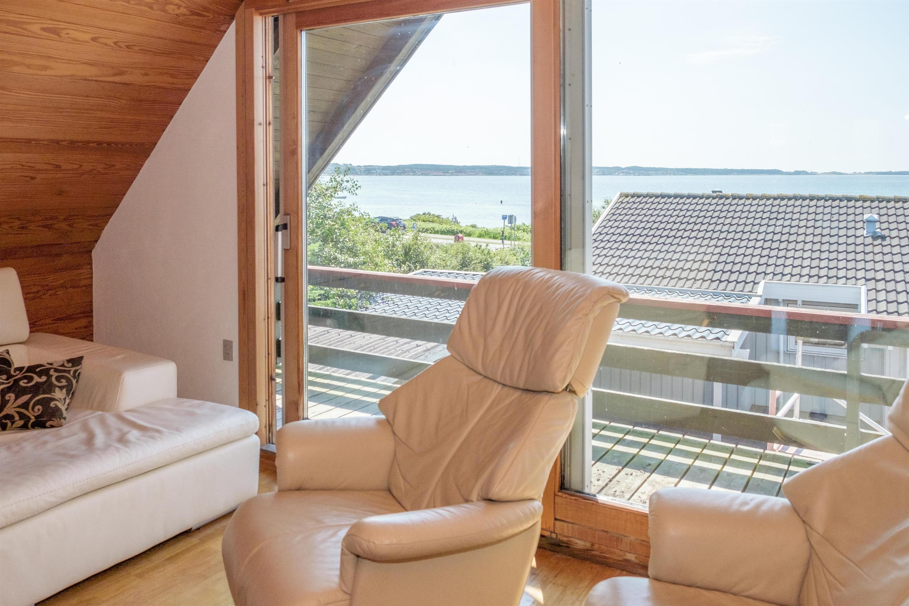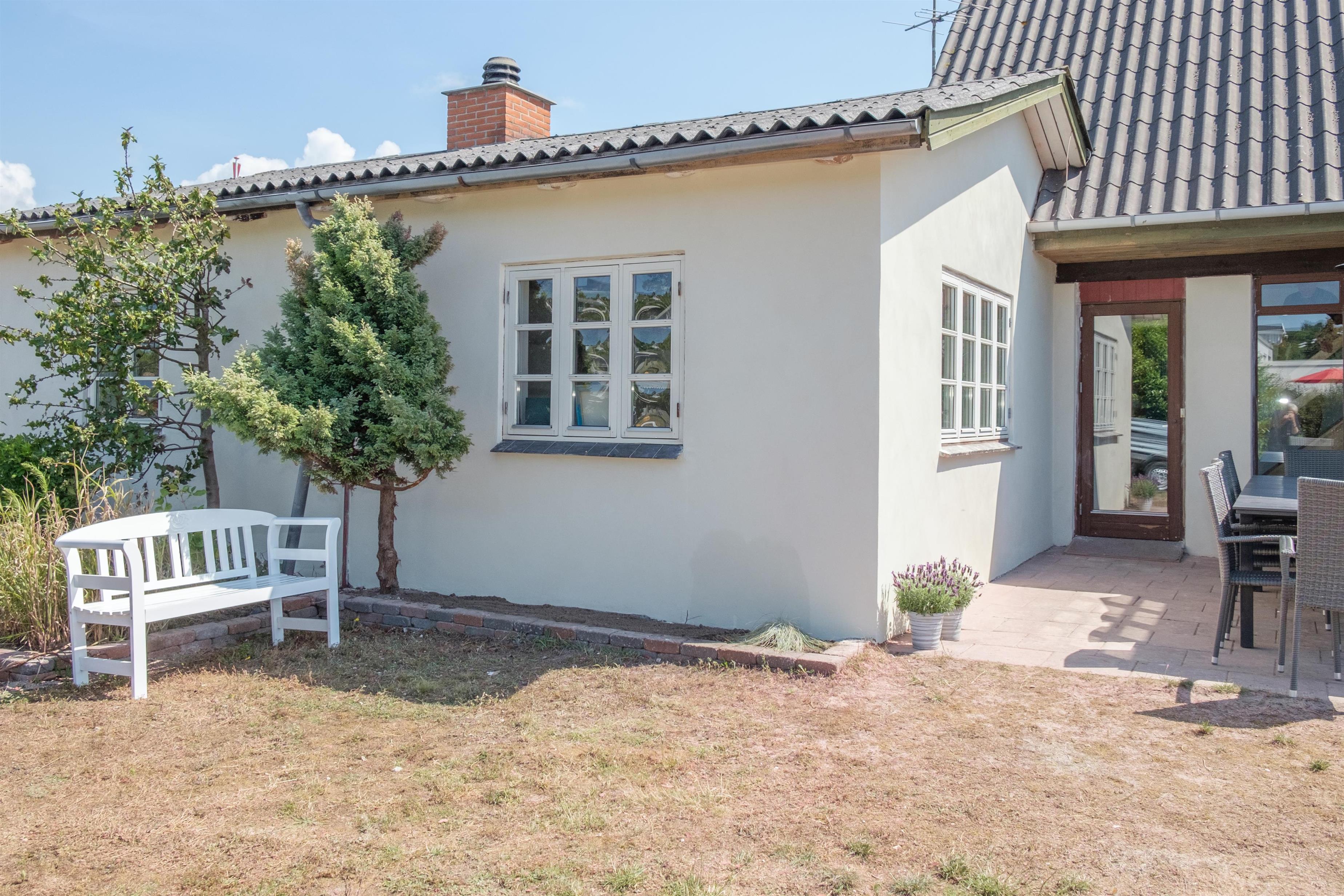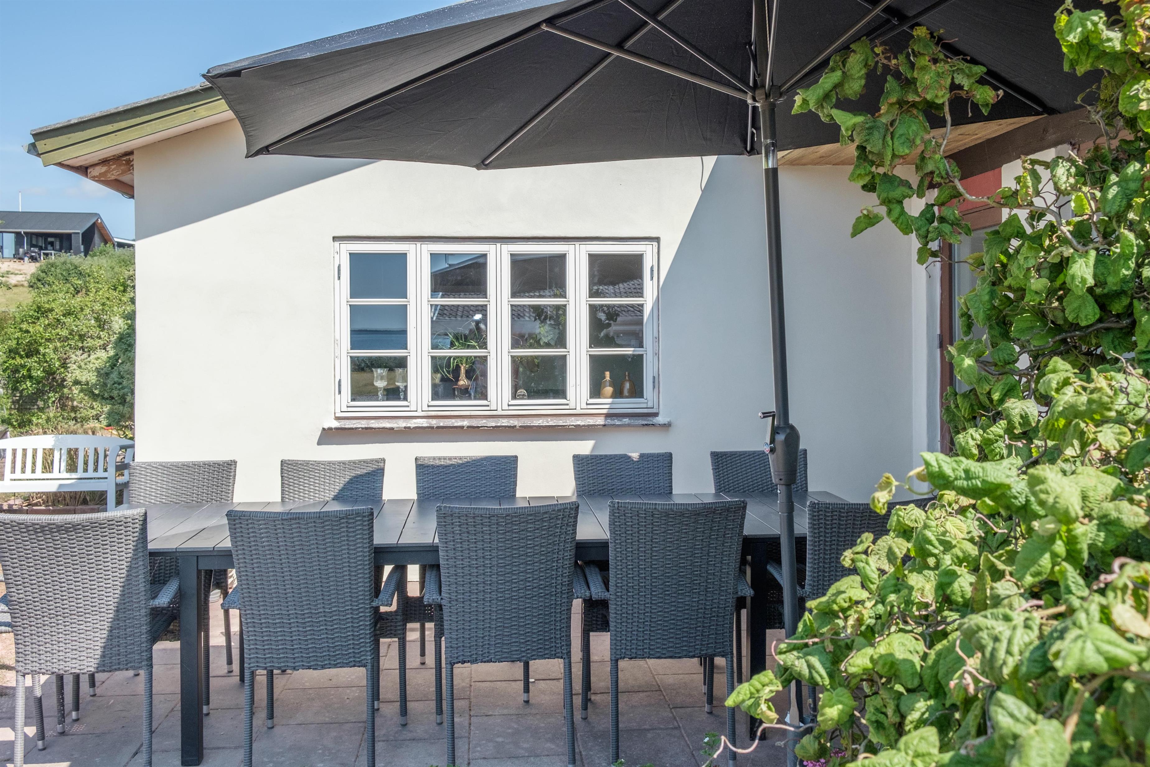 An older, newly renovated holiday home with a panoramic view over Ebeltoft Bay, located just 100 meters from the child-friendly sandy beach at Egsmark Strand. A truly spacious and well-appointed house on a secluded plot, featuring a cozy garden house and a tiled terrace with a sea view. Additionally, there is a viewing balcony accessible from the living room on the first floor. The property is equipped with good garden furniture, sun loungers, a parasol, and a barbecue.