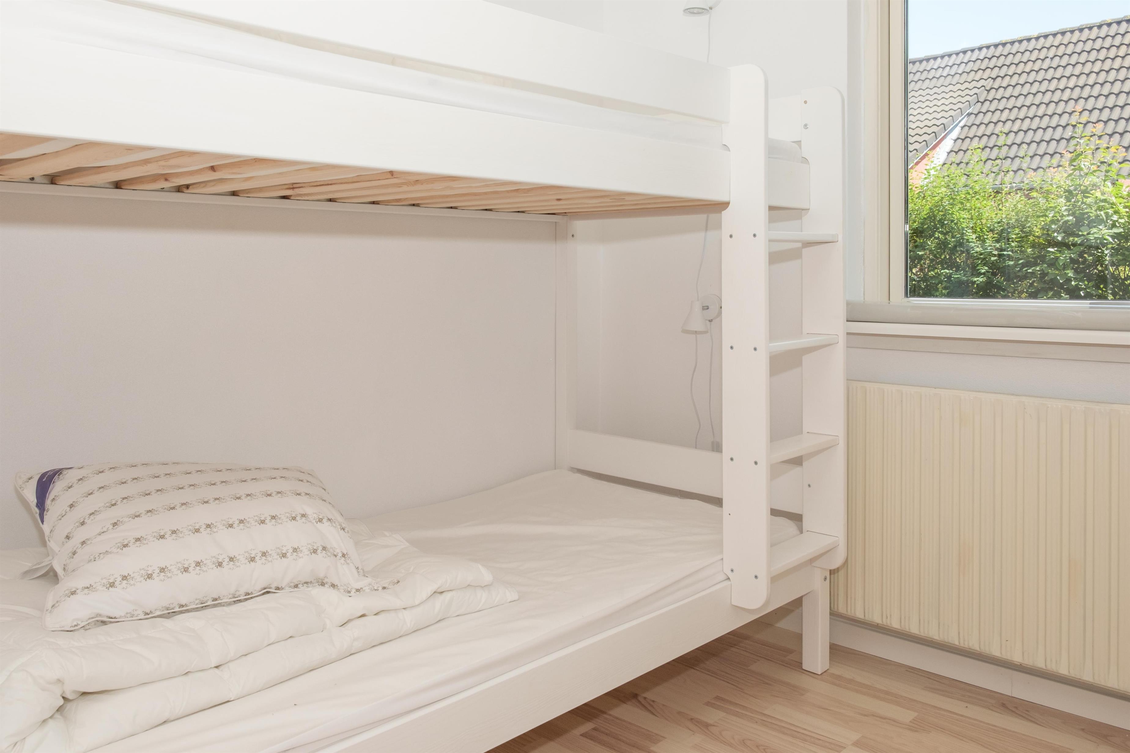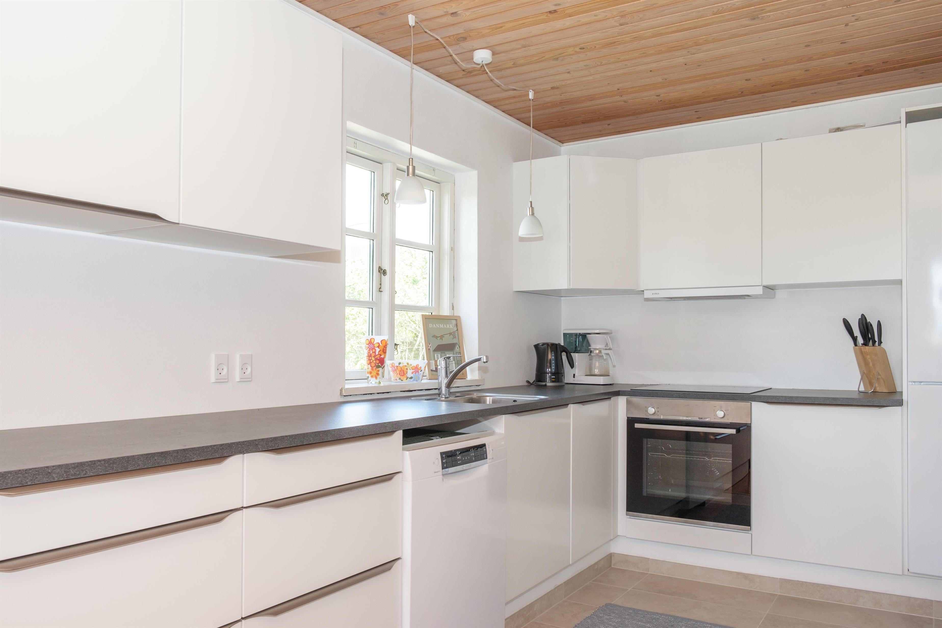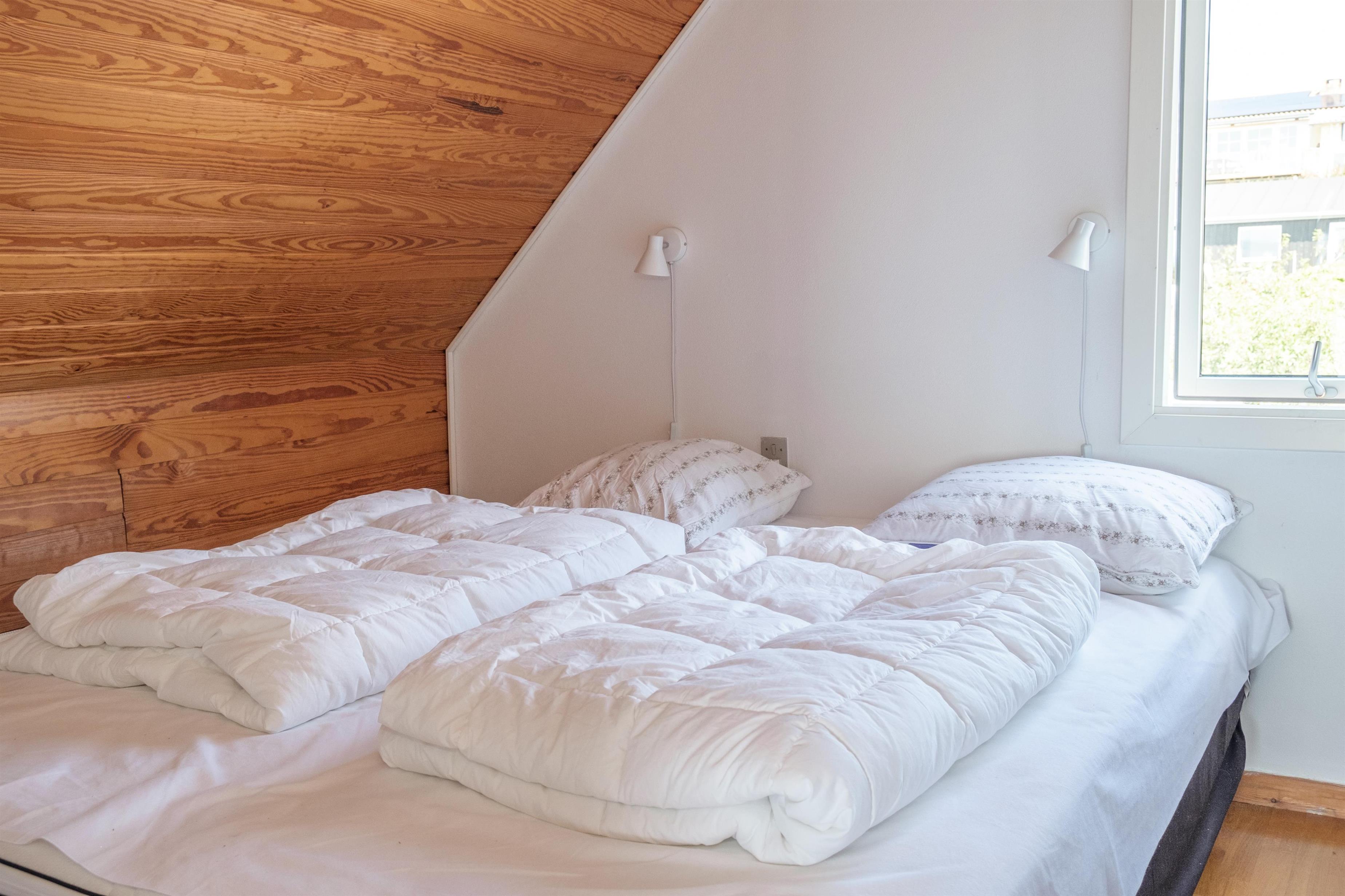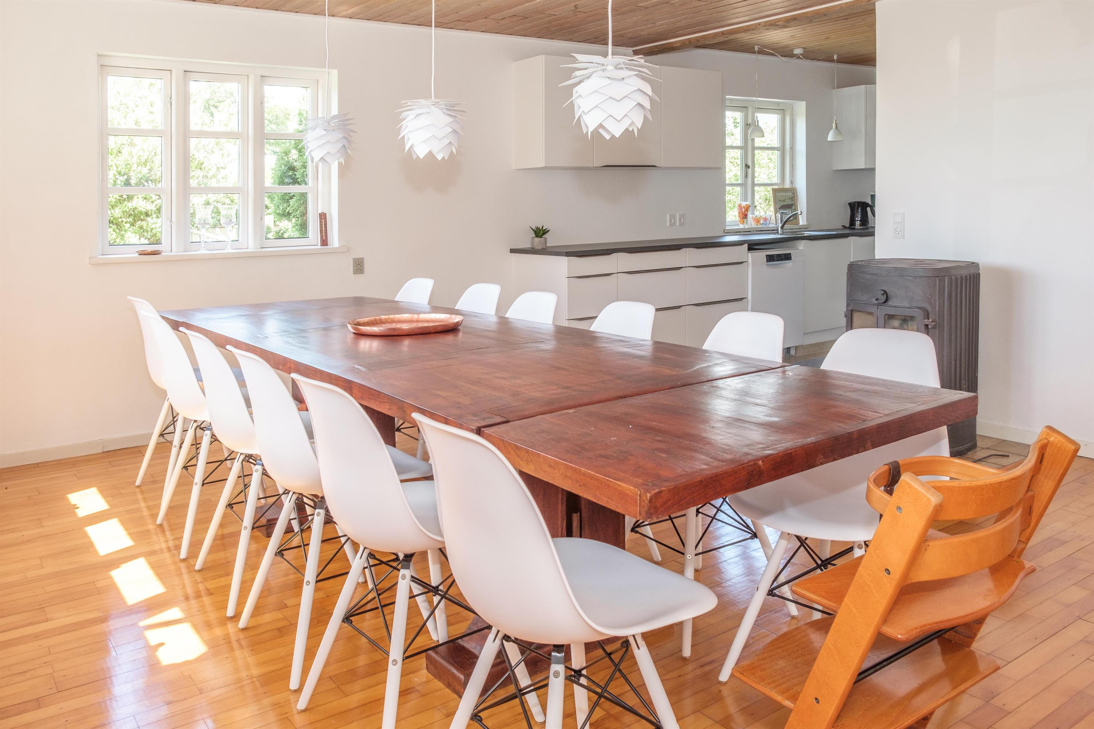From the spacious entrance, you enter the large kitchen/dining area with a wood-burning stove and a dining table for 12 around the long wooden table. A high chair is available for the smallest. The new, beautiful kitchen is equipped with ceramic stovetops, an oven, a fridge/freezer, a dishwasher, and a microwave. On the first floor, there is a cozy, well-furnished living room with access to a small covered viewing balcony and a TV with Danish (including TV2) and German channels, as well as a radio. The house has a total of 12 sleeping spaces, which are divided into 2 large bedrooms with double beds, and 1 room with 2 bunk beds on the ground floor, as well as 2 bedrooms with double beds on the first floor. On the ground floor, there is a lovely new bathroom with a shower, a washing machine, and a dryer, as well as the most charming, original 60s bathroom with light blue tiles and a bathtub. Underfloor heating is available in both bathrooms. Internet access is provided.