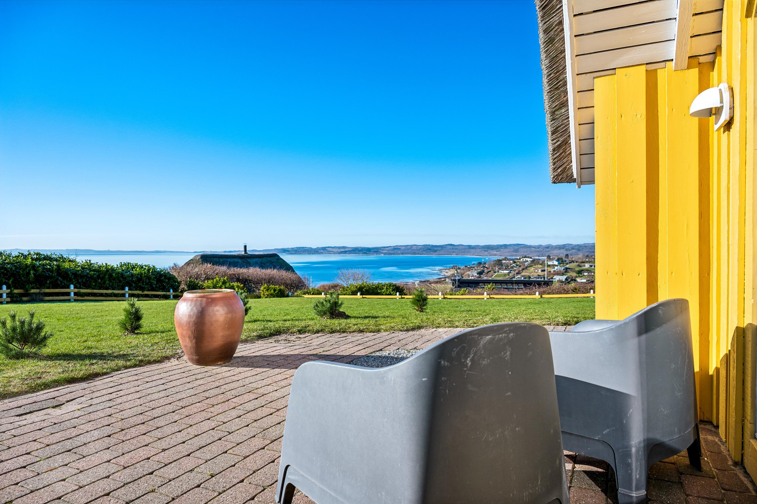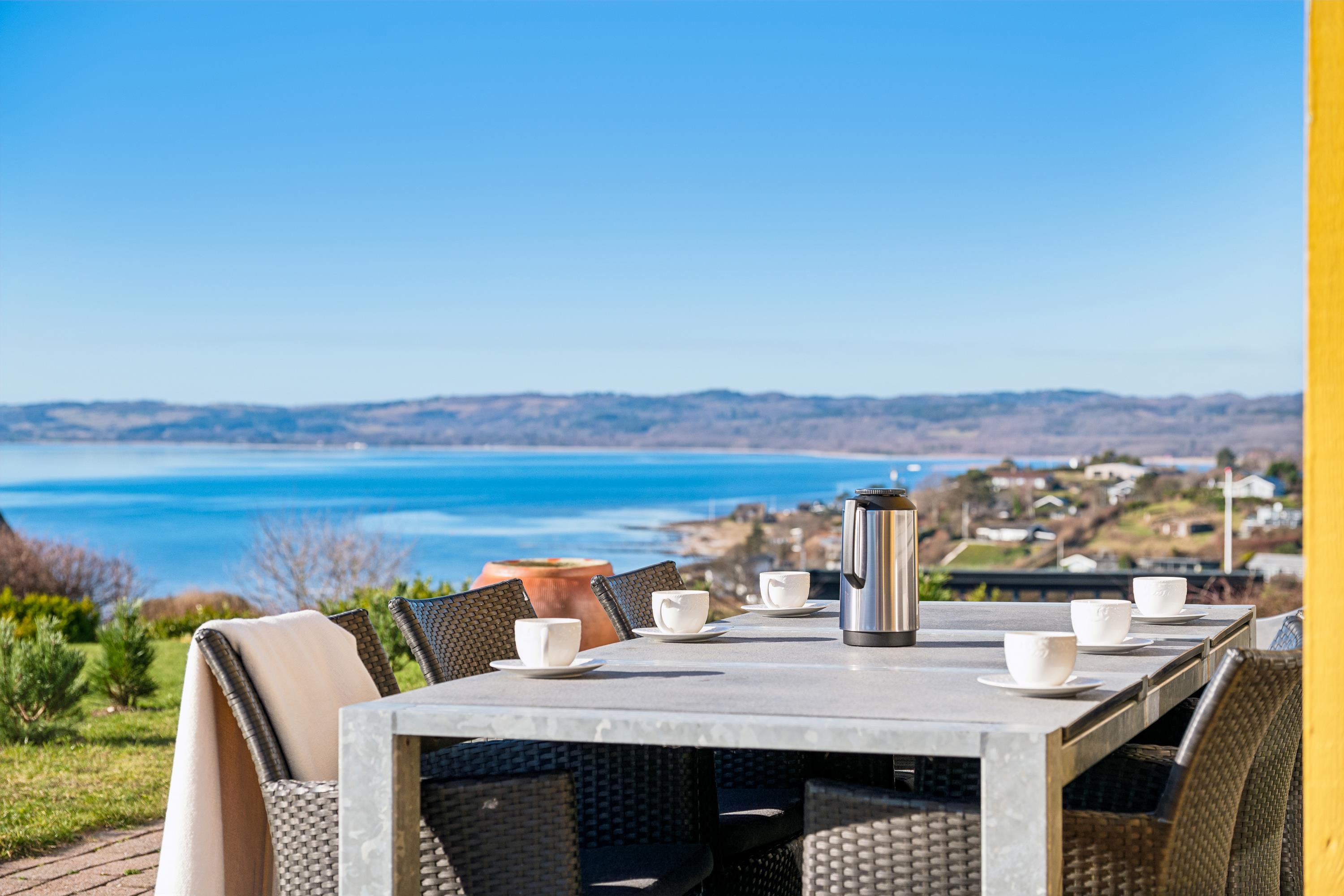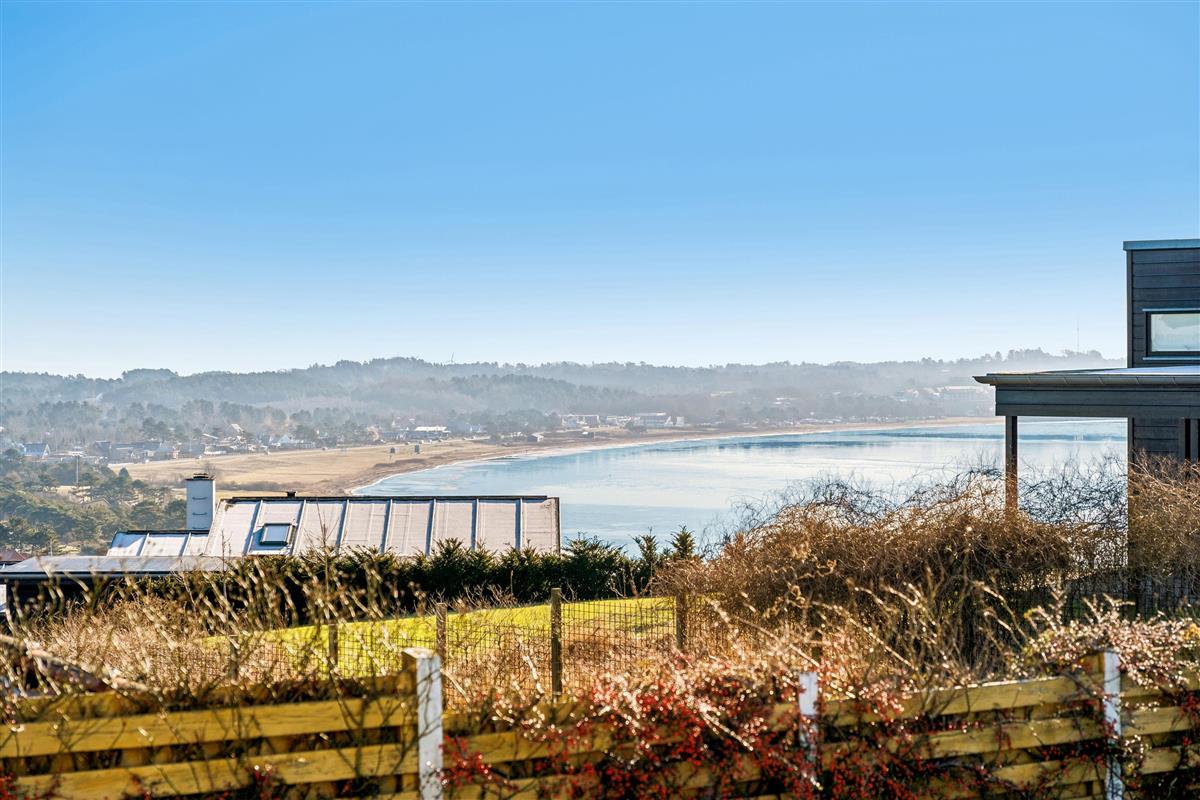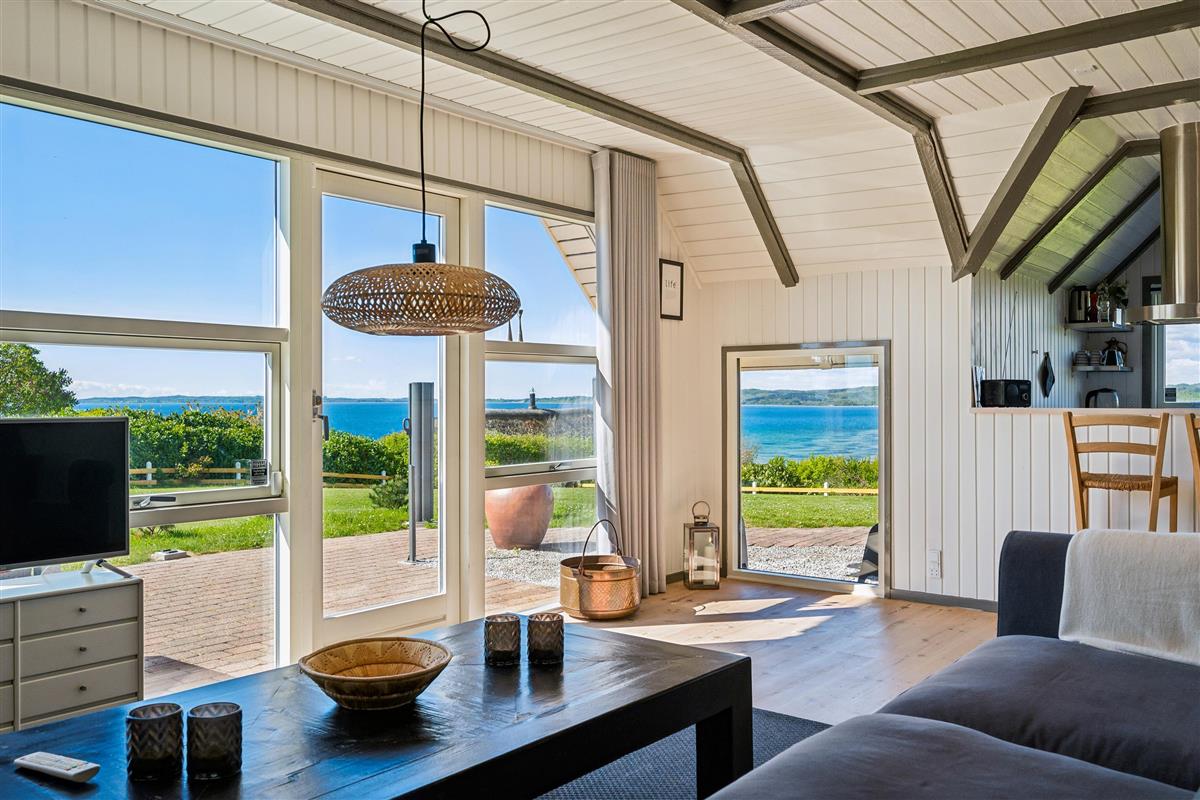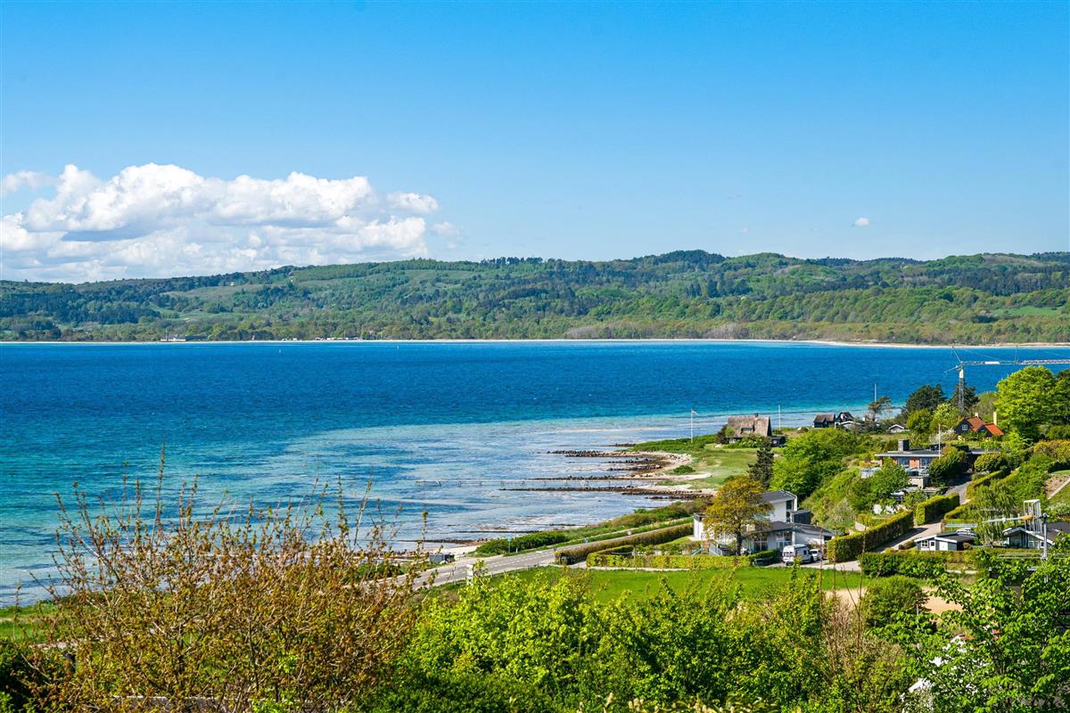 Welcome to this beautifully elevated holiday home at Egsmark Strand, offering one of the most stunning panoramic views in the area. Here, you will find an inviting living room, furnished with quality furniture and direct access to a fantastic terrace with comfortable outdoor seating. Adjacent to the living room is the kitchen, which includes a dishwasher, as well as a lovely and well-furnished dining area. The modern bathroom features a shower, underfloor heating, and access to a washing machine and dryer.