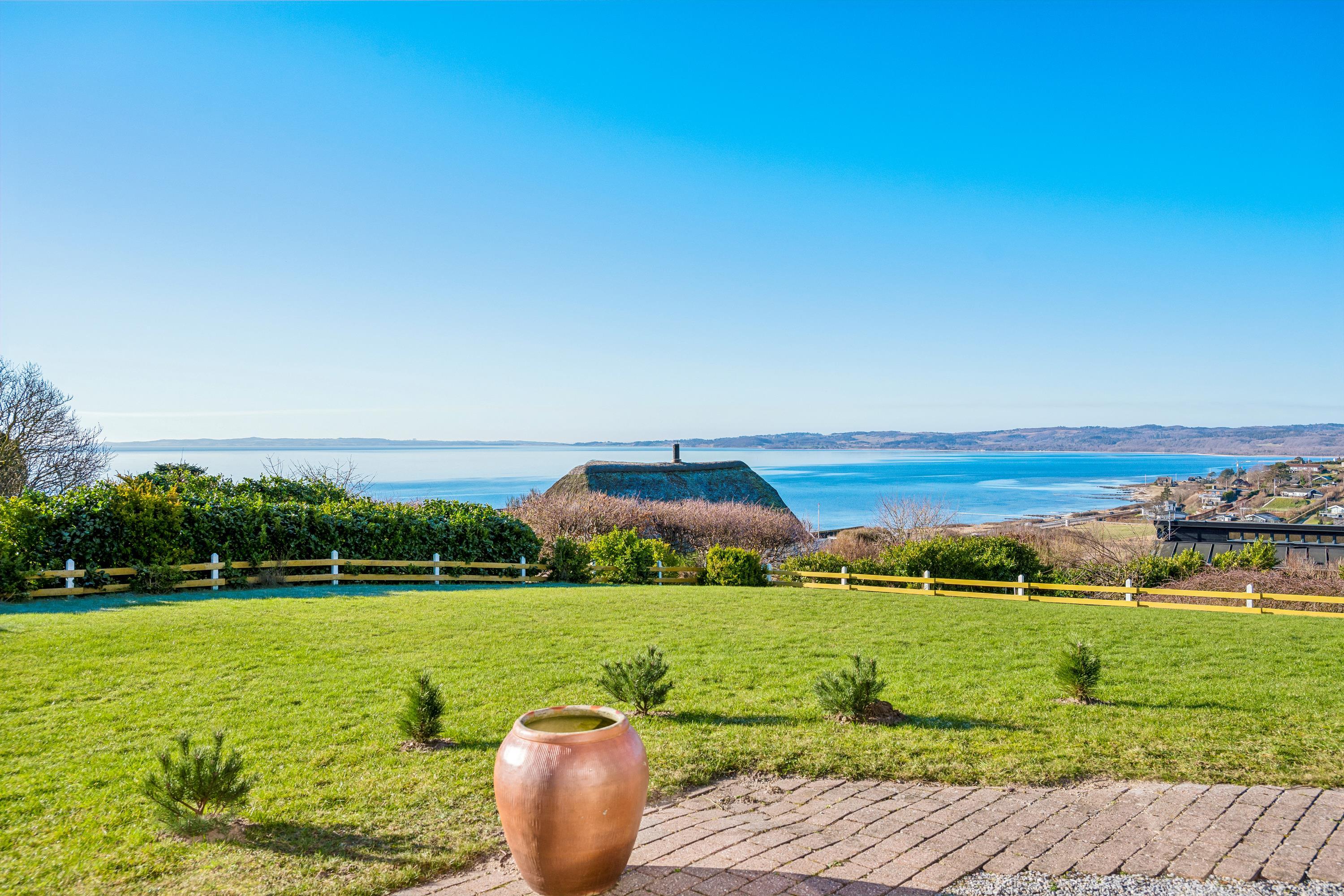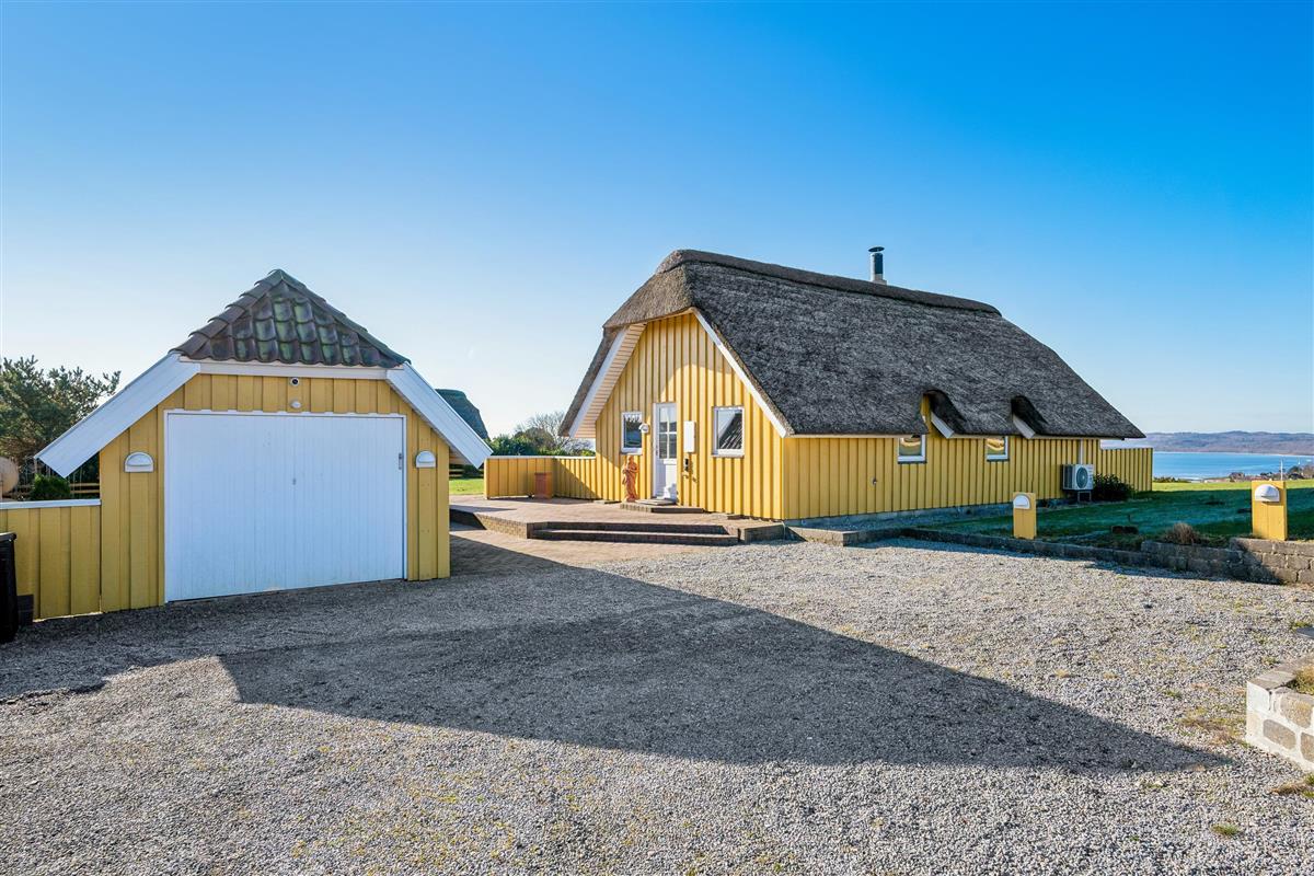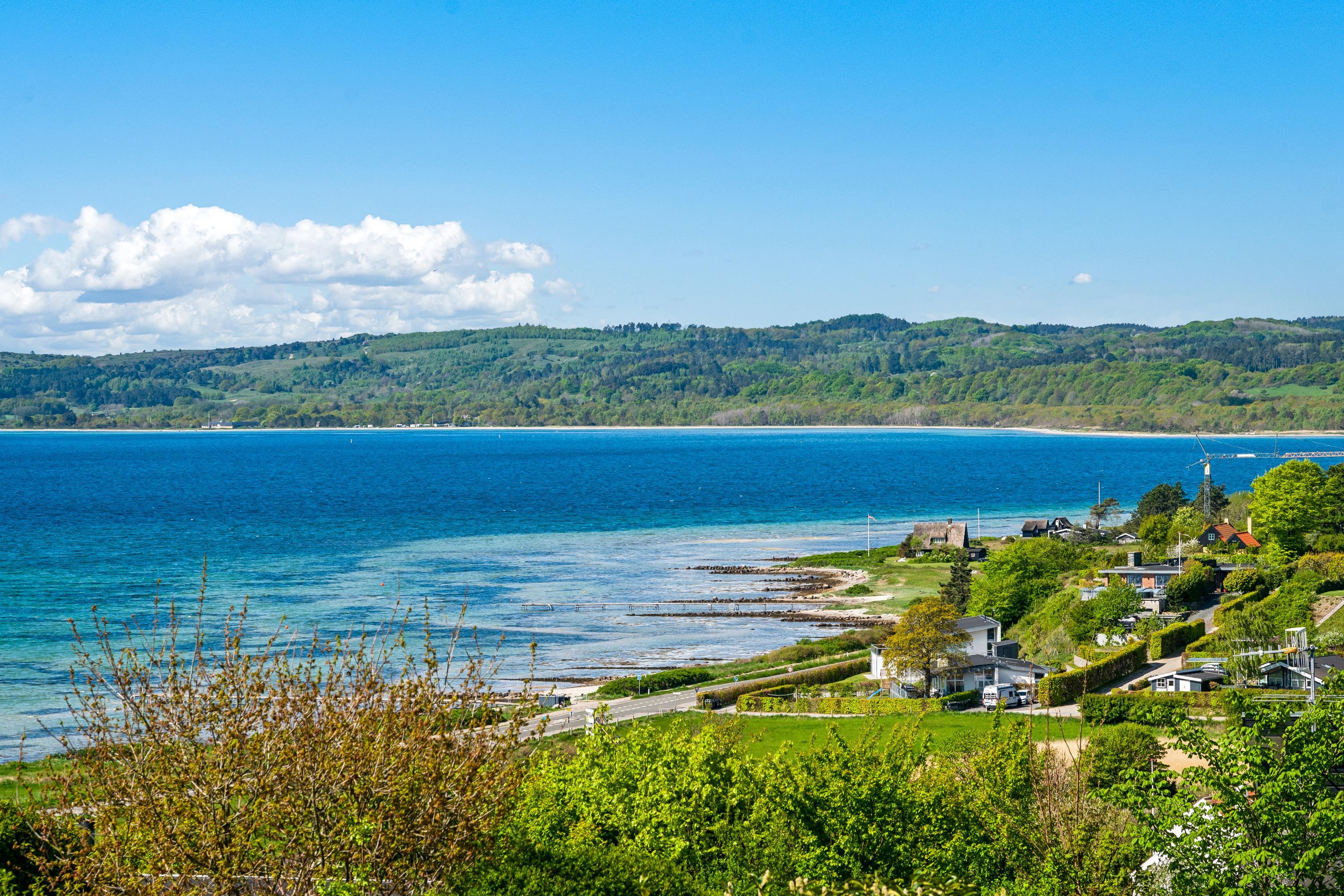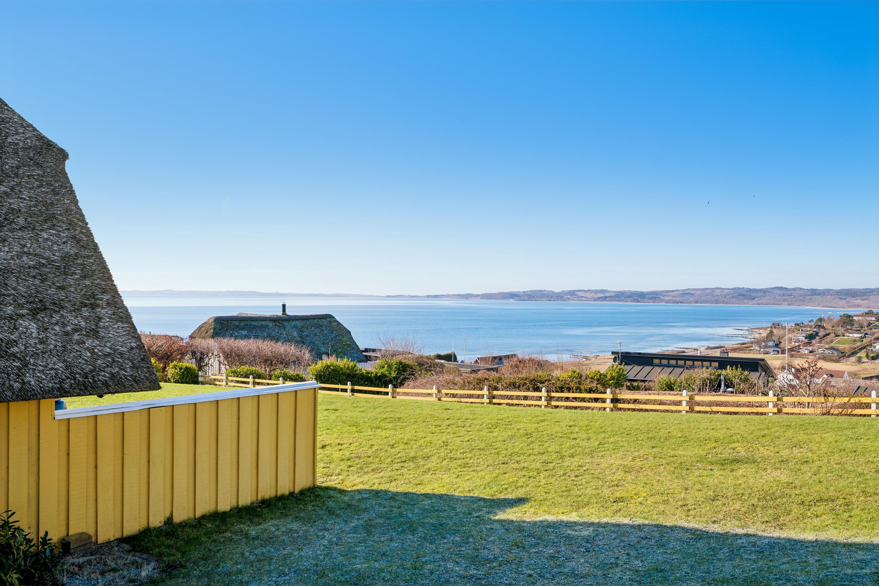 Welcome to this beautifully elevated holiday home at Egsmark Strand, offering one of the most stunning panoramic views in the area. Here, you will find an inviting living room, furnished with quality furniture and direct access to a fantastic terrace with comfortable outdoor seating. Adjacent to the living room is the kitchen, which includes a dishwasher, as well as a lovely and well-furnished dining area. The modern bathroom features a shower, underfloor heating, and access to a washing machine and dryer.