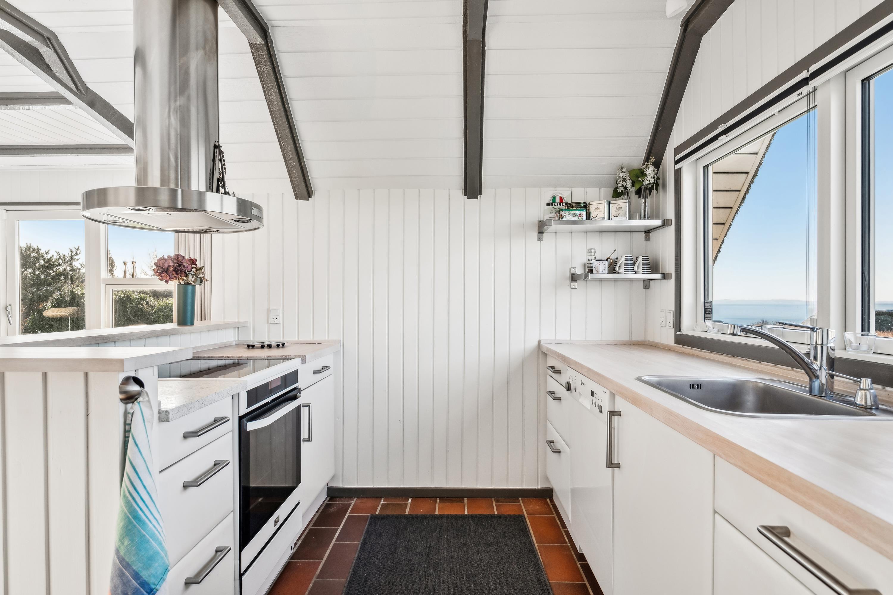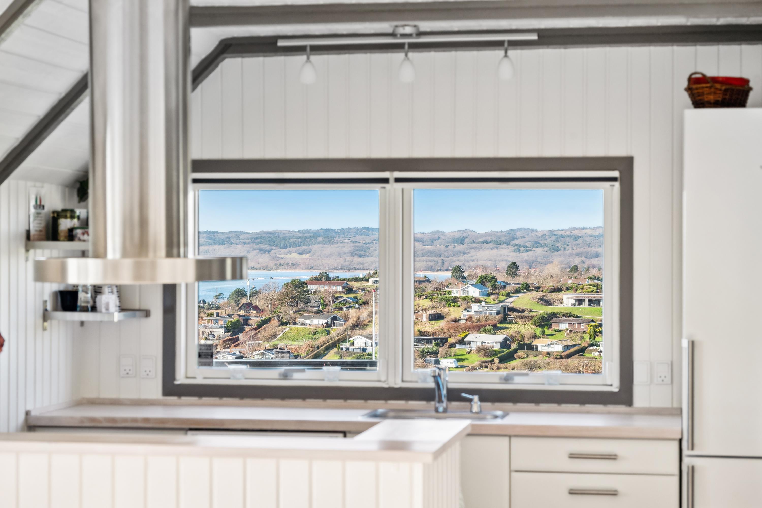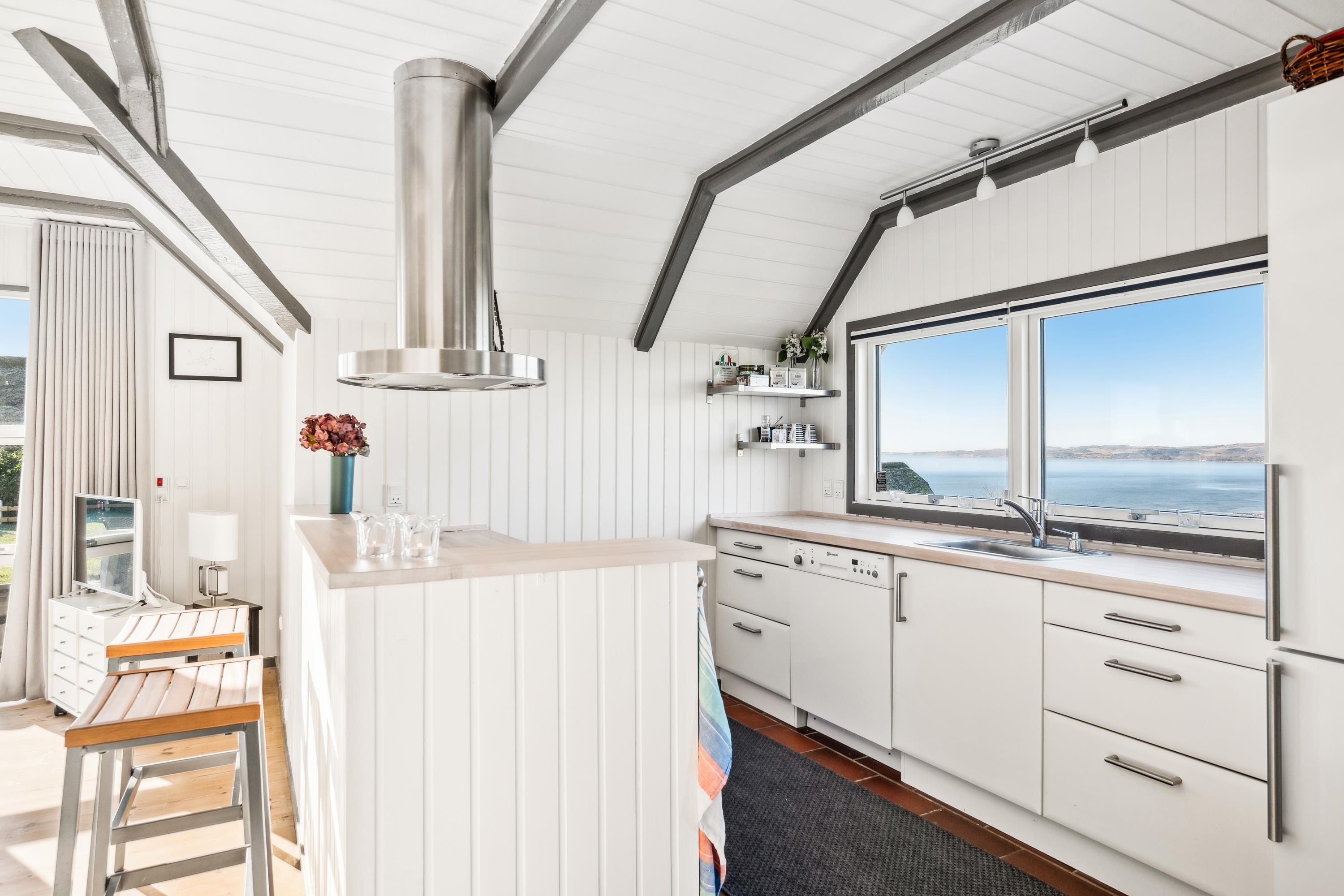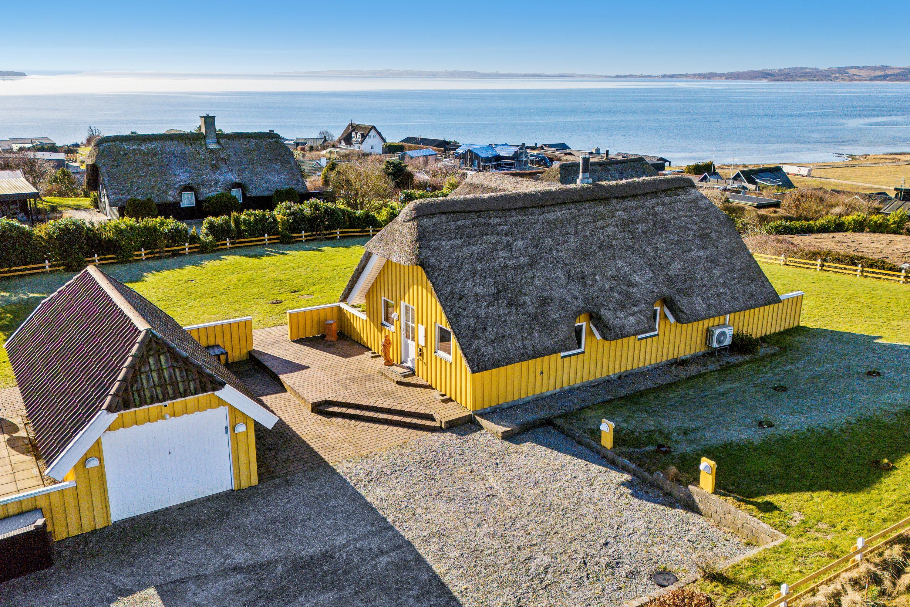 Welcome to this beautifully elevated holiday home at Egsmark Strand, offering one of the most stunning panoramic views in the area. Here, you will find an inviting living room, furnished with quality furniture and direct access to a fantastic terrace with comfortable outdoor seating. Adjacent to the living room is the kitchen, which includes a dishwasher, as well as a lovely and well-furnished dining area. The modern bathroom features a shower, underfloor heating, and access to a washing machine and dryer.