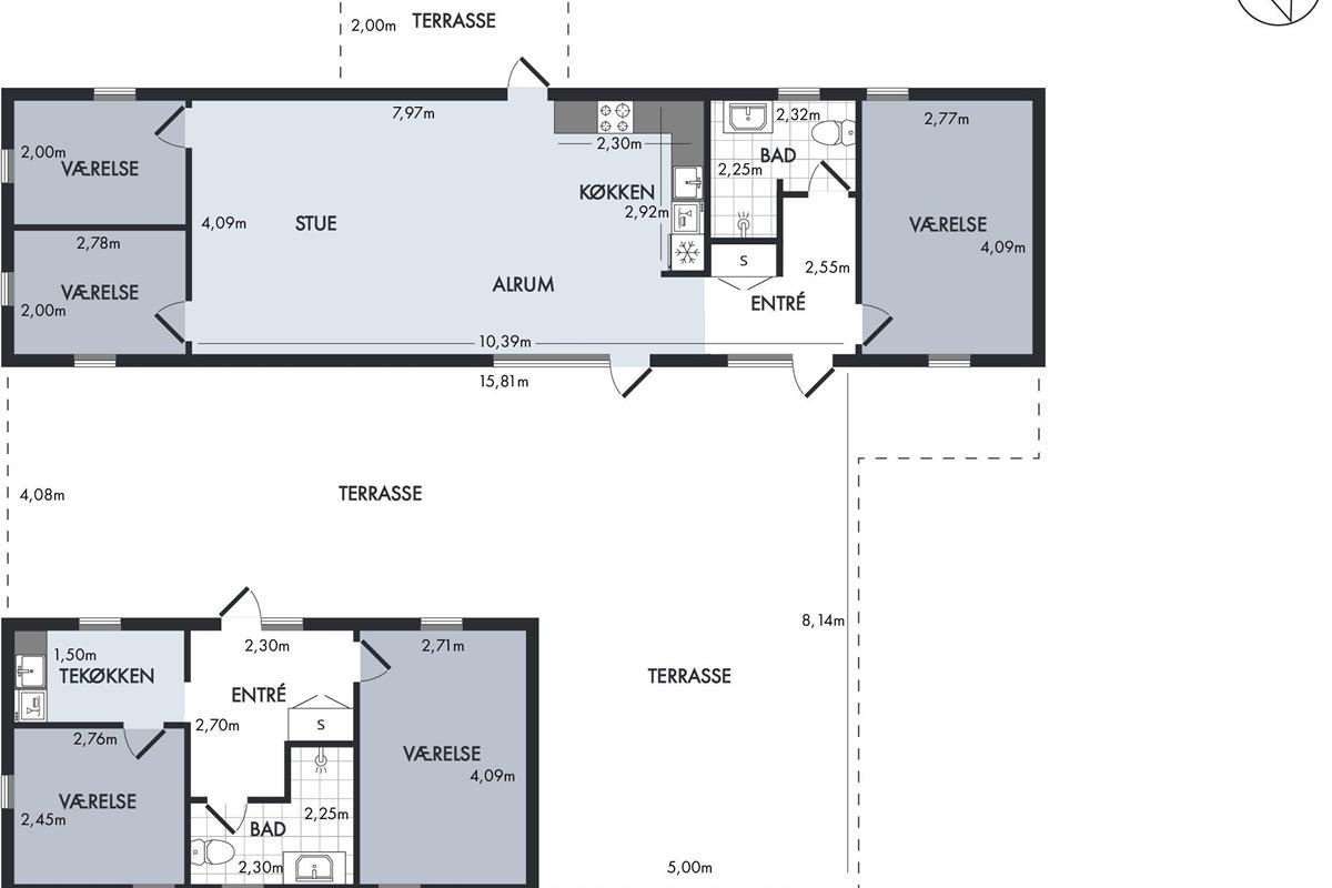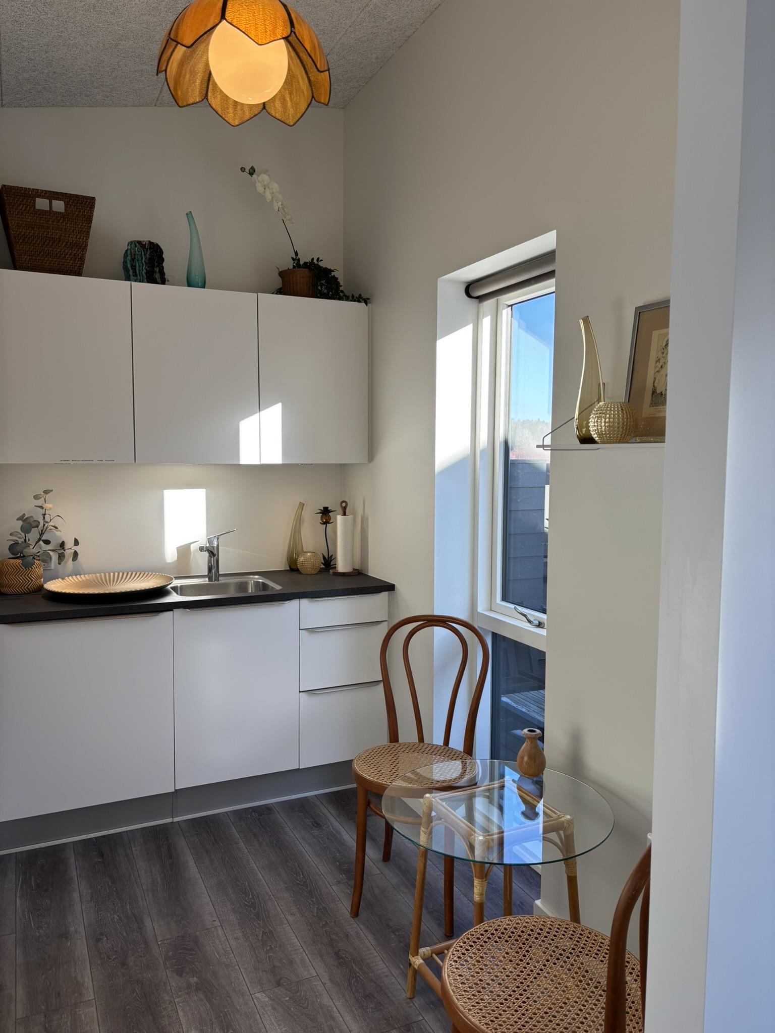 The high ceilings add to the bright and spacious feel of the home. A large, lovely living room opens up to the kitchen, providing a dining area for 10 people, as well as a TV with Danish (including TV2) and German channels. There is a nice bathroom with a shower, plus an additional bathroom, also with a shower. Both wet rooms have underfloor heating. The 10 sleeping spaces are distributed among 3 lovely bedrooms with double beds in the main house, plus 2 bedrooms with double beds in the large annex, which has its own bathroom. Internet access is available.
