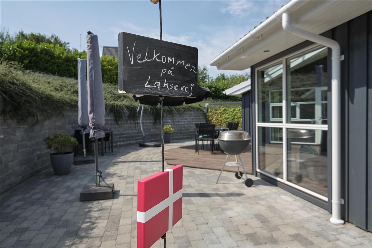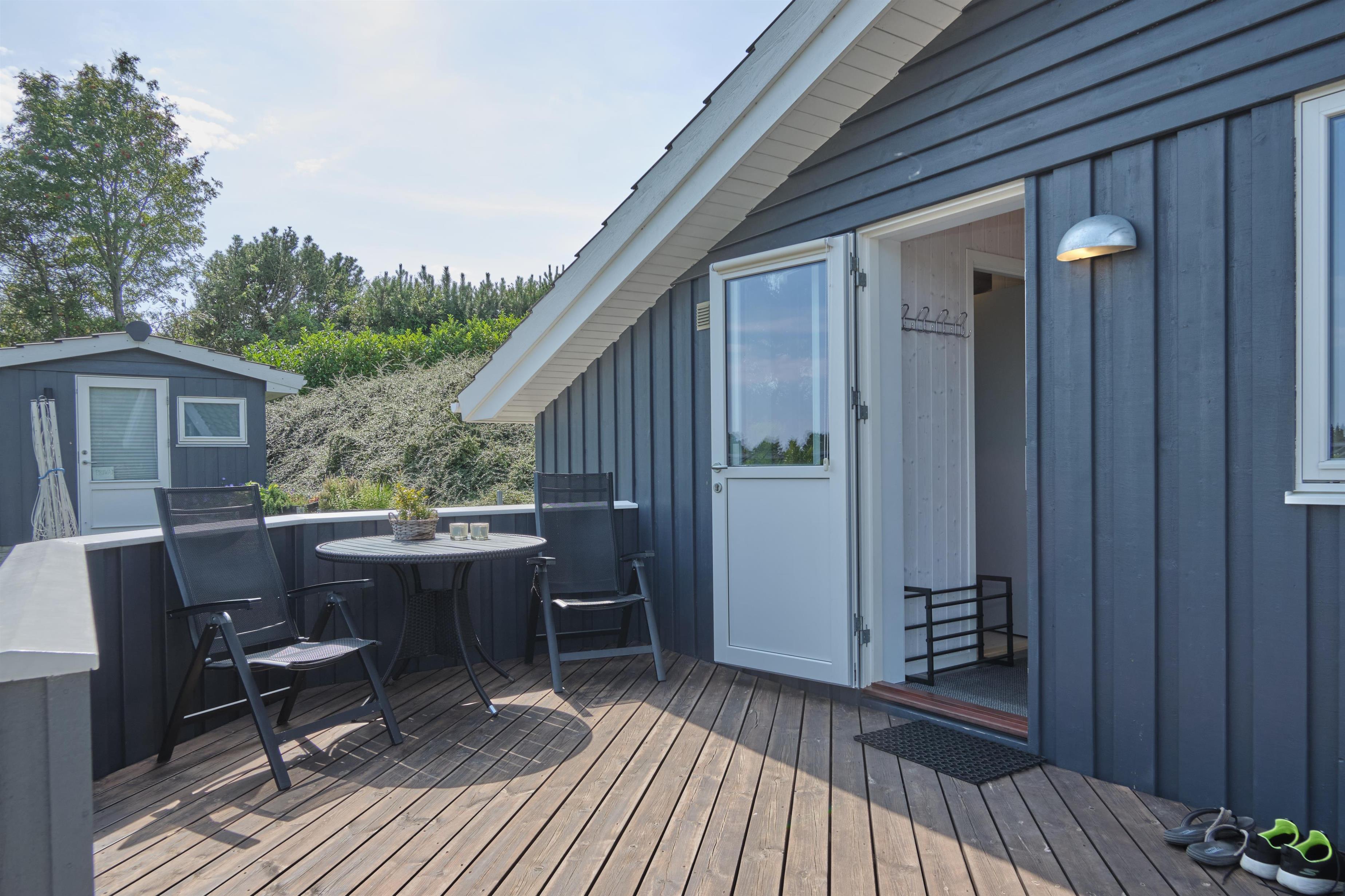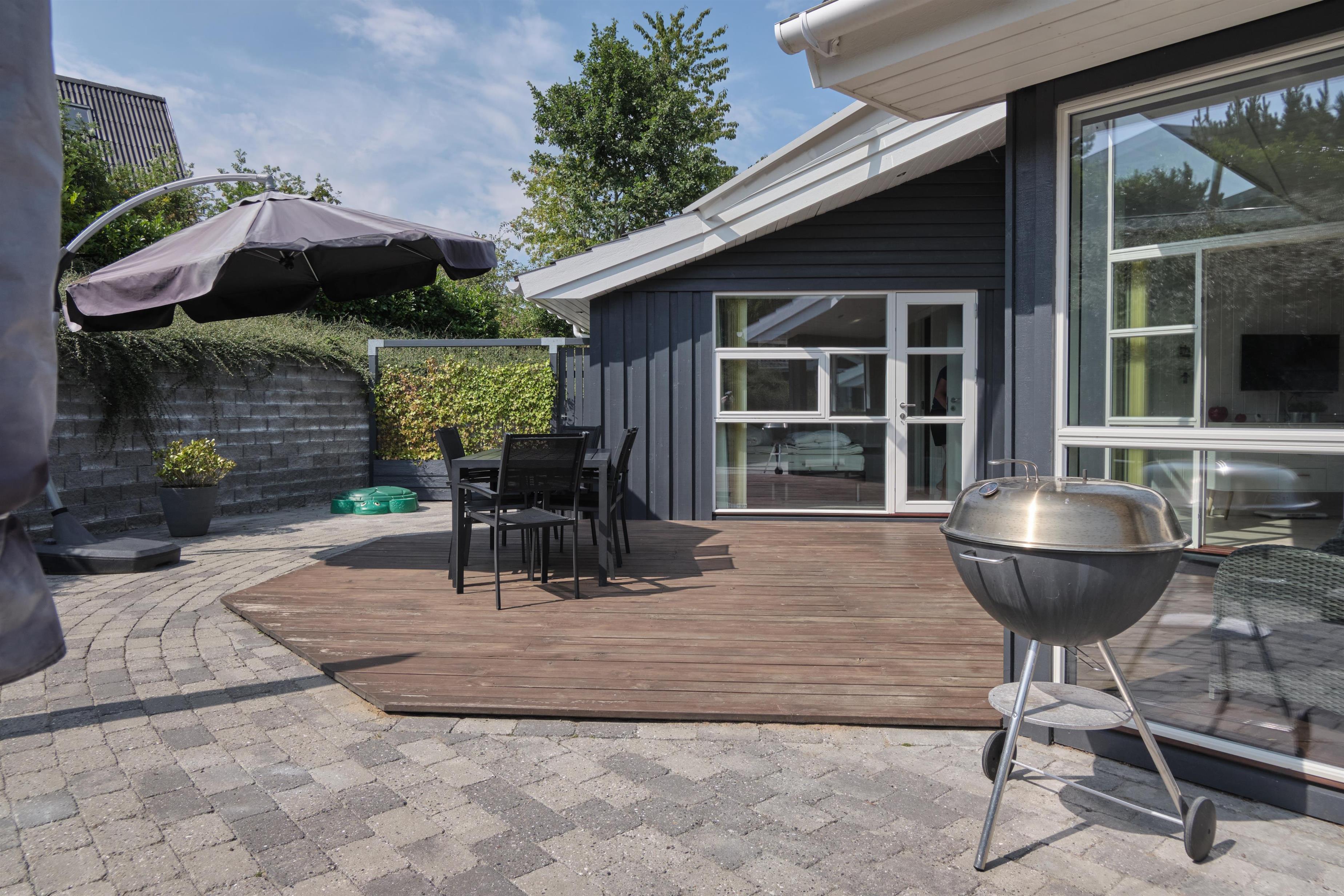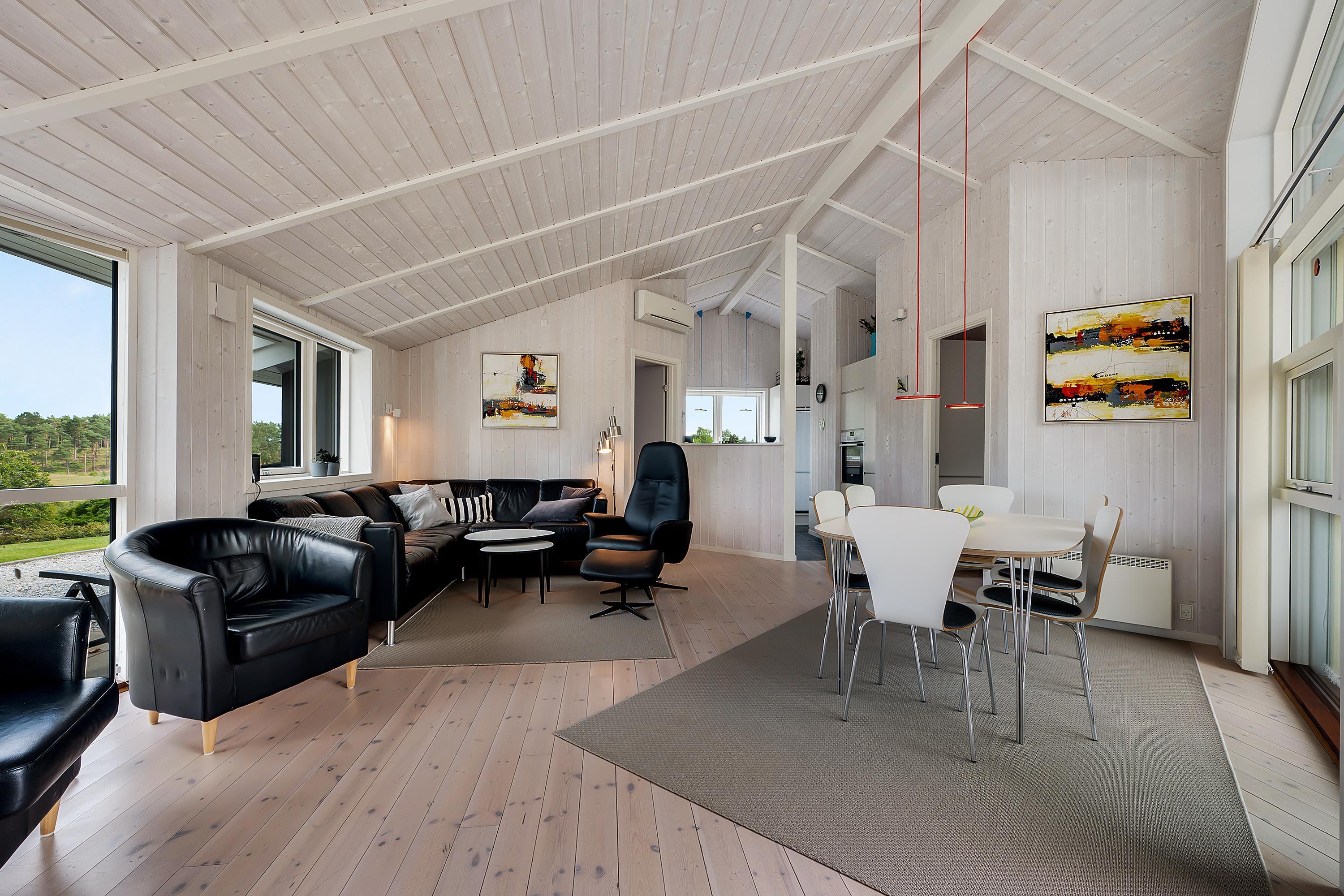 This lovely holiday home is situated high up in the popular Egsmark Strand area. The house is set on a well-maintained natural plot with two lawns and a large paved area facing east and south. There are two wooden terraces: one facing east for the morning sun, and a lovely, south-facing, partially covered wooden terrace with plenty of sun and shelter from the wind. Around the house, you'll find outdoor furniture, sun loungers, parasols, a drying rack, charcoal and gas grills, and garden toys. A truly beautifully and thoughtfully decorated house.