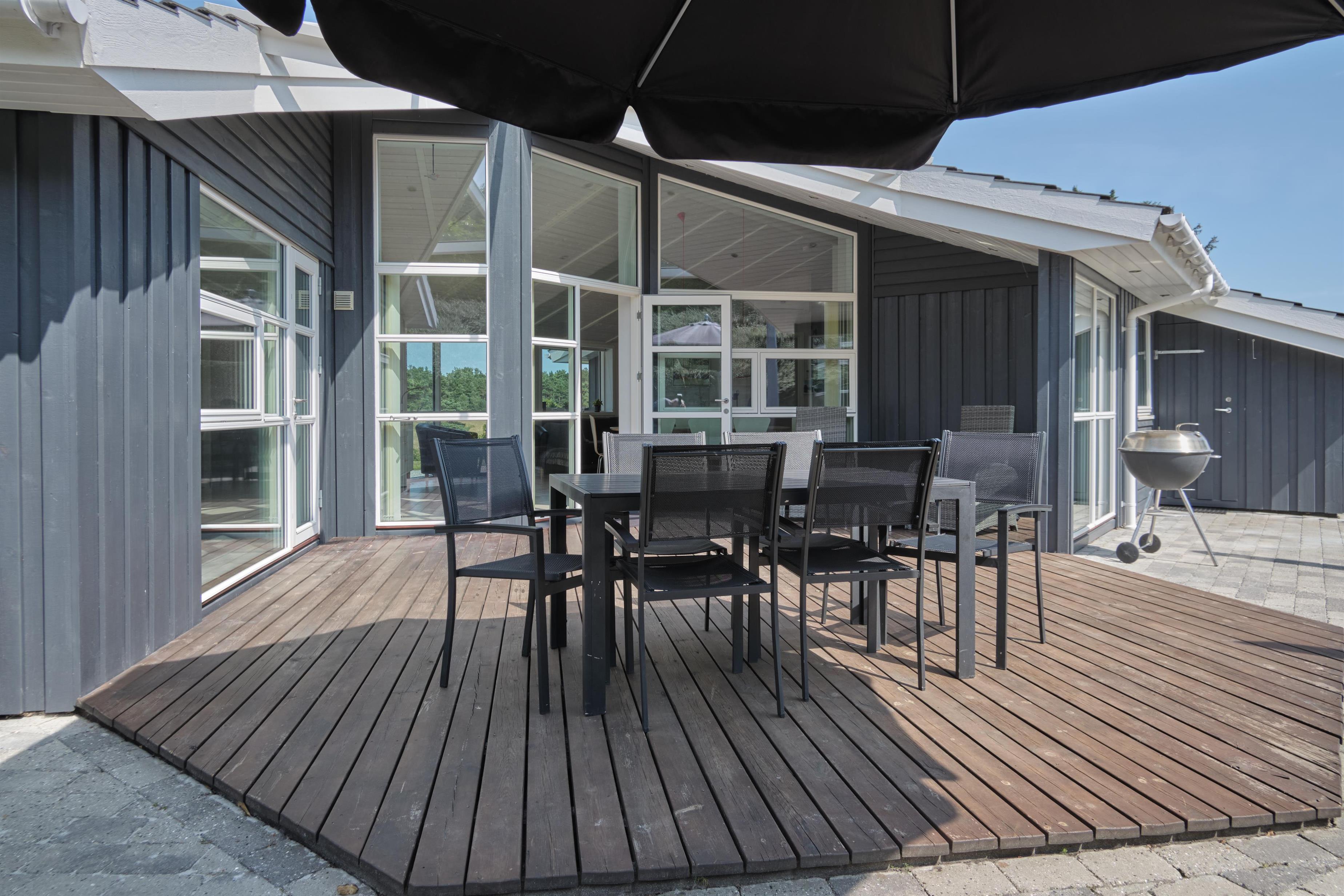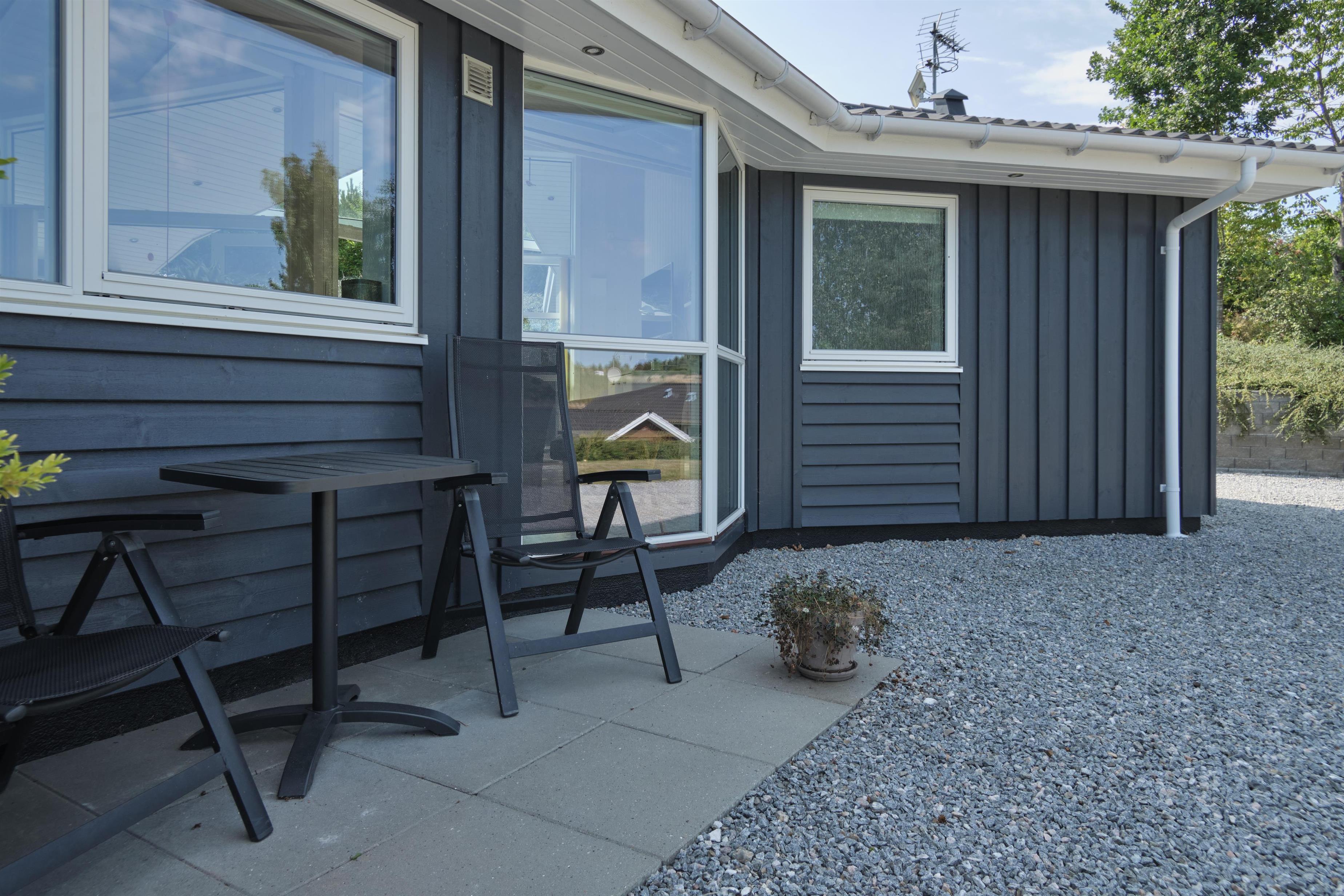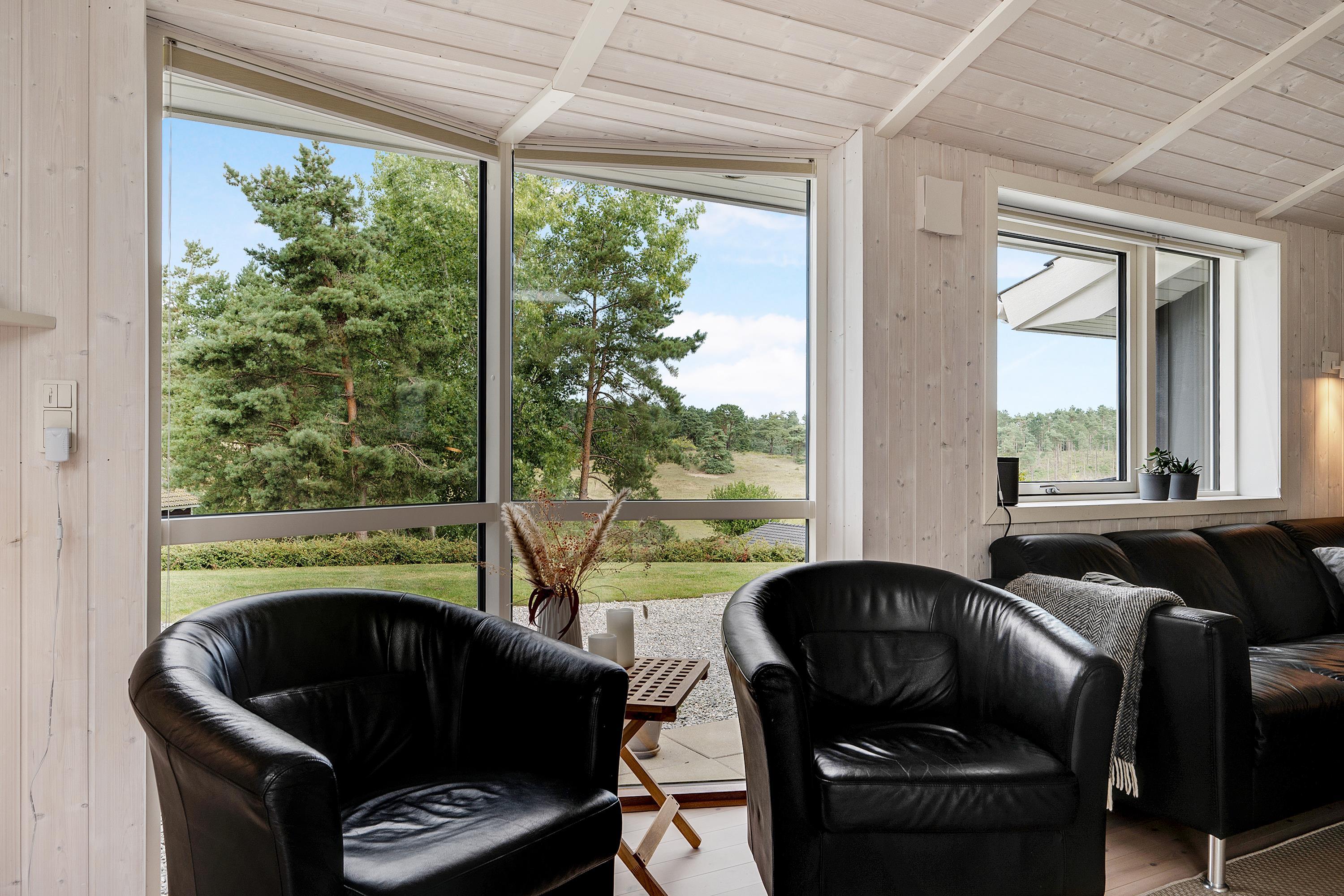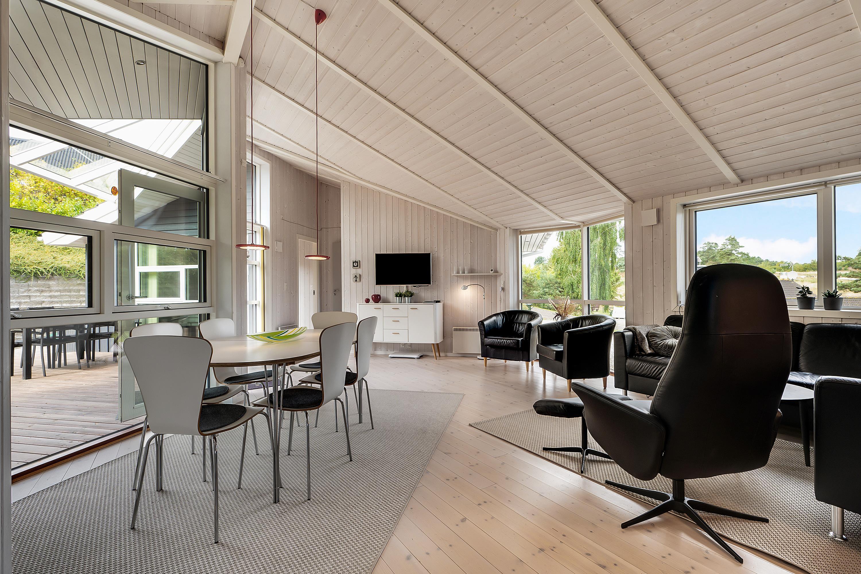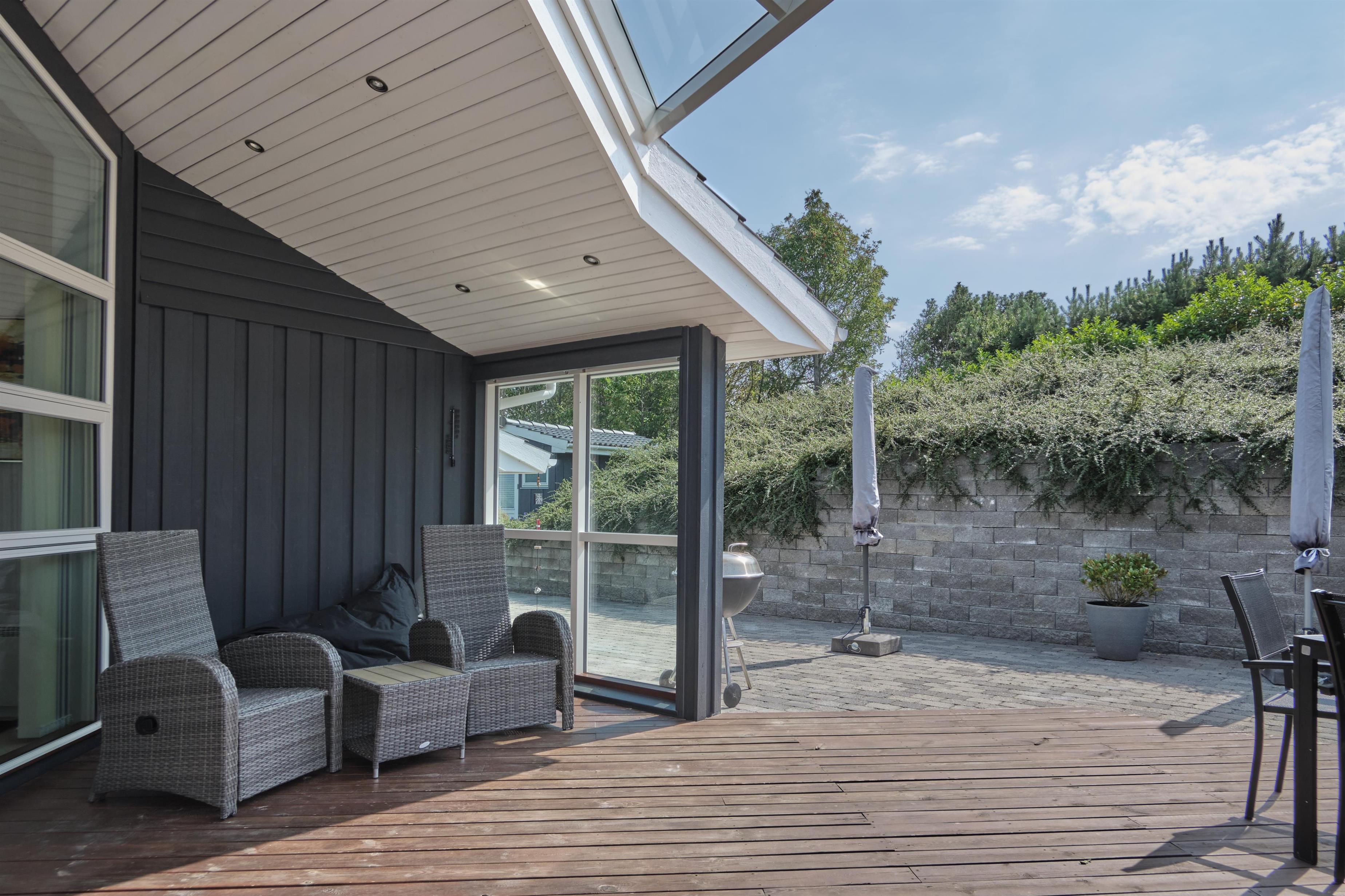 This lovely holiday home is situated high up in the popular Egsmark Strand area. The house is set on a well-maintained natural plot with two lawns and a large paved area facing east and south. There are two wooden terraces: one facing east for the morning sun, and a lovely, south-facing, partially covered wooden terrace with plenty of sun and shelter from the wind. Around the house, you'll find outdoor furniture, sun loungers, parasols, a drying rack, charcoal and gas grills, and garden toys. A truly beautifully and thoughtfully decorated house.