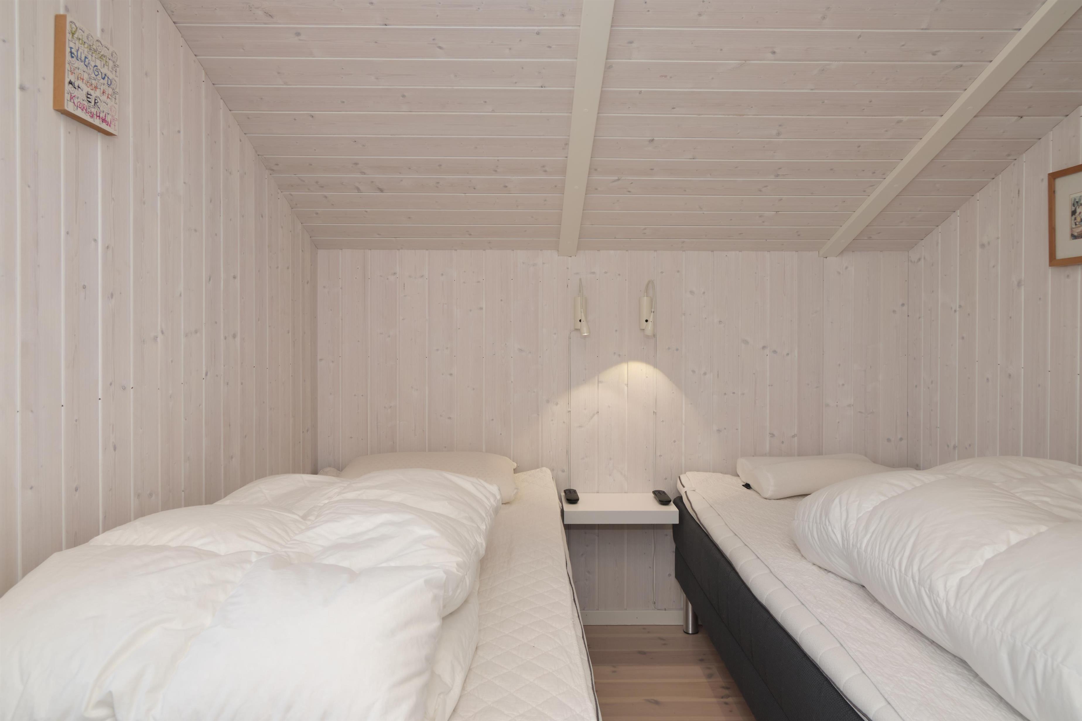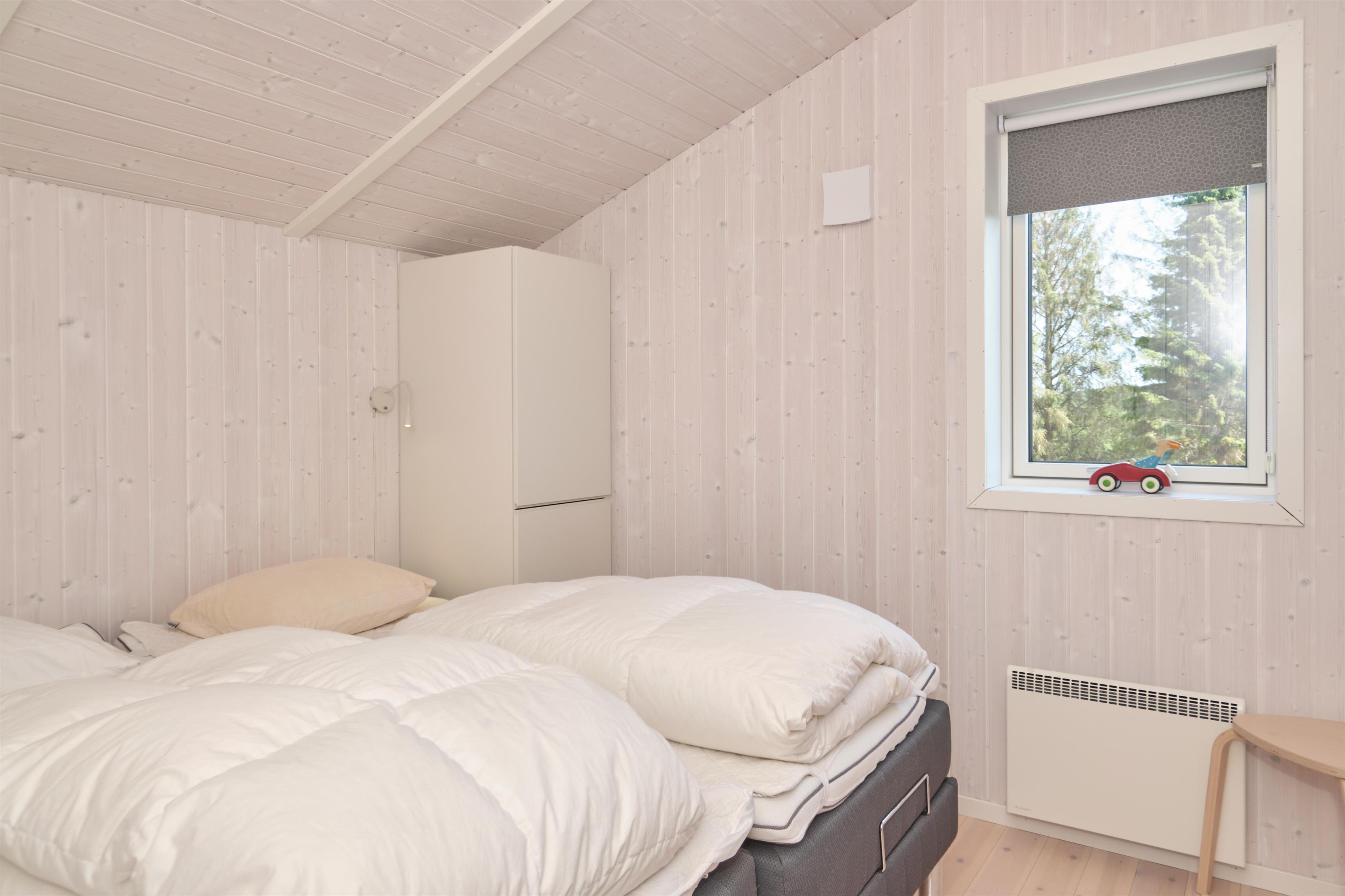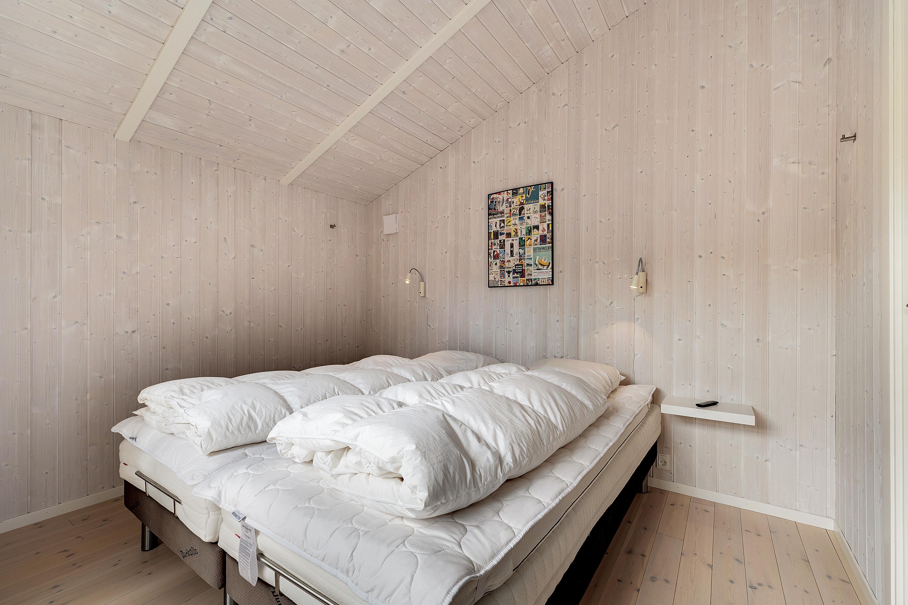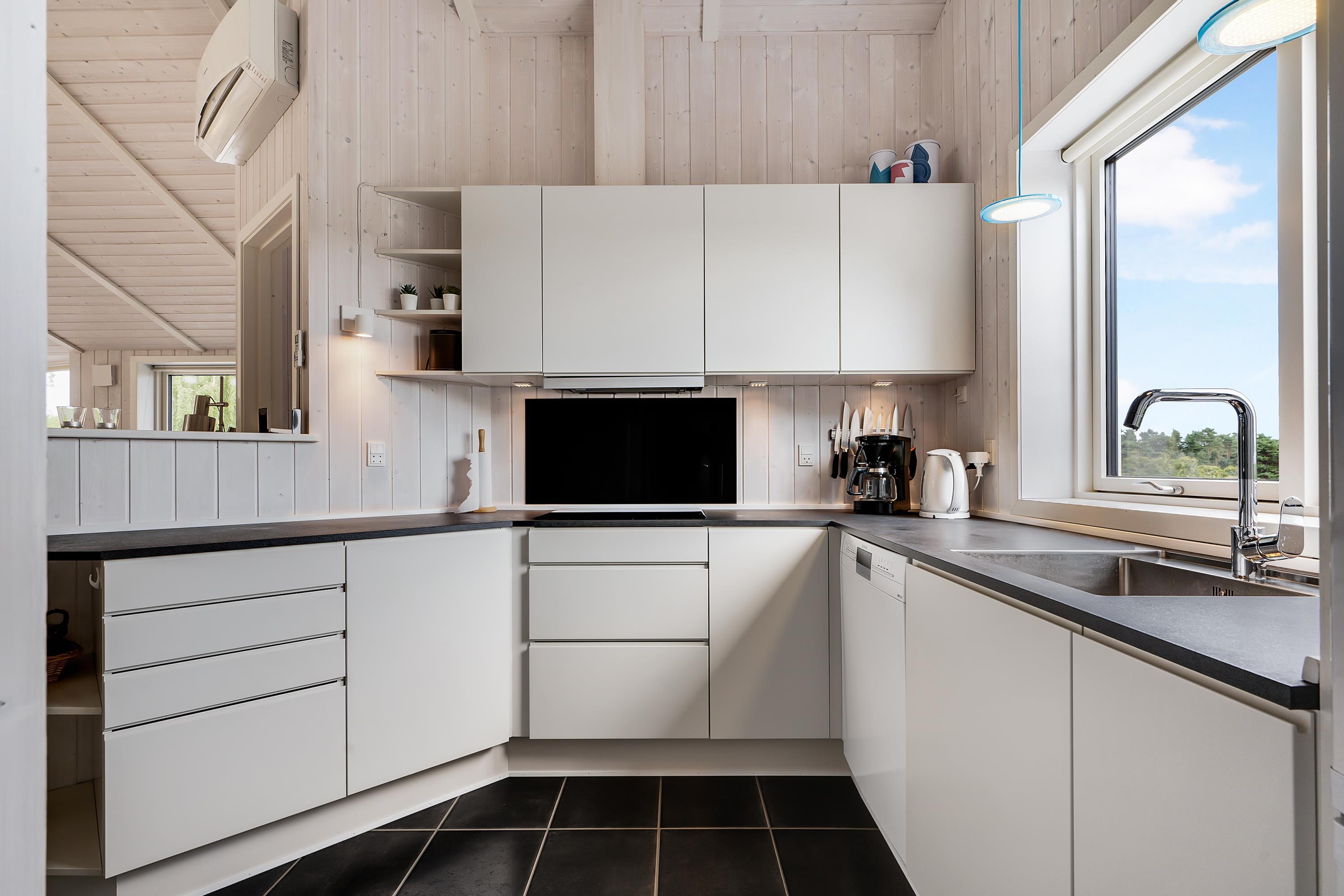 This lovely holiday home is situated high up in the popular Egsmark Strand area. The house is set on a well-maintained natural plot with two lawns and a large paved area facing east and south. There are two wooden terraces: one facing east for the morning sun, and a lovely, south-facing, partially covered wooden terrace with plenty of sun and shelter from the wind. Around the house, you'll find outdoor furniture, sun loungers, parasols, a drying rack, charcoal and gas grills, and garden toys. A truly beautifully and thoughtfully decorated house.