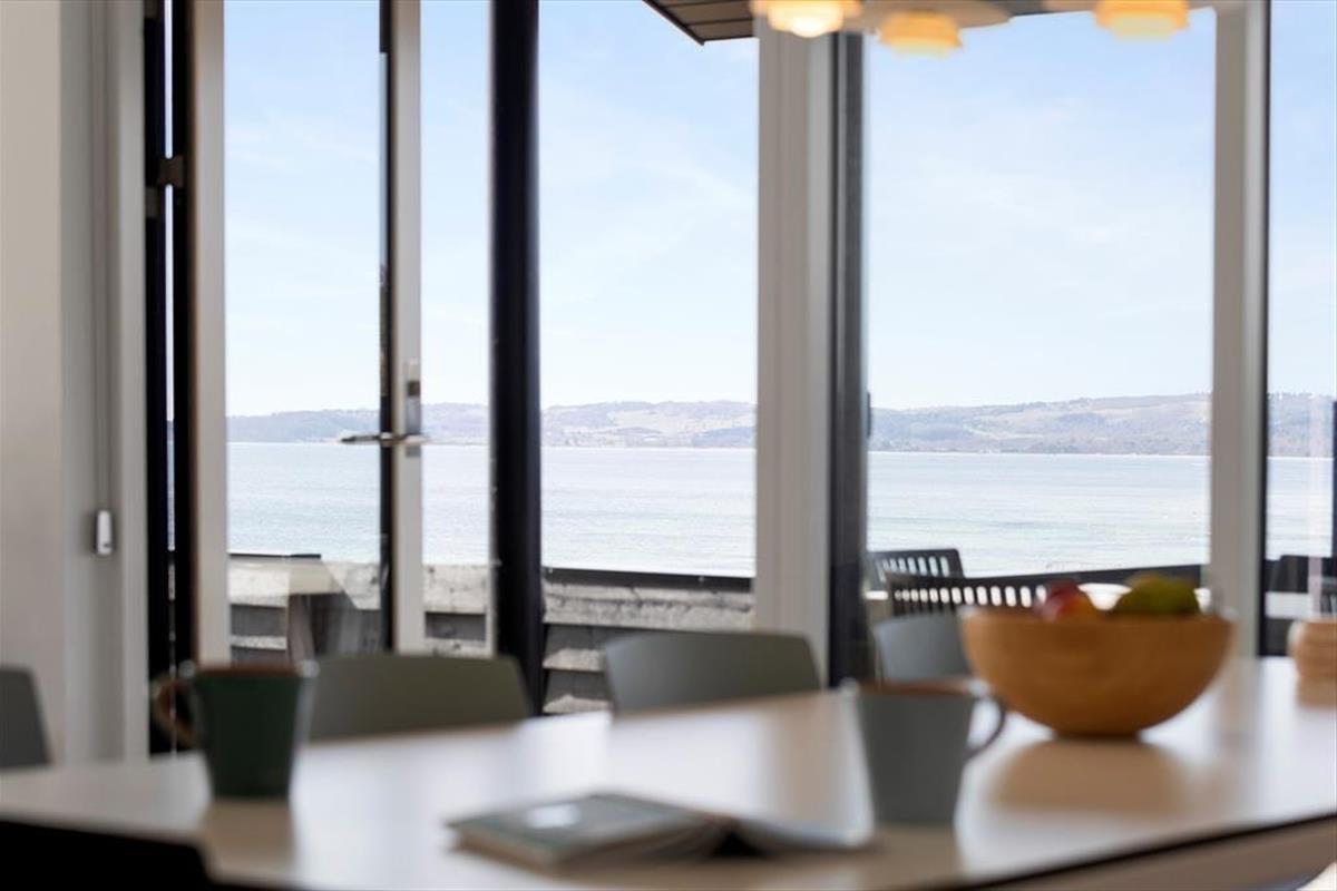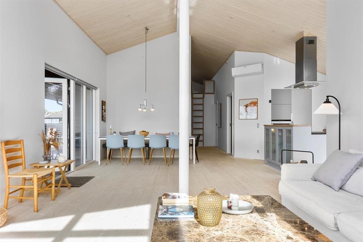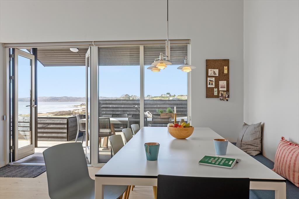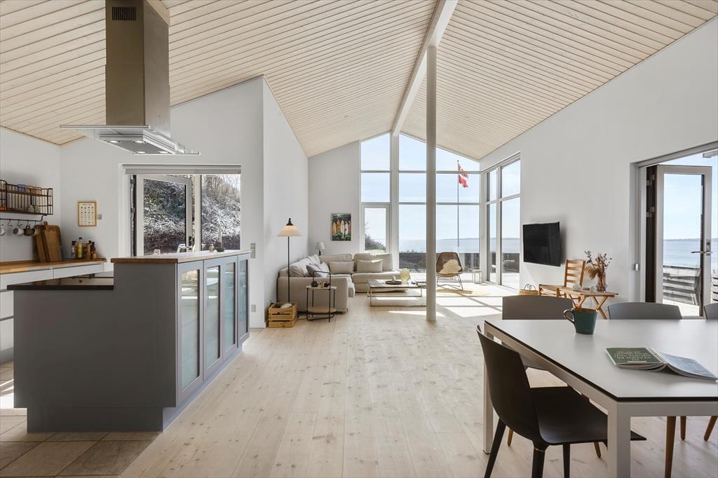 Tritt ein in dieses helle und freundliche Ferienhaus, in dem sofort Urlaubsstimmung aufkommt. Es ist mit viel Liebe zum Detail und einem Fokus auf Gemütlichkeit und Funktionalität eingerichtet – hier findest du alles, was du für einen entspannten Urlaub brauchst. Der offene Wohnbereich mit Küche und Wohnzimmer lädt zu gemeinsamen Stunden ein. Ob ihr zusammen kocht, am Esstisch spielt oder euch auf dem Sofa vor dem Kaminofen entspannt – hier fühlt ihr euch gleich wohl. Die großen Fensterfronten lassen viel Licht herein und geben dir das Gefühl, mitten in der Natur zu sein. Durch die schöne Aussicht auf das Wasser genießt du auch drinnen den Zauber der Umgebung. Das Haus verfügt über drei gemütliche Schlafzimmer, einen ausgebauten Schlafboden (Hems) und ein modernes Badezimmer – perfekt für Familien oder Freunde, die gemeinsam reisen.