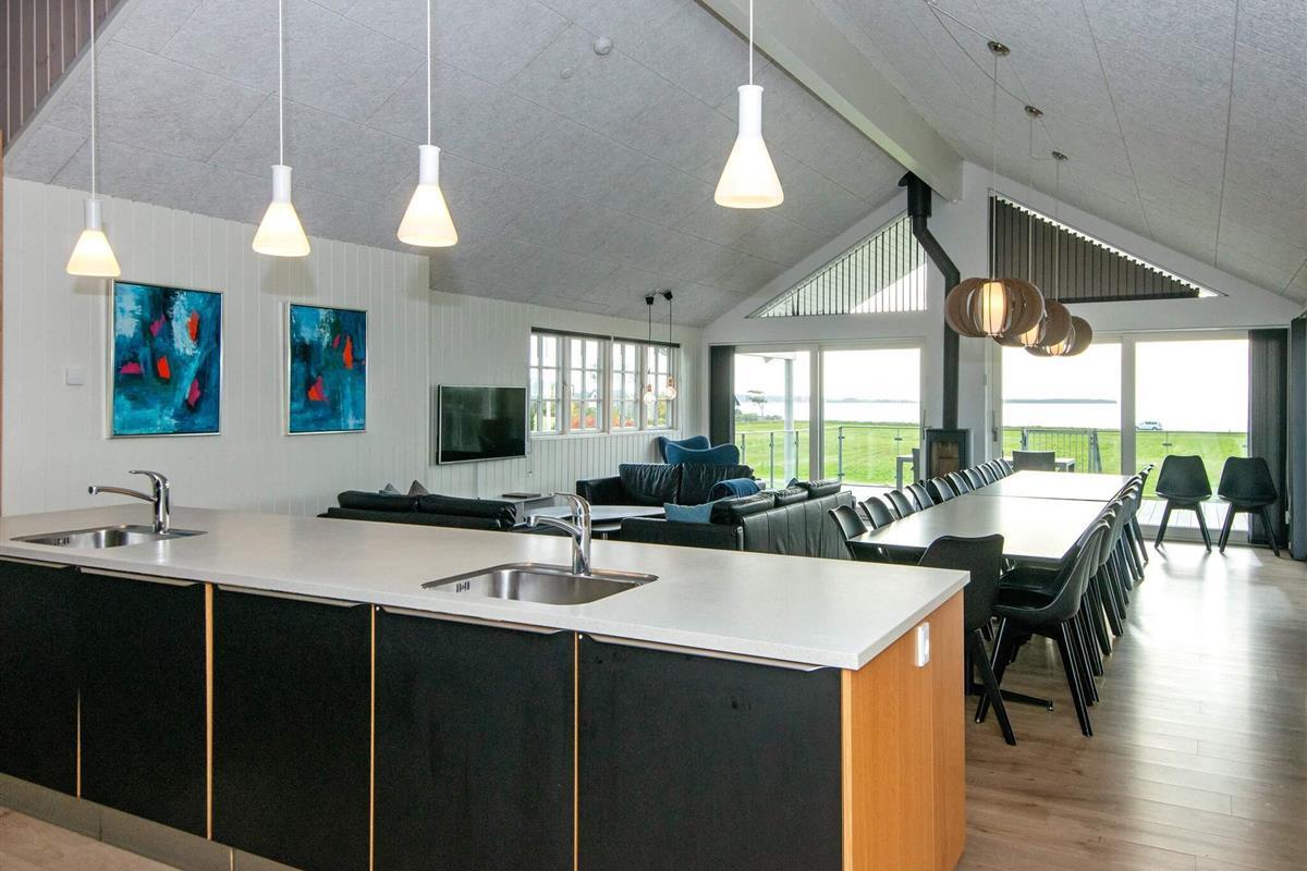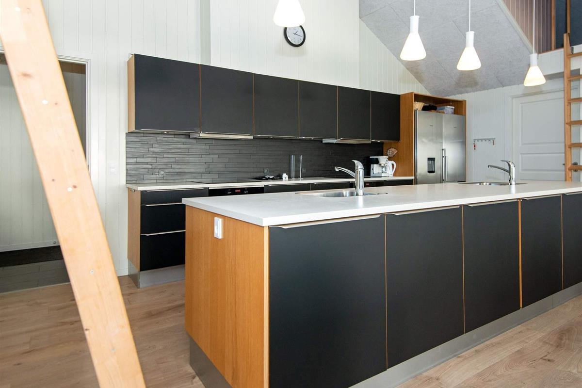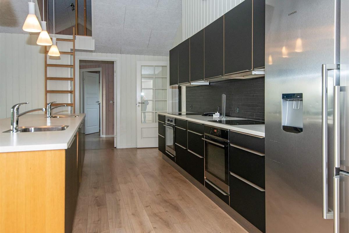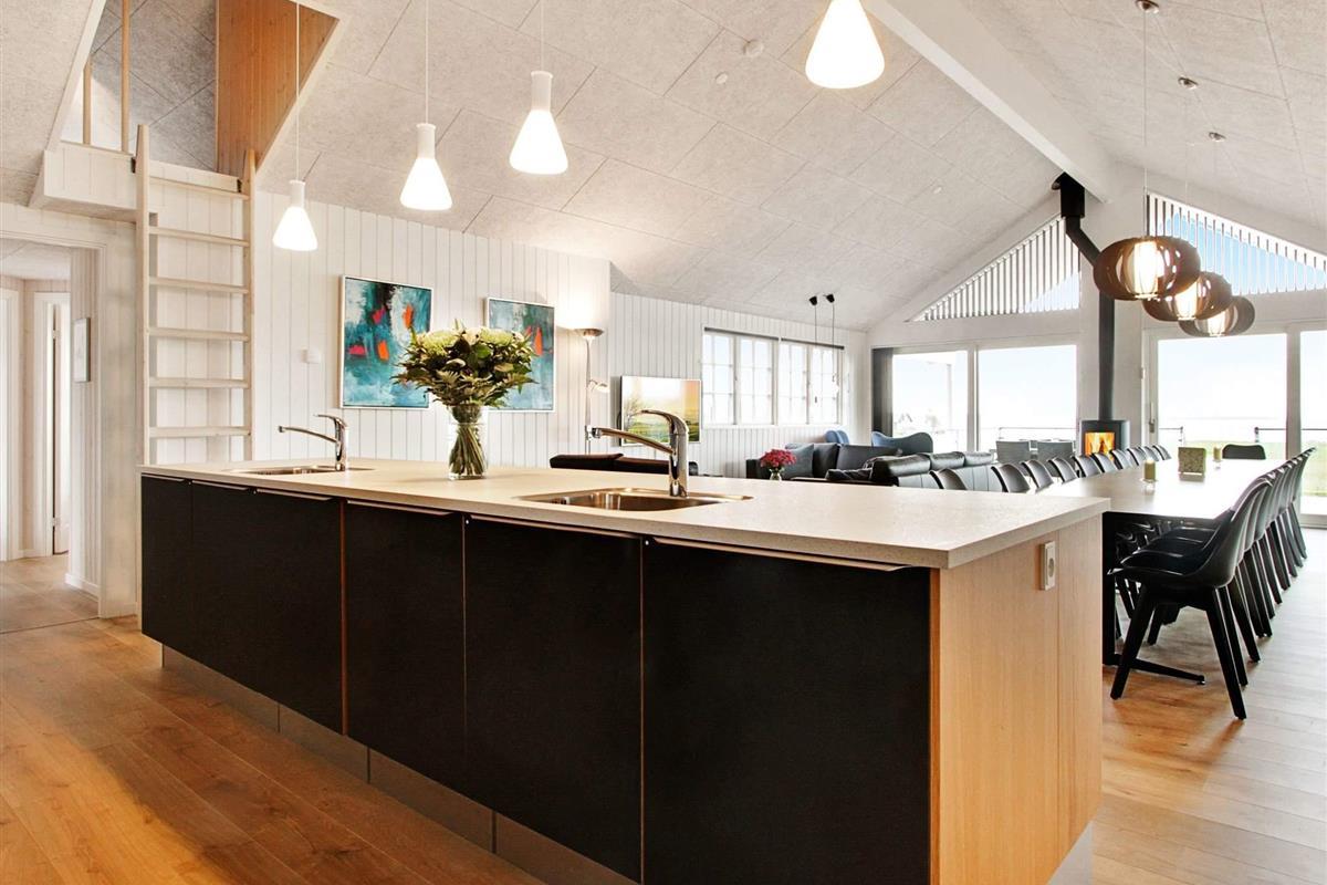 Im Erdgeschoss findet mab den großen Küchen-/Wohnbereich mit Ess- und Sitzecke für das Familienleben. Eine klimafreundliche Wärmepumpe sowie ein gemütlicher Kaminofen stehen für kühlere Tage bereit. Die gut ausgestattete Küche stellt u.a. je zwei Geschirrspüler, Küchenspülen und Herde bereit, dazu gute Kühlkapazitäten.