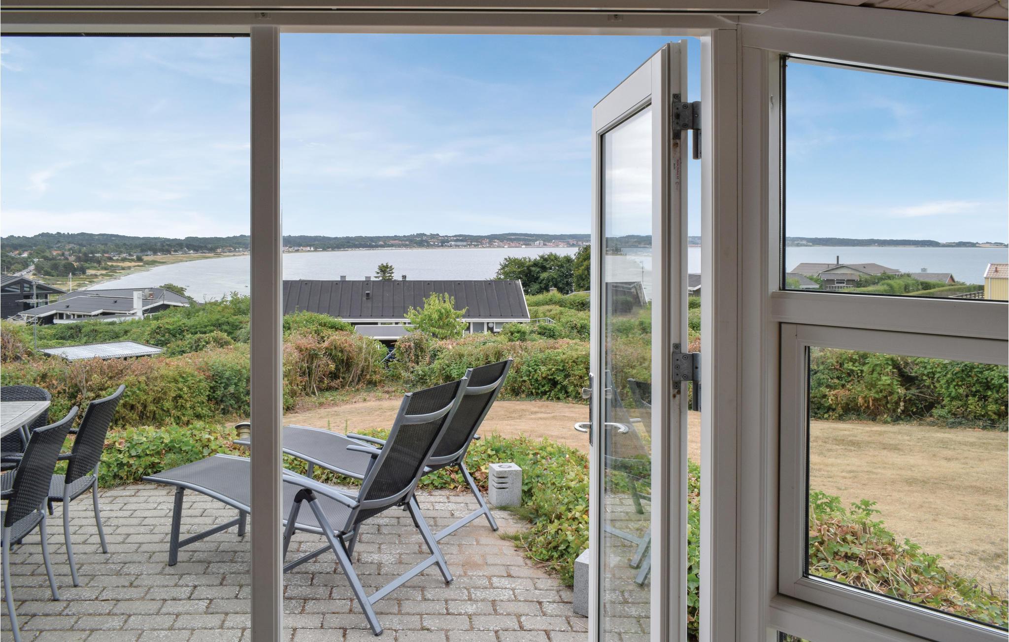 Dit vakantiehuis in Egsmark Strand biedt een panoramisch uitzicht en wellness met sauna en houtgestookte hottub.