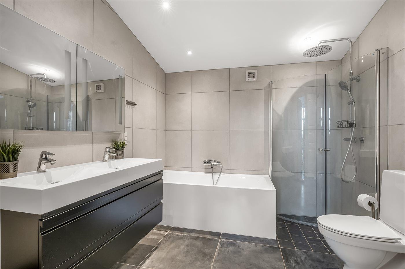 Er is 2 badkamers met douchehok en 2 toiletten. Badkuip.