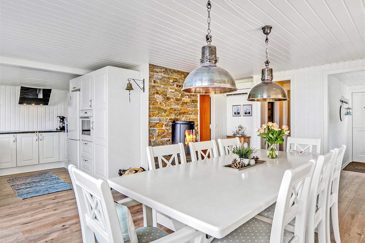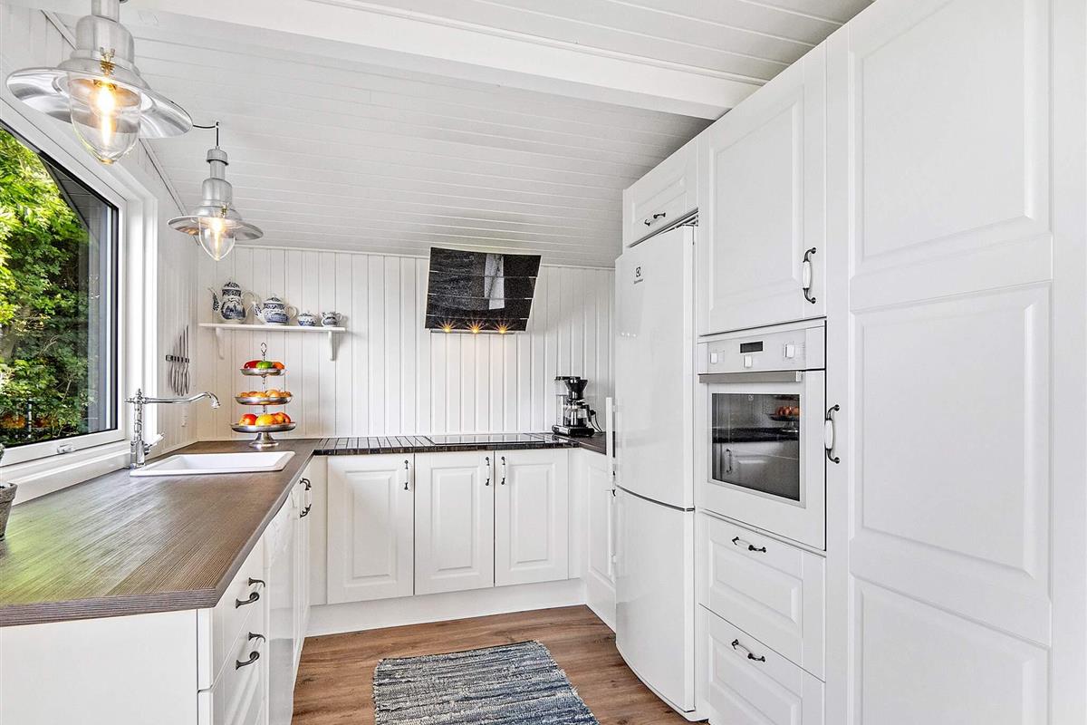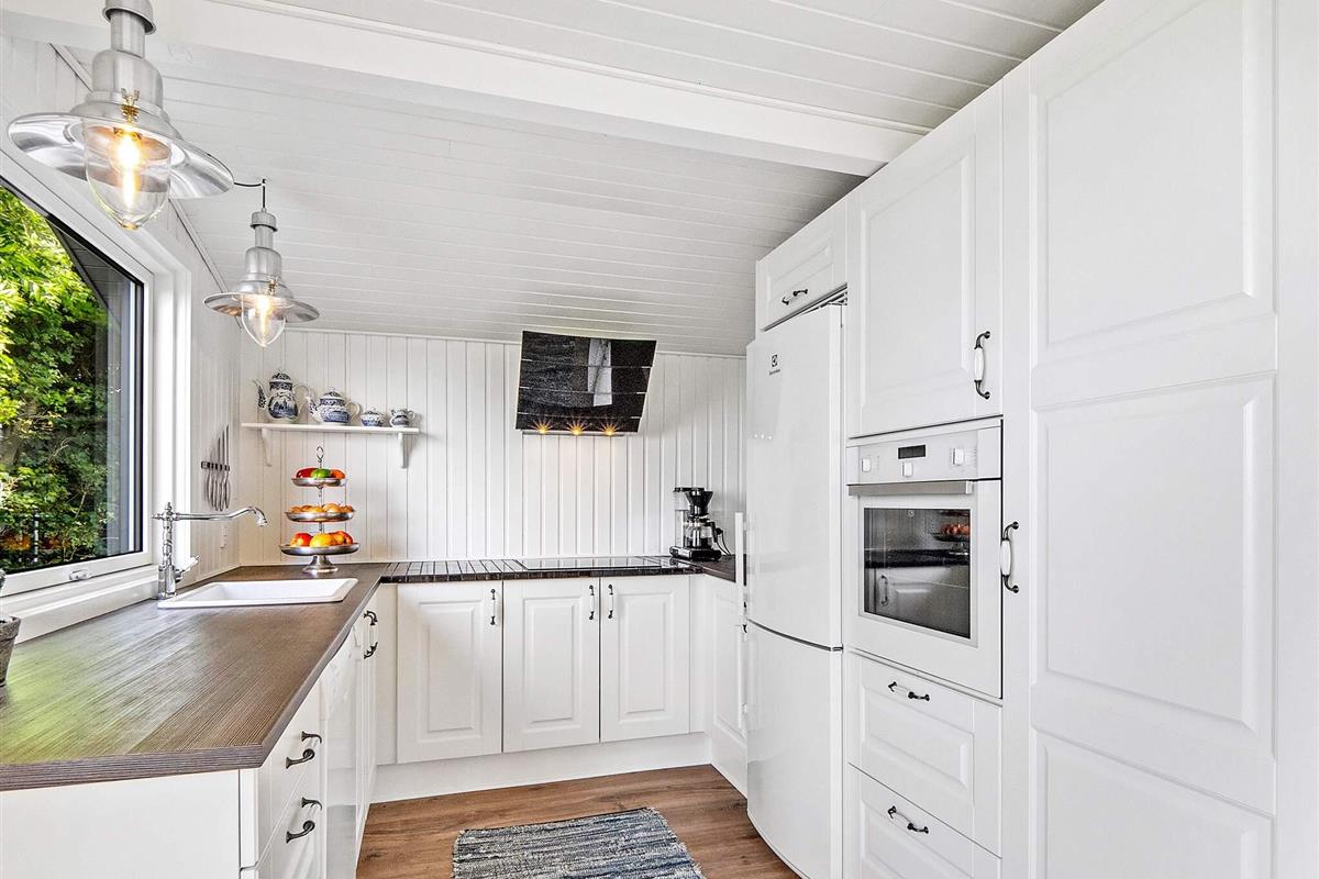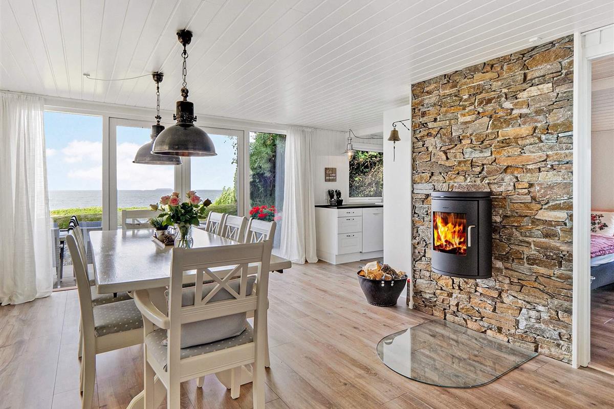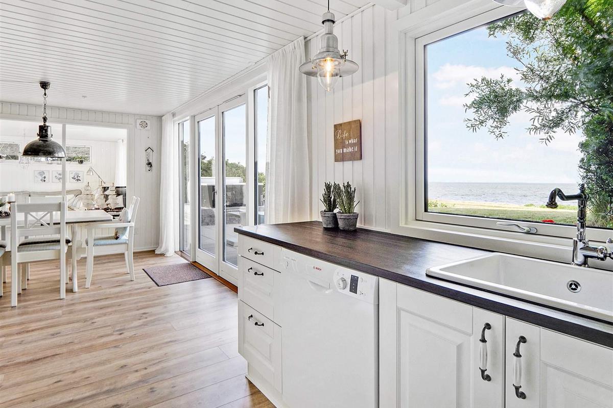 Die Küche ist mit einem Cerankochfeld, einem separaten Backofen mit Grill, einer Dunstabzugshaube, einer Mikrowelle, einem Geschirrspüler und einer Kaffeemaschine ausgestattet. Für kühle Sommerabende oder verregnete Herbstabende steht ein Holzofen zur Verfügung. Die Küche bietet einen Panoramablick auf das Wasser und direkten Zugang zur Terrasse.