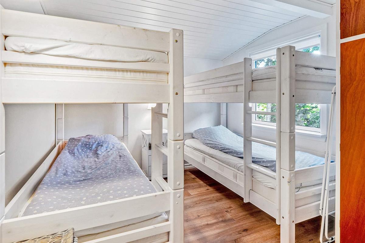 Das Ferienhaus verfügt über zwei Schlafzimmer, eines mit zwei Einzelbetten und eines mit vier Etagenbetten.