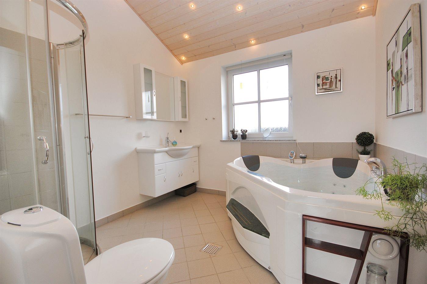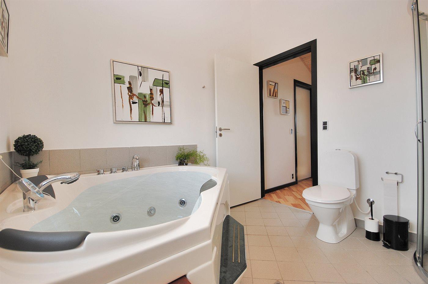 Er is 1 badkamer met douchehok en 2 toiletten, waarvan 1 gastentoilet. Er is vloerverwarming in 1 badkamer.