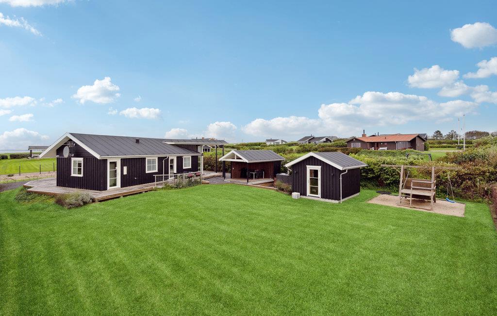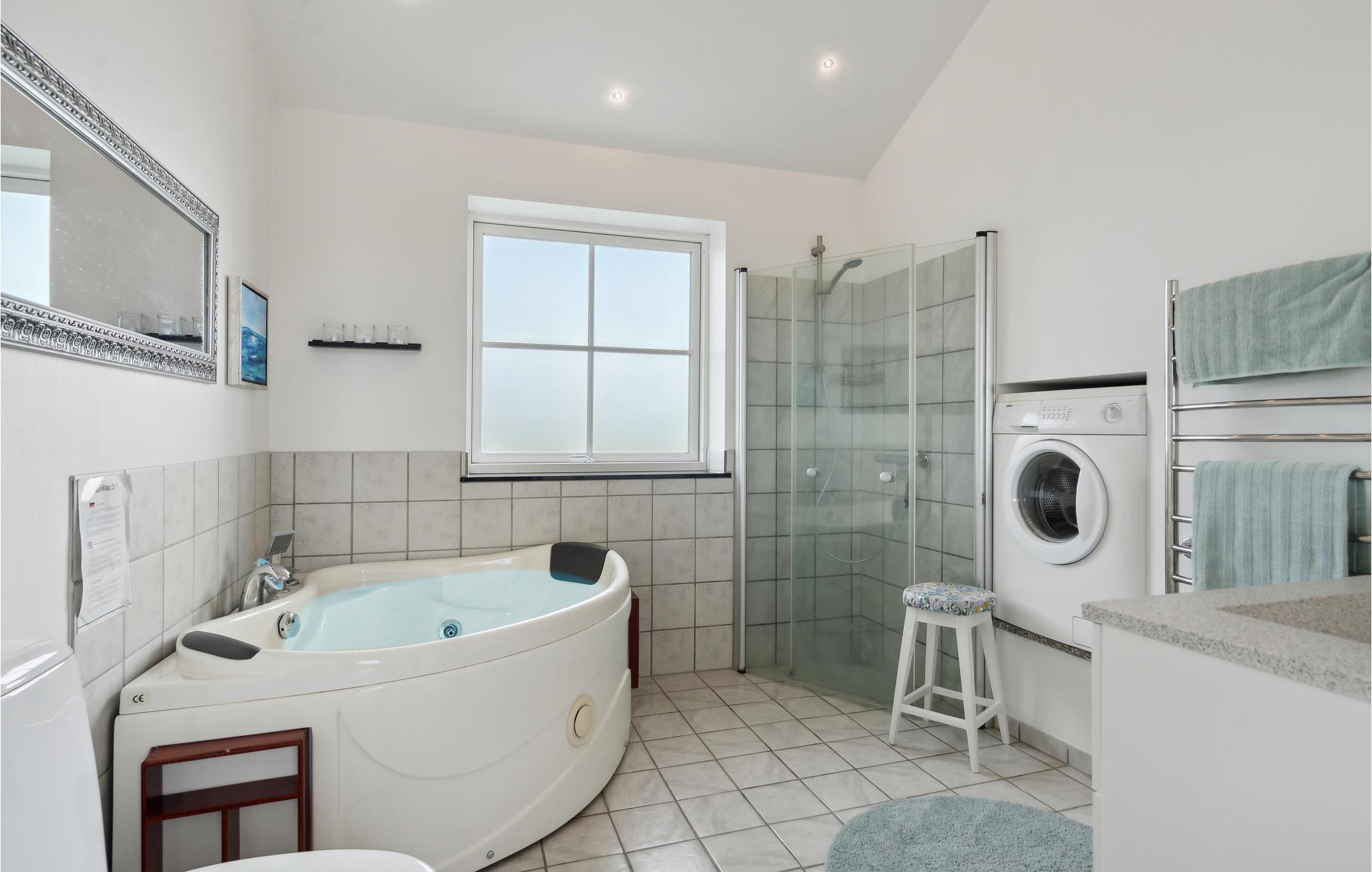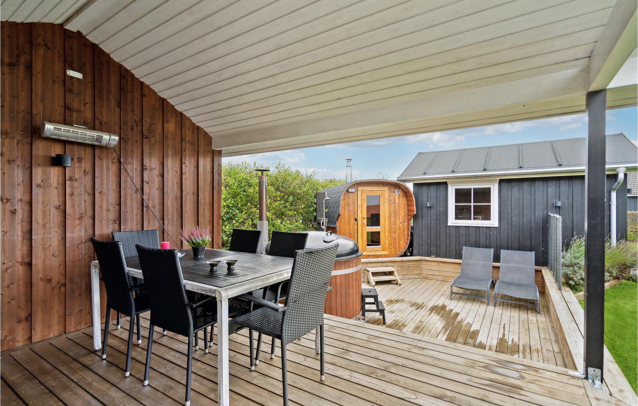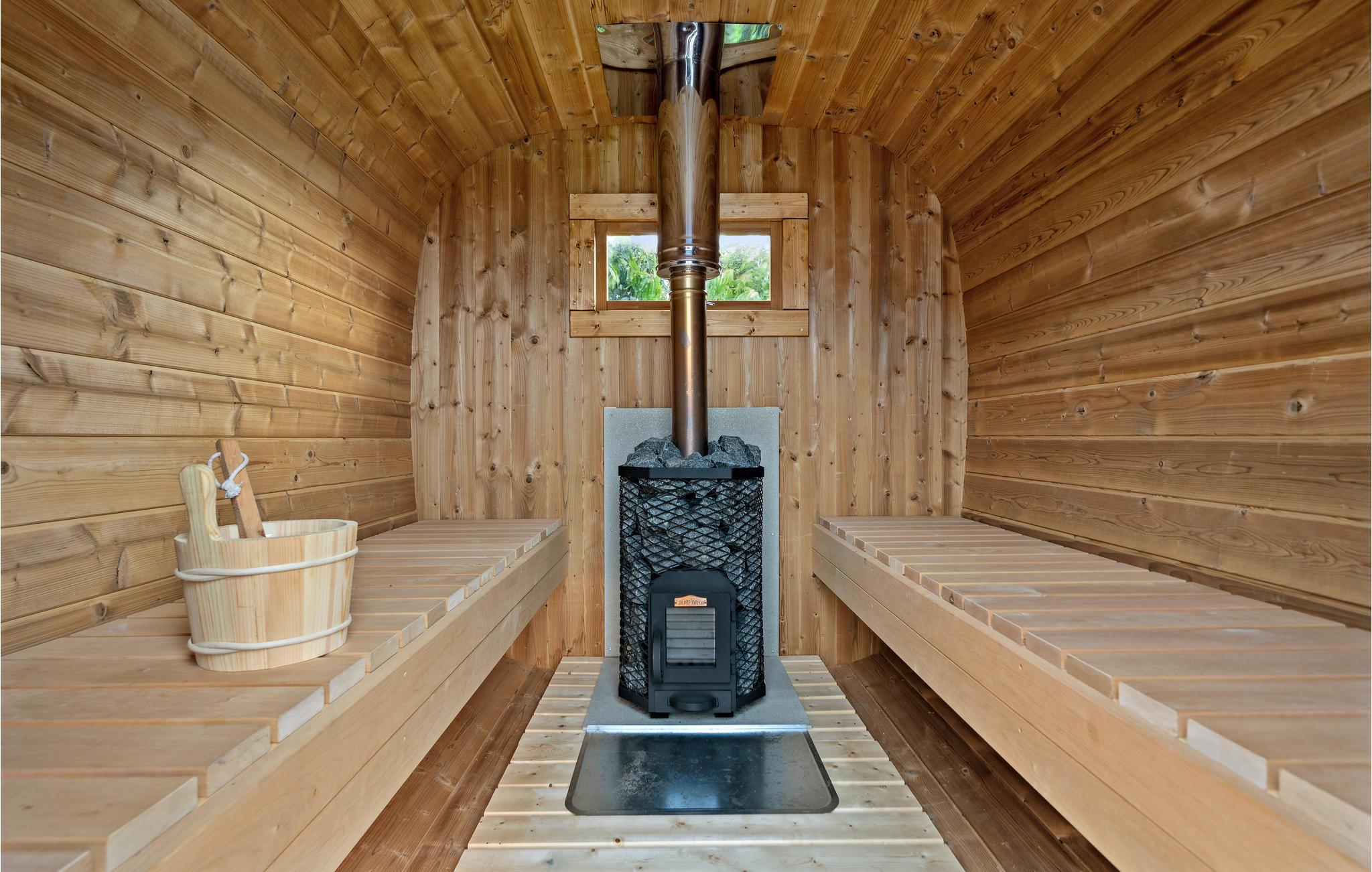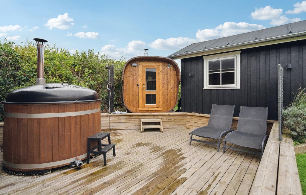 Het huis heeft een aparte outdoor wellnessruimte (op een 40 cm lager niveau, gemaakt van hout) met ligstoelen, buitendouches met warm water, een saunahut en een Fins bad (beide verwarmd met hout). Je kunt je eigen hout meenemen of kopen bij het huis. In de wellnessruimte kun je ongestoord zitten, ontspannen en jezelf verwennen na een lange dag op de Limfjord. Er is een aangrenzend overdekt terras.