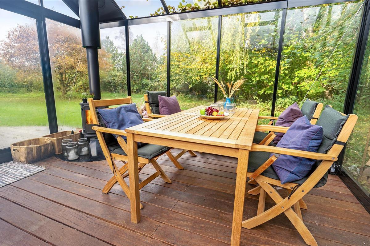 Stap 's ochtends met een kopje koffie het prachtige terras op en geniet van de eerste zonnestralen. Bij koeler weer kun je gezellig ontbijten in de serre, die je kunt verwarmen met een houtkachel. De groene tuin nodigt ook uit om te vertoeven: Verdiep je in een goed boek terwijl de kinderen in de tuin spelen. Verzamel de familie 's avonds rond de barbecue en geniet van de vredige sfeer.