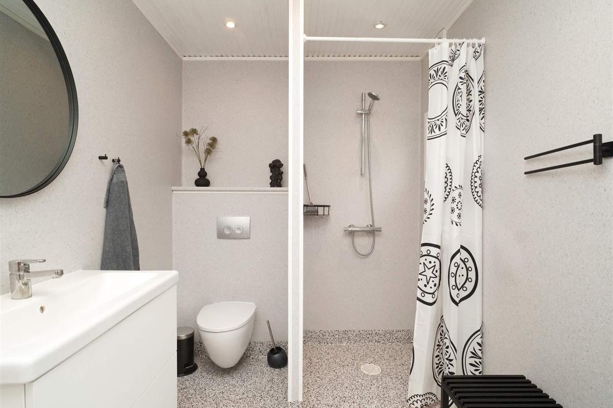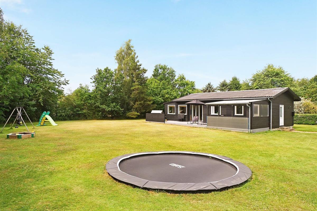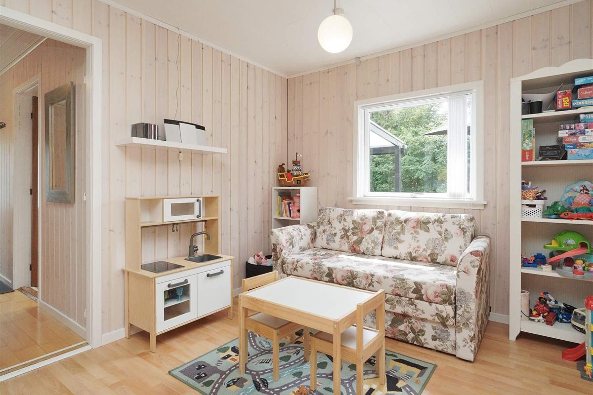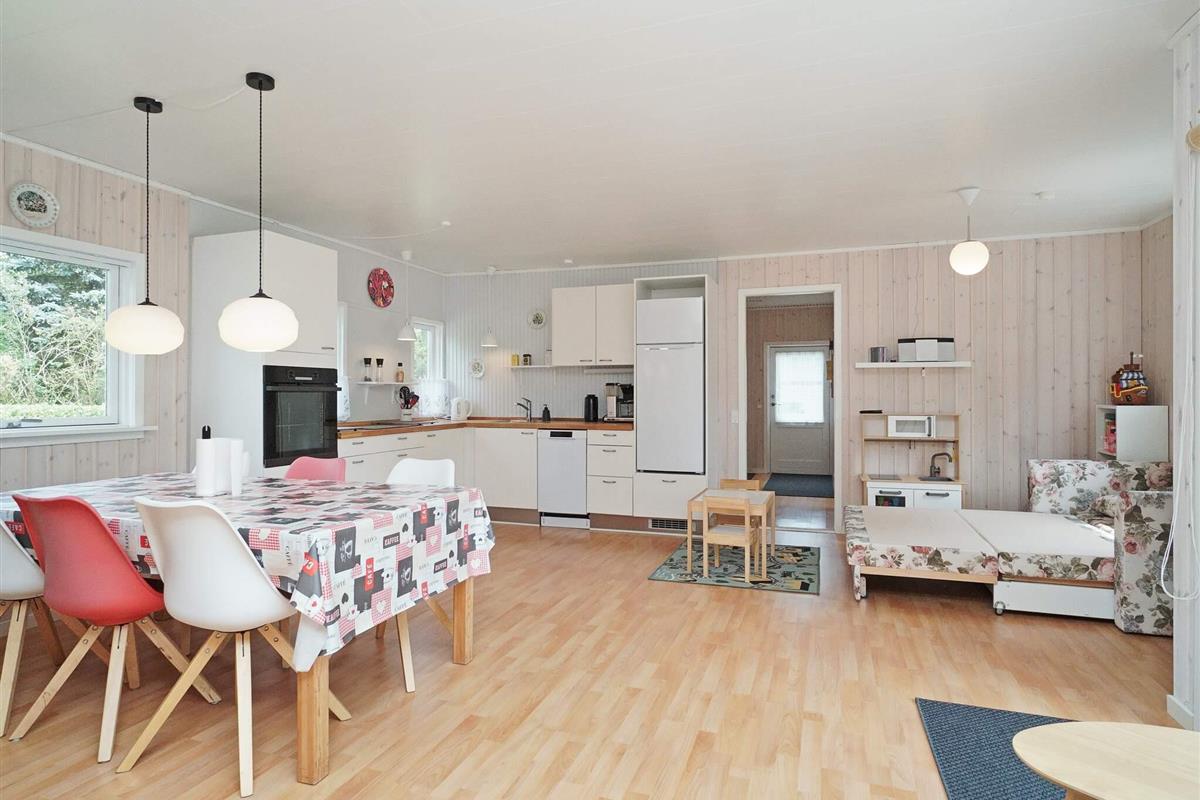 Der großzügige Garten bietet viel Platz für Aktivitäten und Spiele im Freien. Eine Hängematte lädt zum Entspannen ein, und an einer Seite des Hauses befindet sich eine praktische Außendusche. Der Fjord ist nur etwa 200 Meter entfernt und lädt zum Schwimmen, Angeln oder für gemütliche Spaziergänge am Wasser ein. Dieser Ort ist ideal für Familien oder Naturliebhaber, die einen ruhigen Rückzugsort suchen.