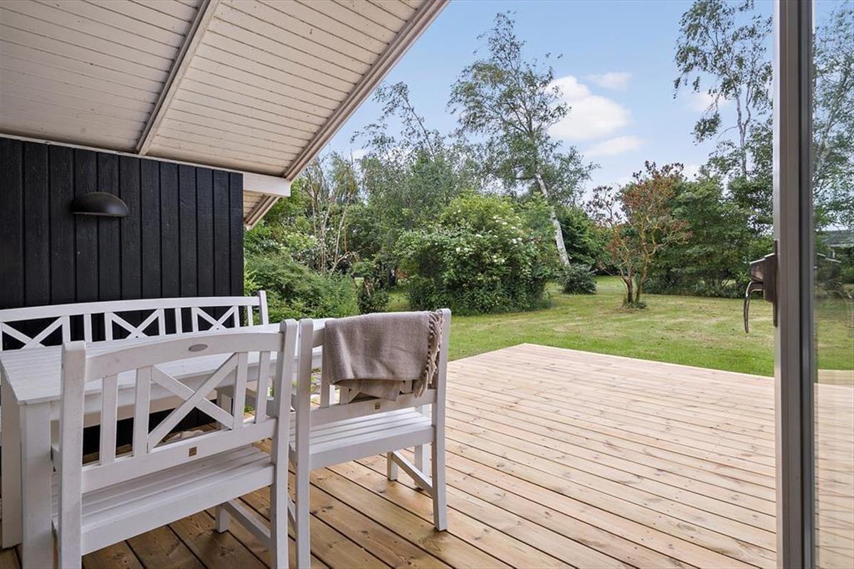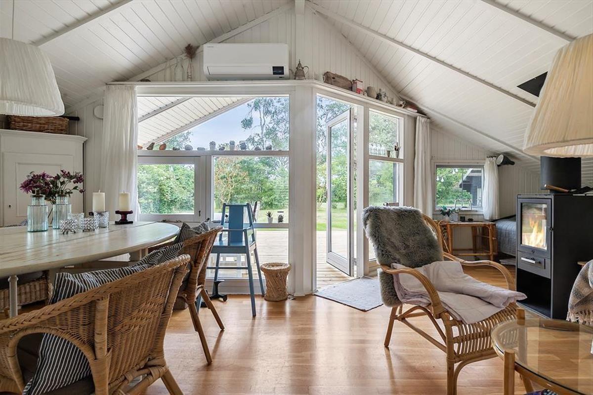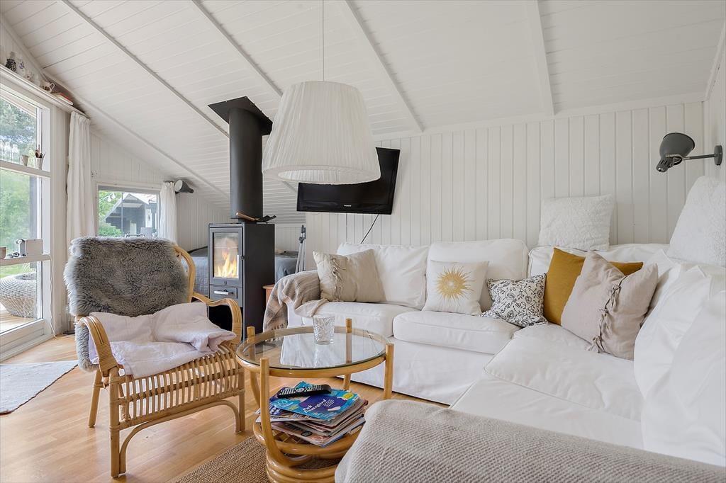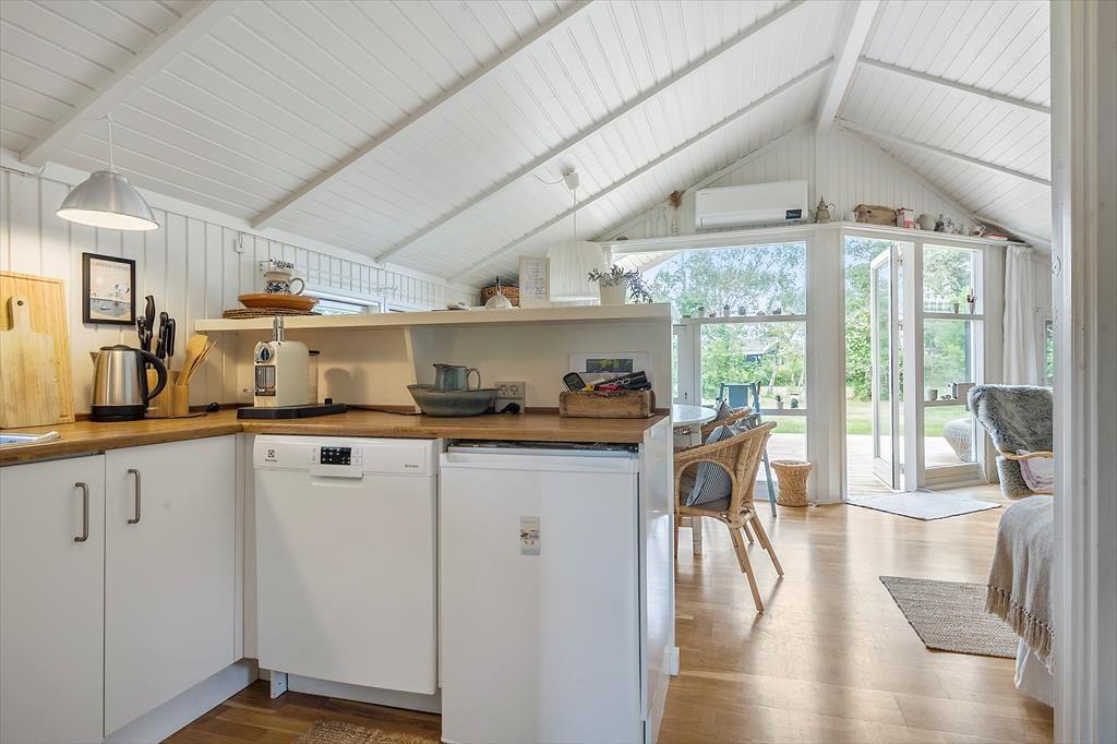 Tritt ein in den hellen Flur, von wo aus du direkt in Wohnzimmer Schlafzimmer kommst. Wohnzimmer, Esszimmer und Küche sind offen miteinander verbunden und laden zu geselligem Beisammensein und Entspannen ein. Der eingeheizte Ofen am Abend schafft die perfekte Ferienhausatmosphäre. Vom Wohnzimmer aus kommst ihr direkt auf die Terrasse und der Alkoven bietet ein zusätzliches Bett. Die Küche ist ausgestattet mit Gefrierschrank, Kochherd mit Backofen und Geschirrspüler, so dass ihr gut leckere Mahlzeiten zubereiten könnt. Das eine Schlafzimmer ist ausgestattet mit einem Doppelbett, das andere mit einem Einzelbett. Im Badezimmer gibt es eine Dusche, Waschbecken, Toilette und eine Waschmaschine.