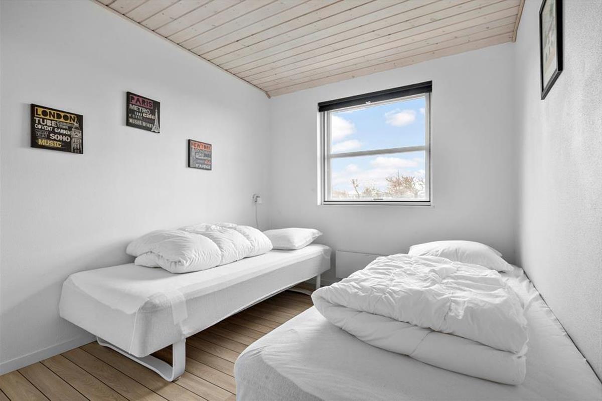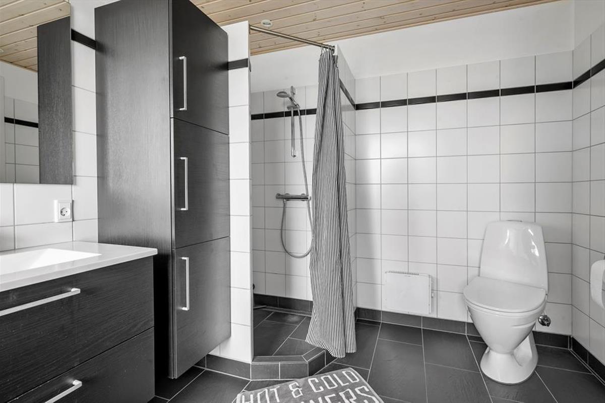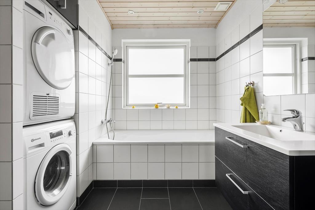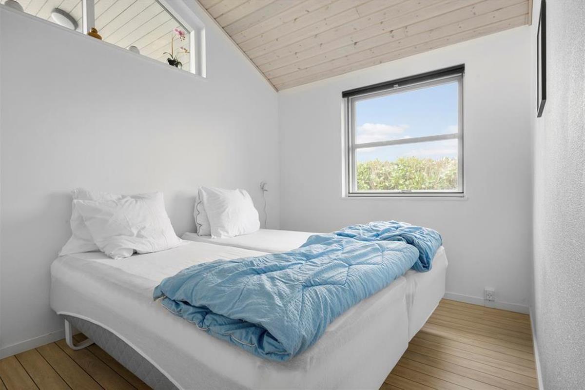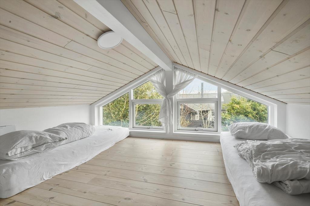 Das Haus bietet zwei geräumige Schlafzimmer – eines mit zwei Einzelbetten (90x200) und eines mit einem Doppelbett (180x200). Zusätzlich gibt es einen Hems mit weiteren Schlafmöglichkeiten auf Matratzen, die über eine breite Treppe mit Geländer leicht zugänglich sind. Das Badezimmer ist hell und modern gestaltet mit Dusche, Badewanne, Waschbecken, Toilette und Fußbodenheizung – perfekt zum Entspannen nach einem erlebnisreichen Tag.