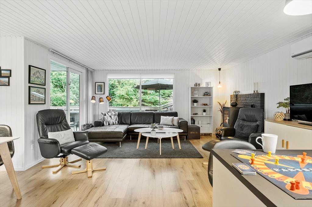 Die ganze Familie kann sich auf wunderbare Tage in diesem schwarz gestrichenen Holzhaus freuen. Mit drei Schlafzimmern und einem Badezimmer mit Dusche bietet das Haus Platz für sechs Personen und auch zwei Haustiere. Die offene Gestaltung von Küche und Wohnzimmer macht den Wohnbereich ideal, um gemeinsam Brettspiele zu spielen, Kaffeepausen zu genießen oder gemütliche Momente zu teilen. Wenn du dich richtig entspannen möchtest, kannst du dich in einem Sessel in der Nähe des Kaminofens zurücklehnen. Und wenn du die anderen mit einer Leckerei verwöhnen möchtest, kannst du in der Küche frische Brötchen oder Kuchen backen.