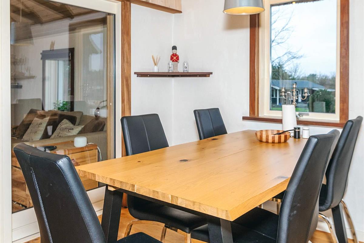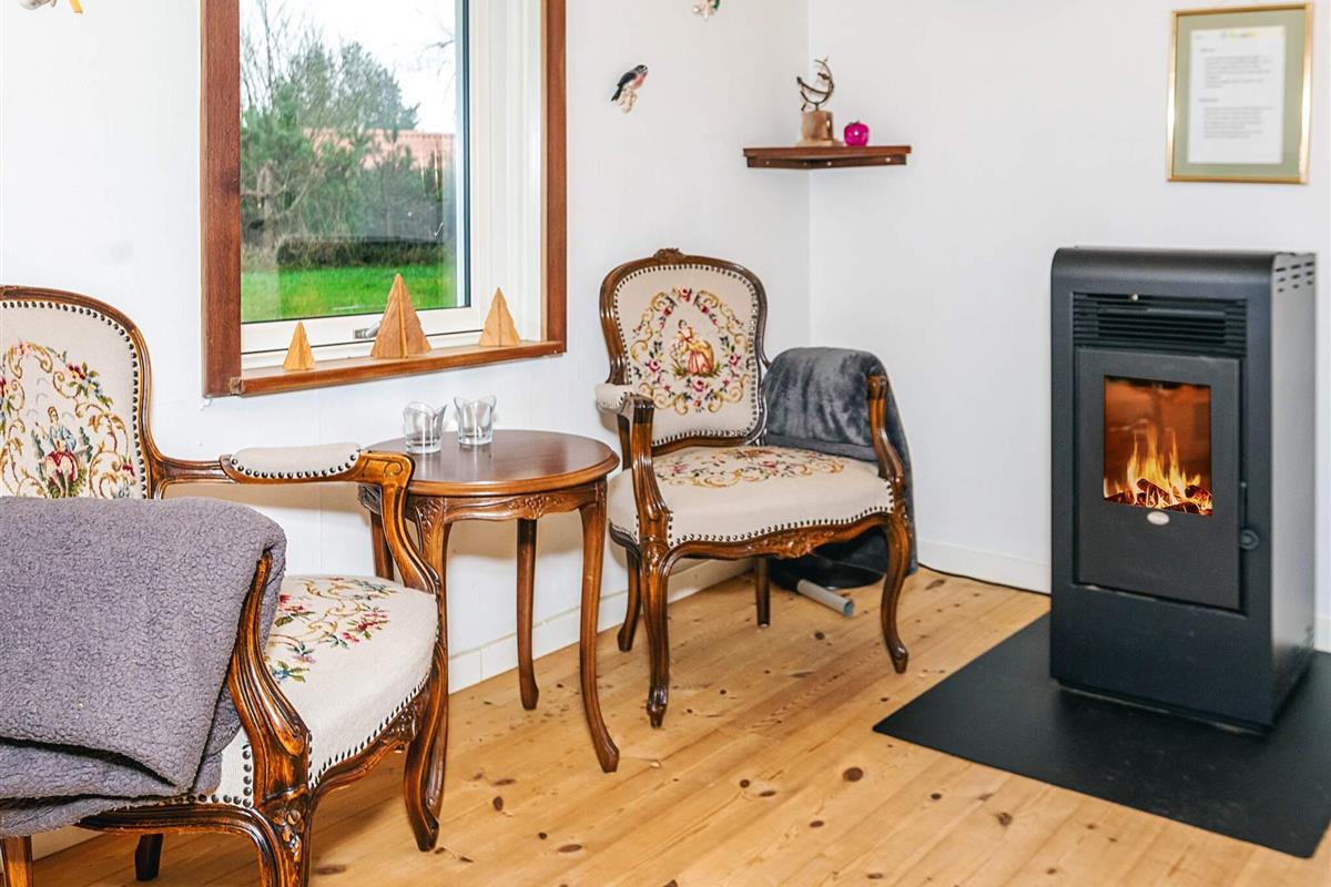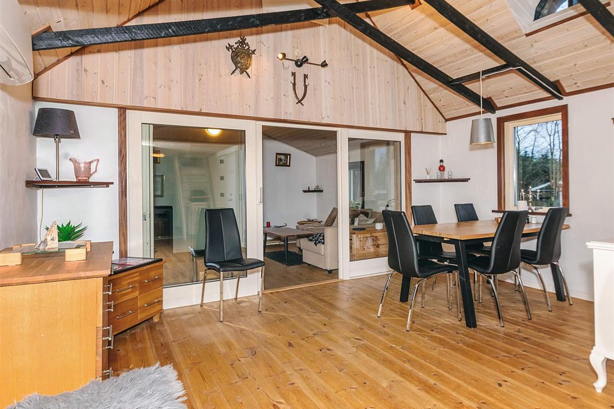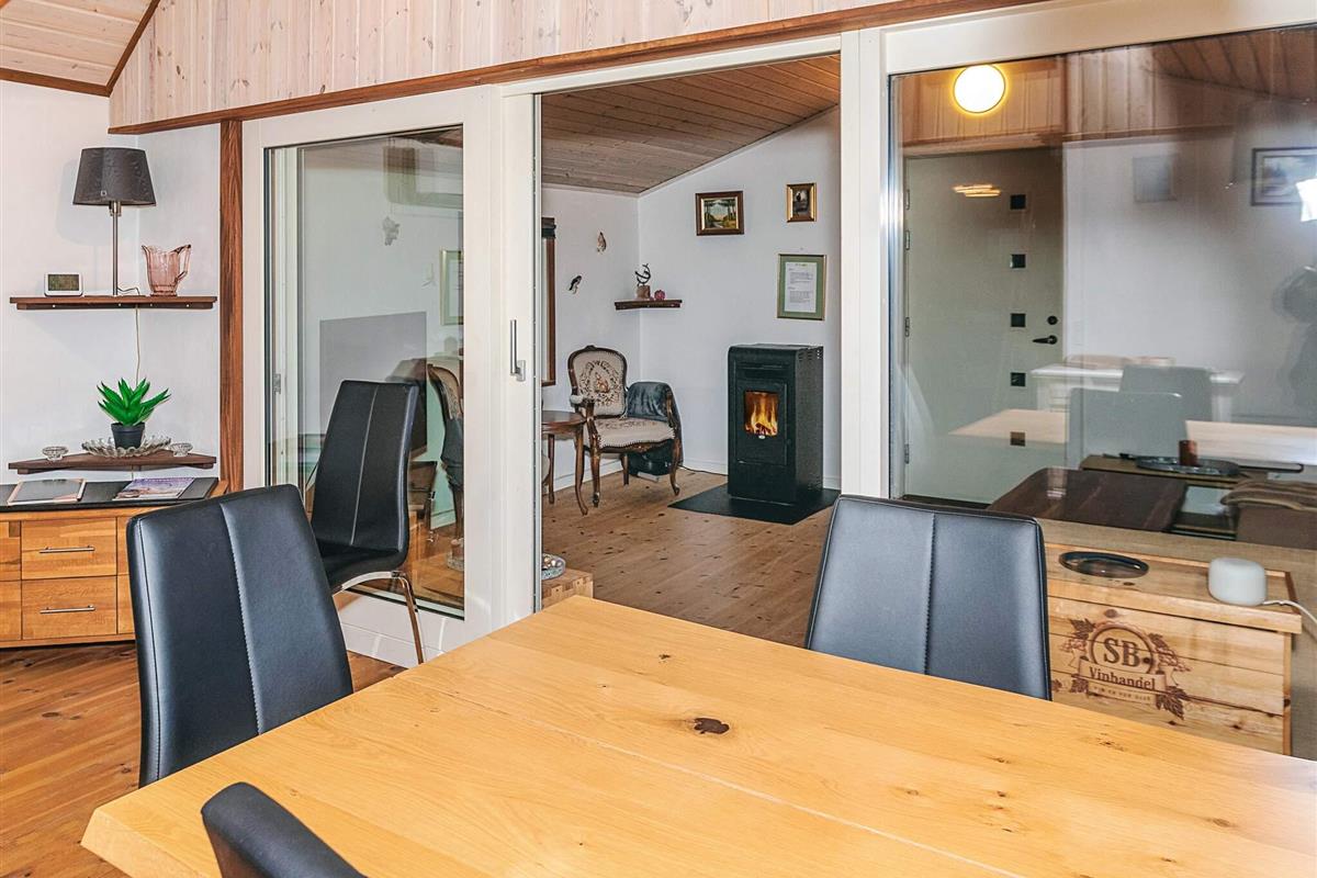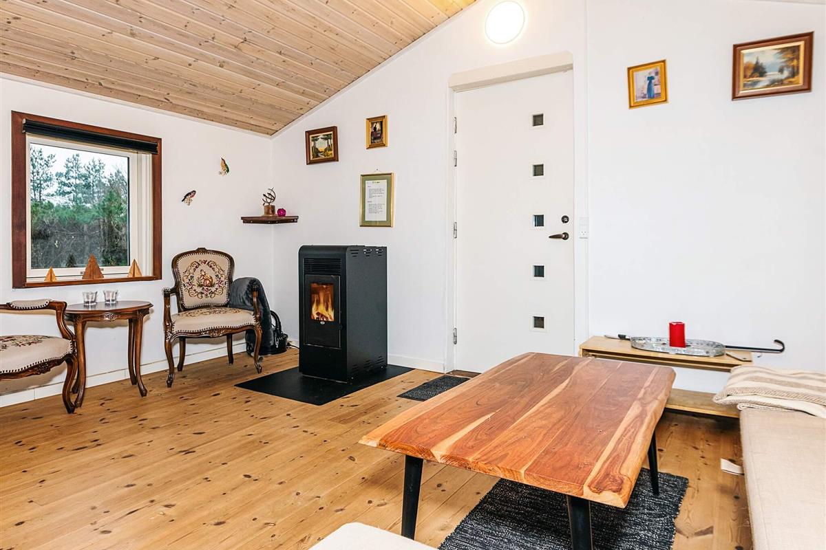 Mit seinem offene Küchen-/Wohnbereich bietet das Ferienhaus viel Platz für das Familienleben und für gemeinsame Aktivitäten. Von der offen integrierten Küche aus hat man sowohl Zugang zu einem der Schlafzimmer als auch zur Ostterrasse für das Frühstück im Freien. Außerdem Badezimmer mit Dusche, Fußbodenheizung und Dampfkabine im Haus. Darüber hinaus gibt es oben unter der Dachschräge ein Schlafzimmer sowie einen offenen Hems. Für kühlere Tage gibt es eine Wärmepumpe und einen Pelletofen im Haus, für den man 6 mm Pellets verwendet.