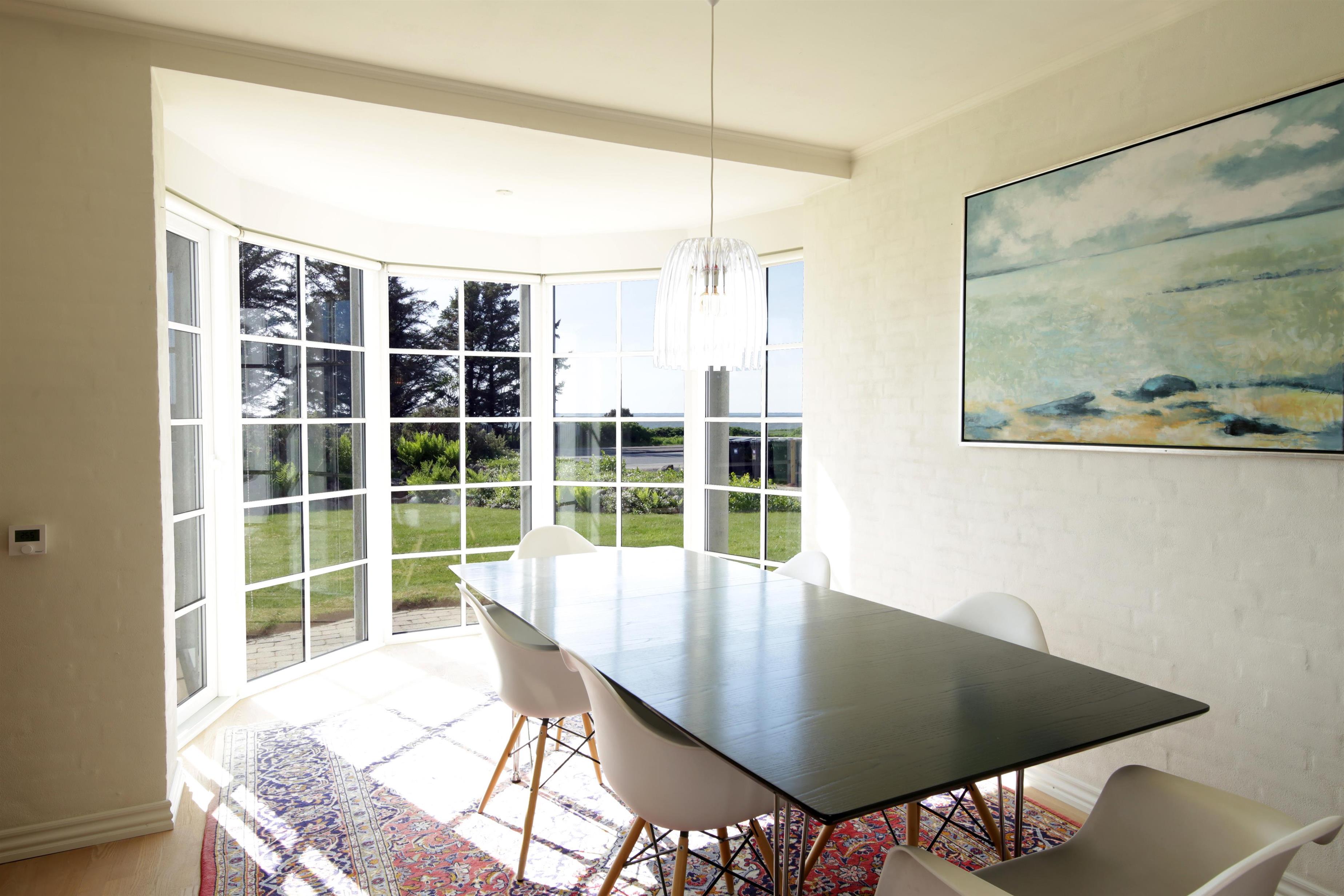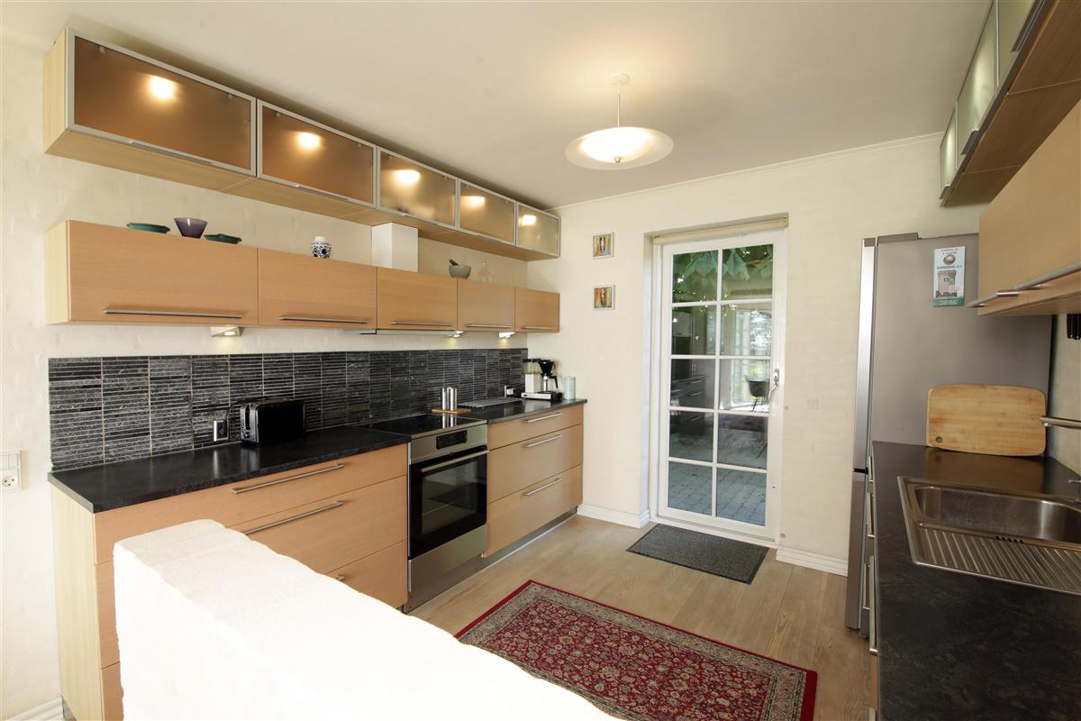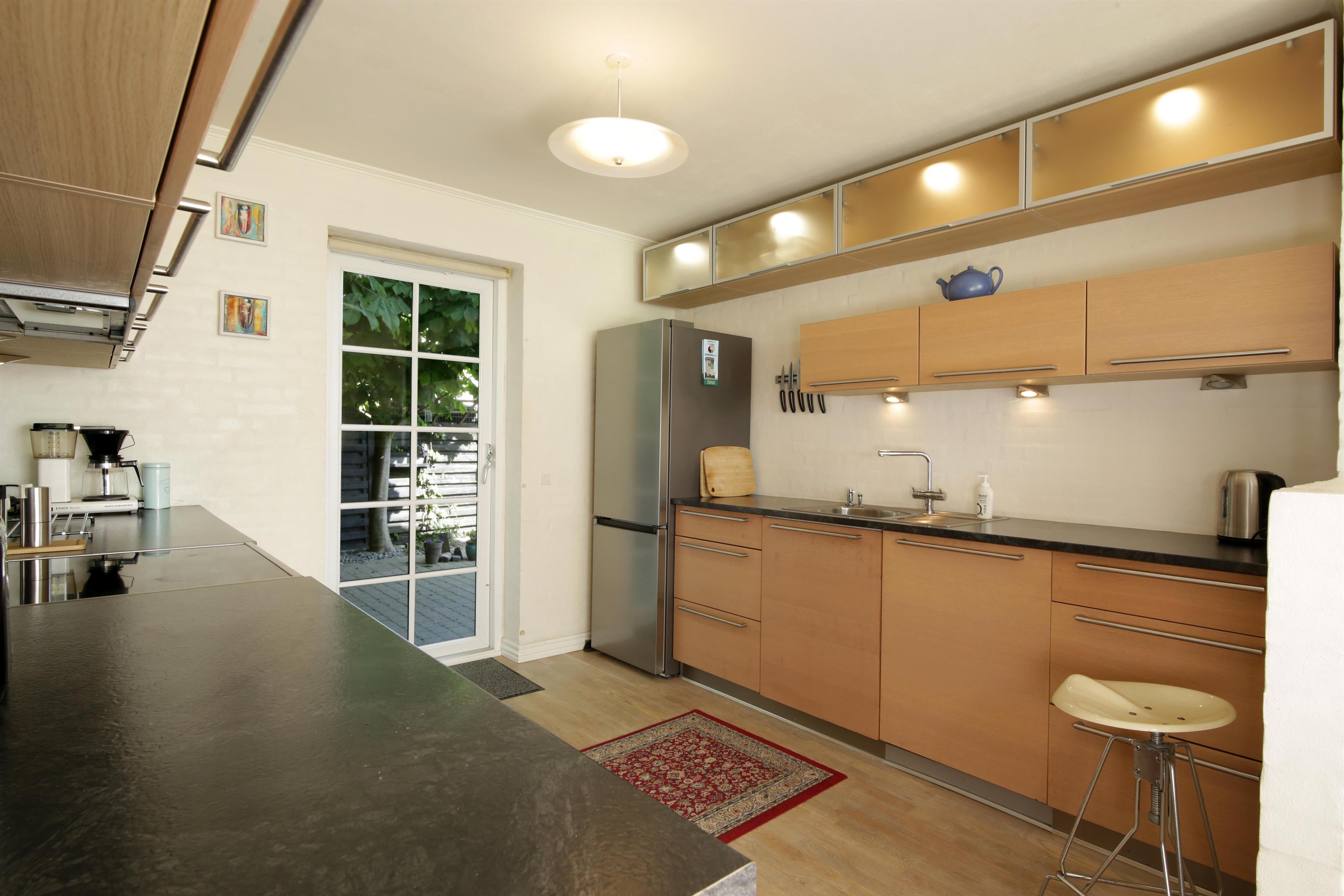 Dining area with a new kitchen with dishwasher, washing machine, cooker with oven, cooker hood and a fridge with freezer.