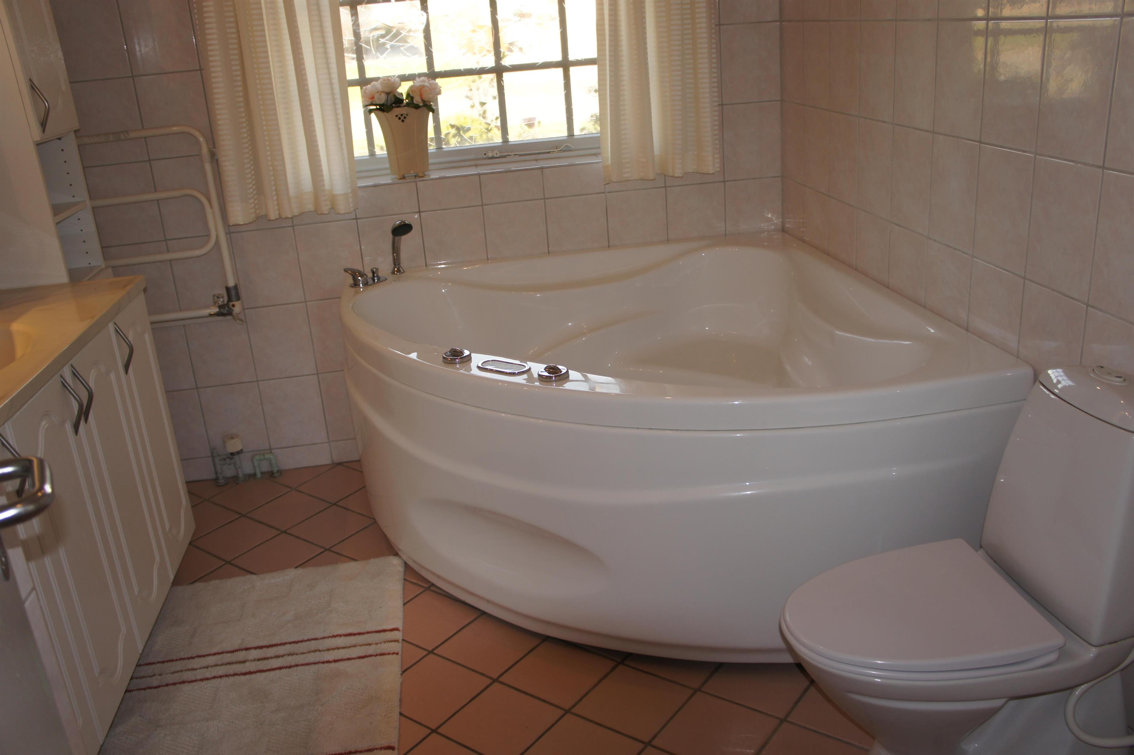 The bathroom is with underfloor heating, spa, shower, sink and toilet.