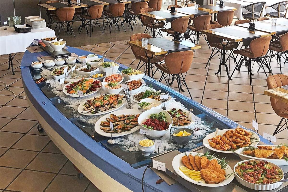 Buffets und Grill auf der Terrasse. Das Restaurant Klinten ist eine