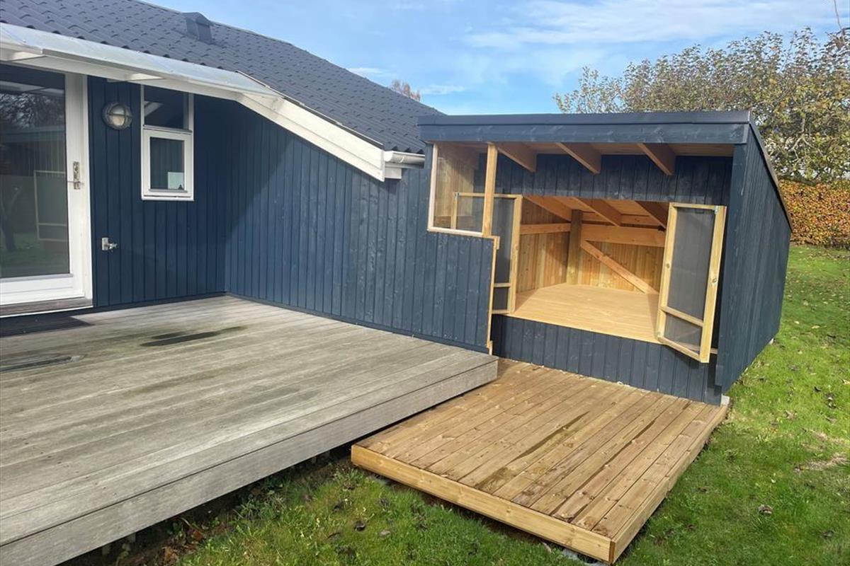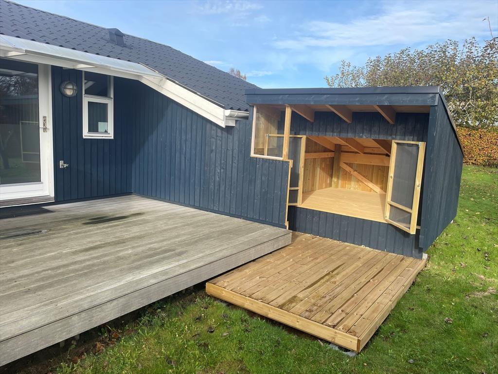 Vom Wohnraum gelangen Sie hinaus auf das abgeschirmte und teilweise überdachte Terrassenareal mit Gartenmöbeln. Von hier aus kommen Sie in den Genuss eines herrlichen Ausblicks über Kalø Vig und die Aarhus Bucht. Der schöne Strand ist mit einer Entfernung von lediglich 250 Metern schnell erreicht.