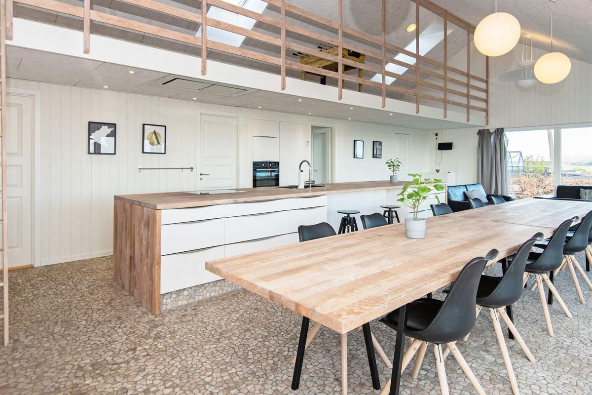 Dieses geräumige Ferienhaus mit Blick auf den Følle Strand und nur 400 Meter vom nächsten Sandstrand entfernt bietet Familien und Gruppen einen perfekten Rückzugsort am Meer. Mit vier Schlafzimmern und einem großen Badezimmer mit Whirlpool für zwei Personen ist das Haus auf Komfort und Entspannung ausgelegt. Der Wohnbereich mit seinen großen Fenstern und hohen Decken geht nahtlos in die offene Küche und den Essbereich über und schafft so eine helle und luftige Atmosphäre für Familientreffen und gemeinsame Mahlzeiten.