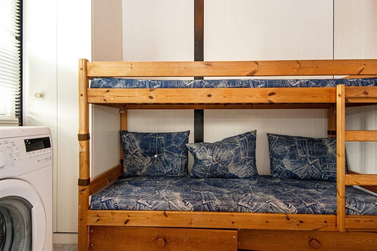 Das Haus bietet drei Schlafzimmer: zwei Zimmer mit jeweils zwei Einzelbetten, die auch zu Doppelbetten zusammengestellt werden können, und ein drittes Zimmer mit einem Etagenbett, das zwei Schlafplätze bietet – ideal für Kinder. Die offene Küche ist mit dem Essbereich und dem Wohnzimmer verbunden und schafft so einen einladenden Raum für gemeinsame Mahlzeiten und gemütliche Abende. Für Komfort sorgt eine energieeffiziente Wärmepumpe, während ein traditioneller Holzofen an kühleren Tagen für zusätzliche Wärme und Atmosphäre sorgt. Brennholz ist nicht im Preis inbegriffen.
