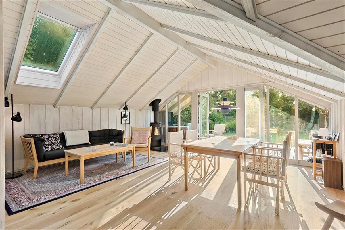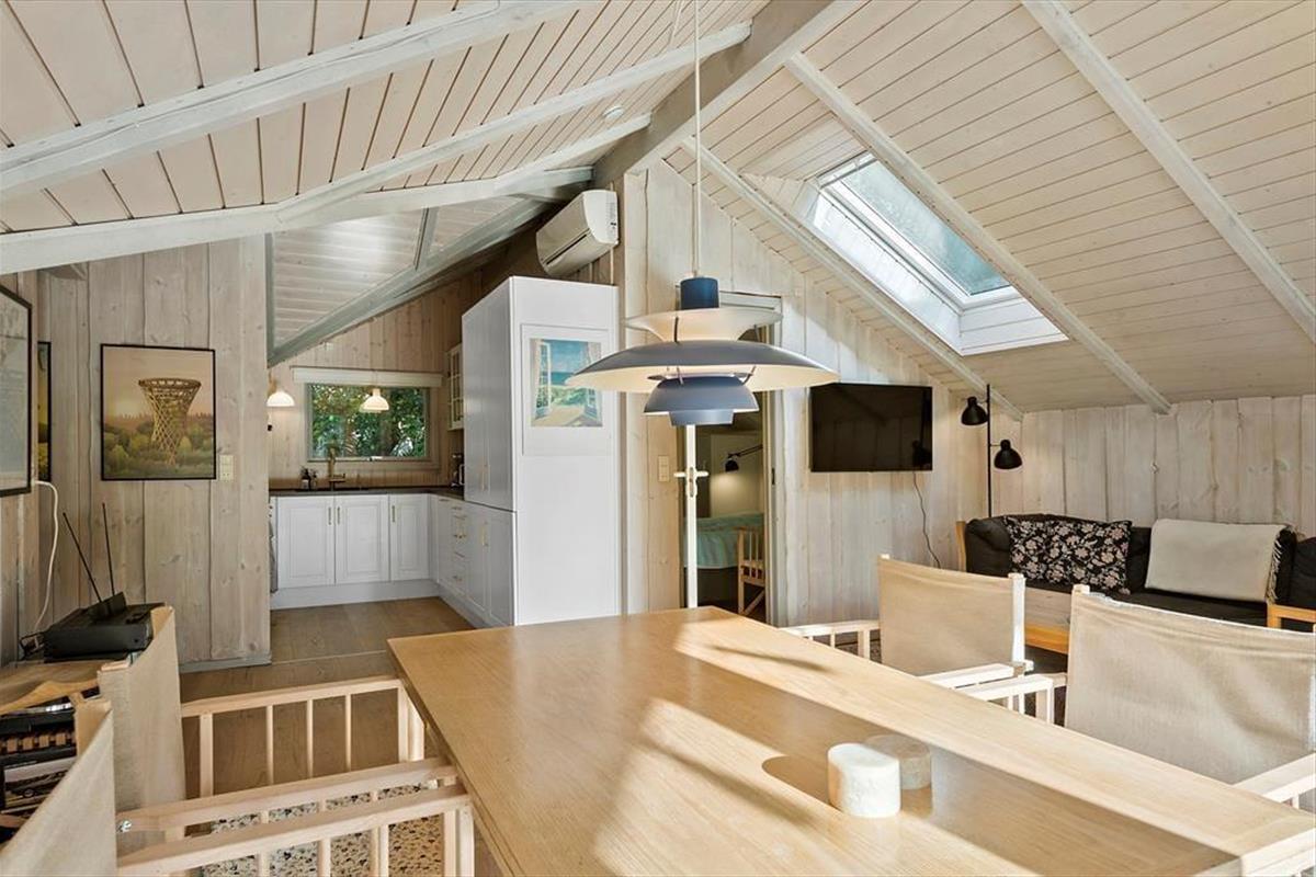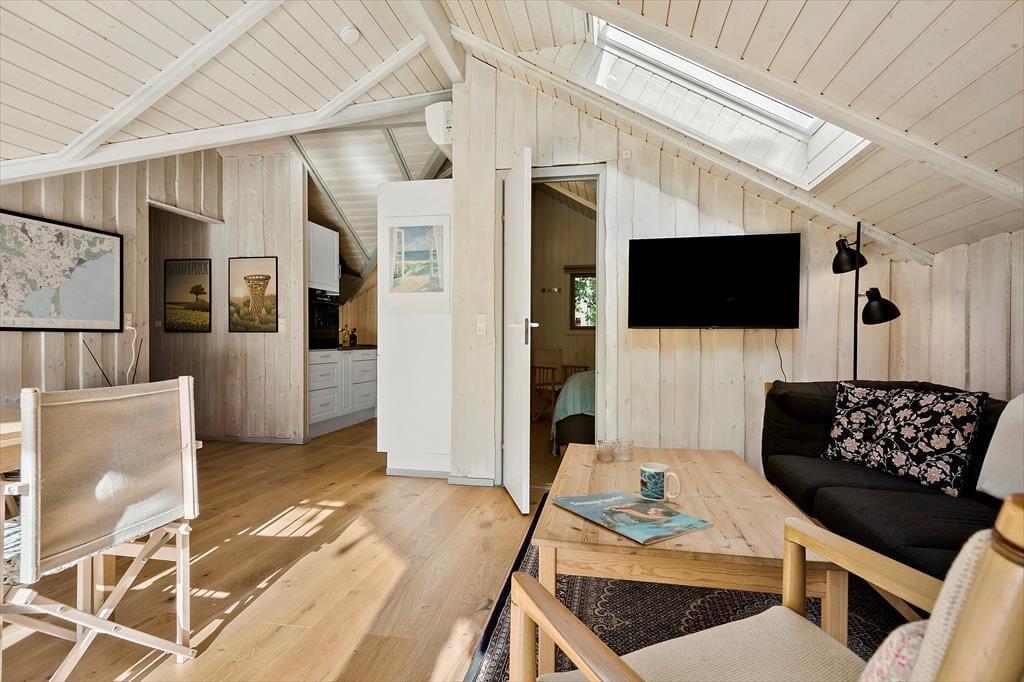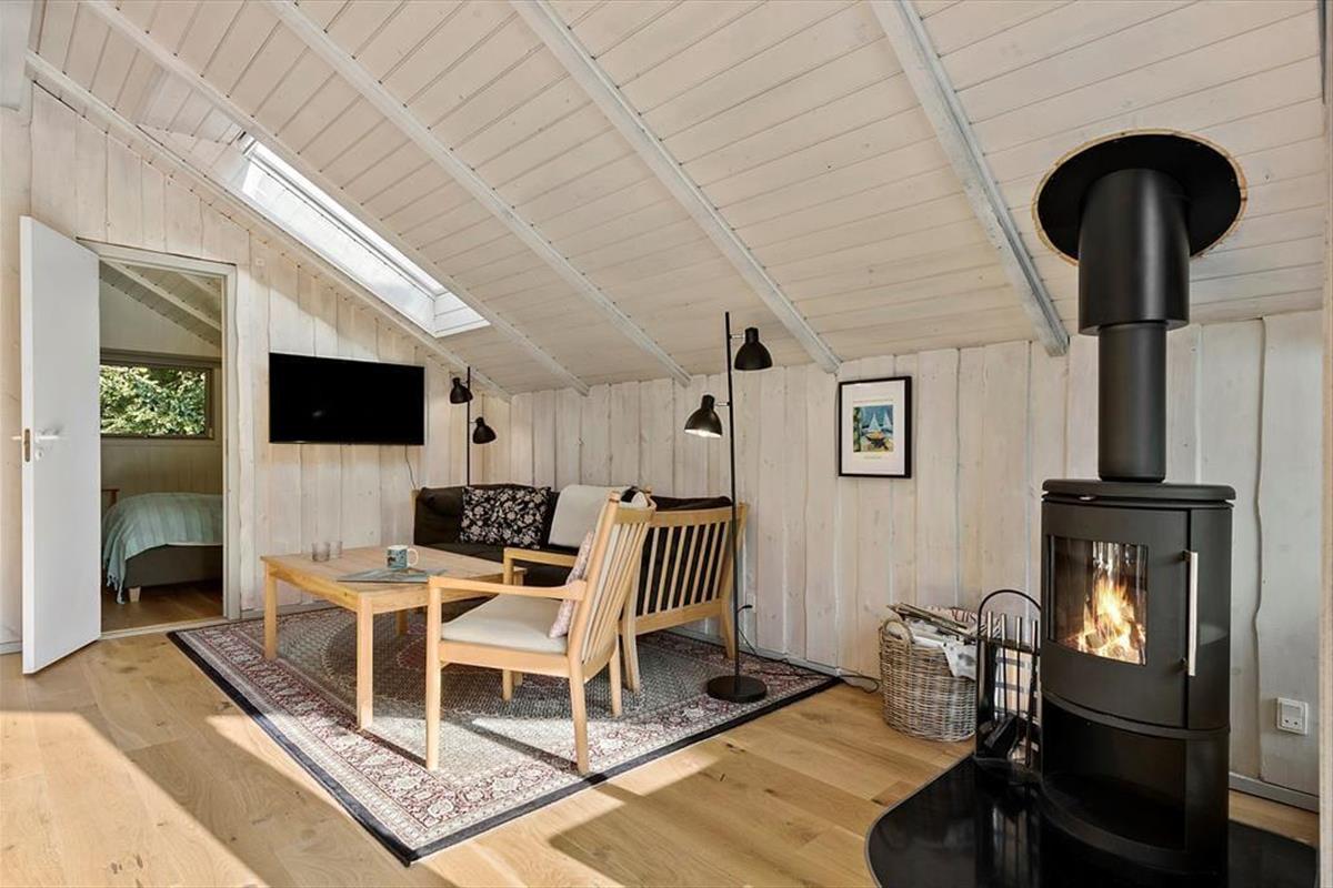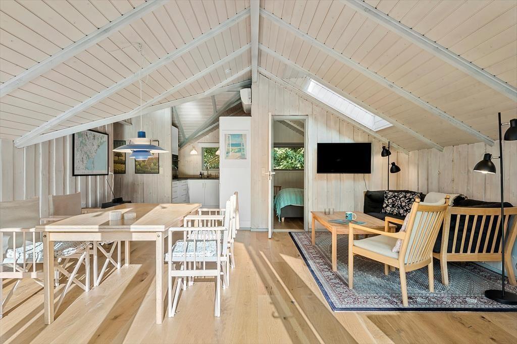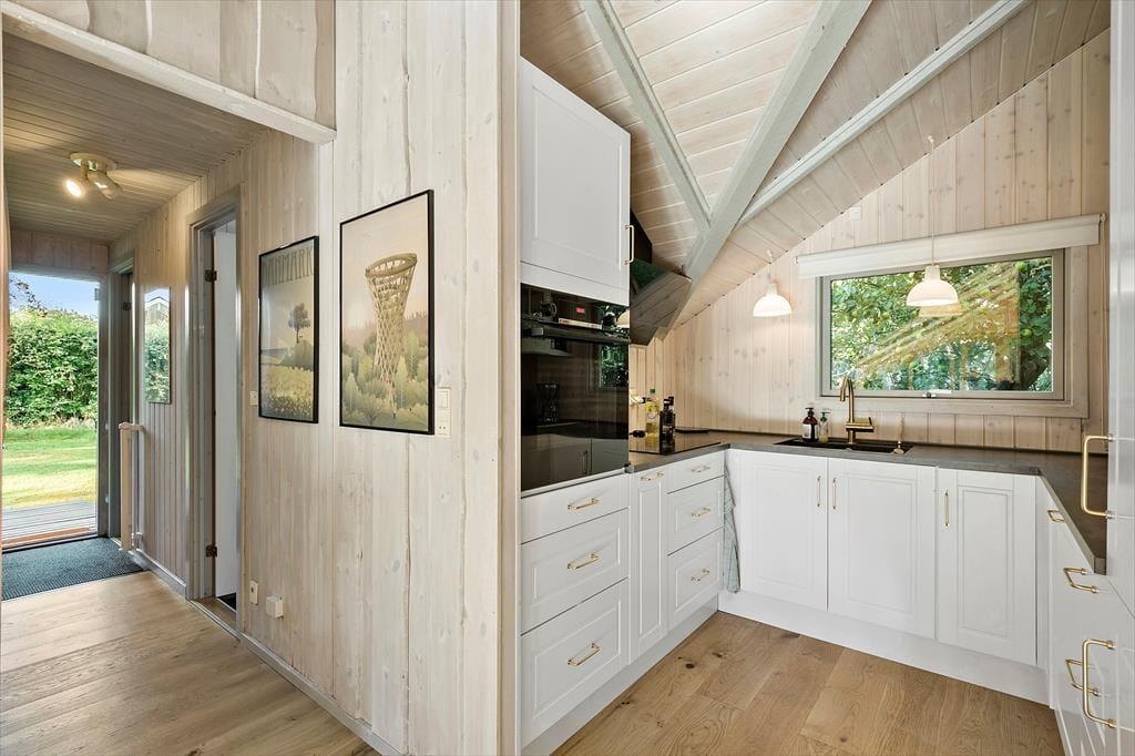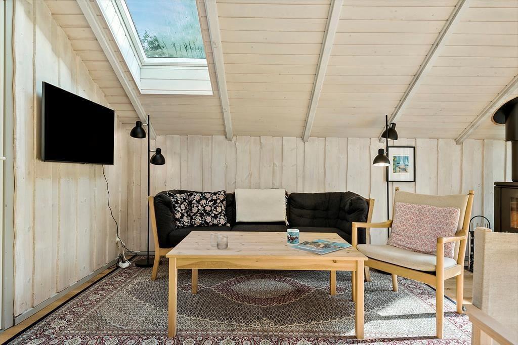 Dein hell und funktionell eingerichtetes Ferienhaus beinhaltet drei Schlafräume und bietet ausreichend Platz für erholsame Stunden im Kreise deiner Lieben. Im Wohnraum kannst du dich in spannende Bücher vertiefen, Filme anschauen oder dich einfach vom knisternden Feuer im Kaminofen verzaubern lassen. Untermalt werden deine entspannten Stunden im Wohnraum durch den Ausblick in den Garten. Die helle Küche fügt sich offen an den Wohnraum an, sodass du selbst bei der Zubereitung der täglichen Mahlzeiten die Nähe und Gesellschaft deiner Familienmitglieder genießt, die sich am Esstisch mit Kartenspielen vergnügen oder auf dem Sofa beisammensitzen. Vom Wohnraum gelangst du hinaus auf eine angenehm große, teilweise überdachte Holzterrasse und weiter in den ungestörten Garten. Ein Badezimmer mit Dusche und Fußbodenheizung ist vorhanden.