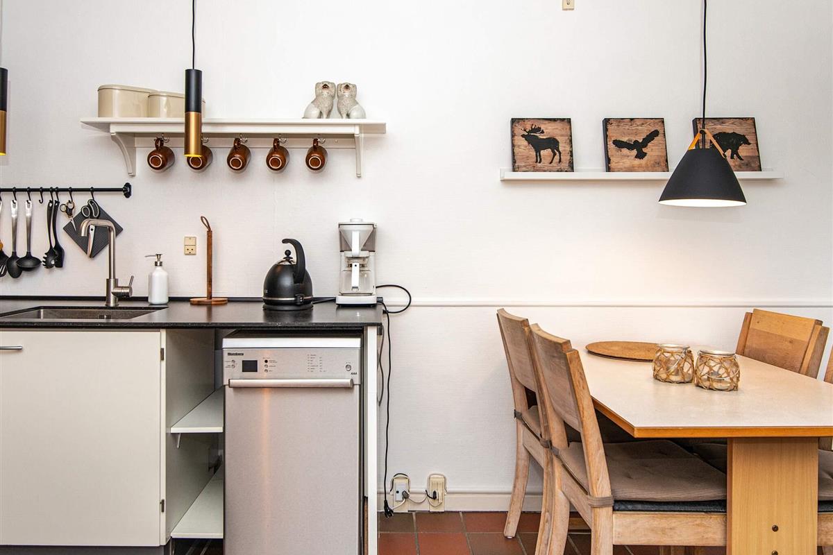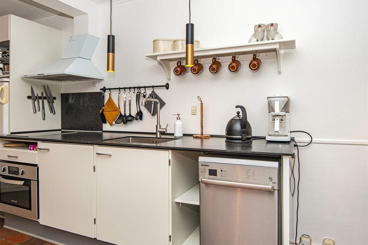 Off. Küche: E-Herd, Kühlschr. m. Gefrierfach, Kaffeem., Spülm.