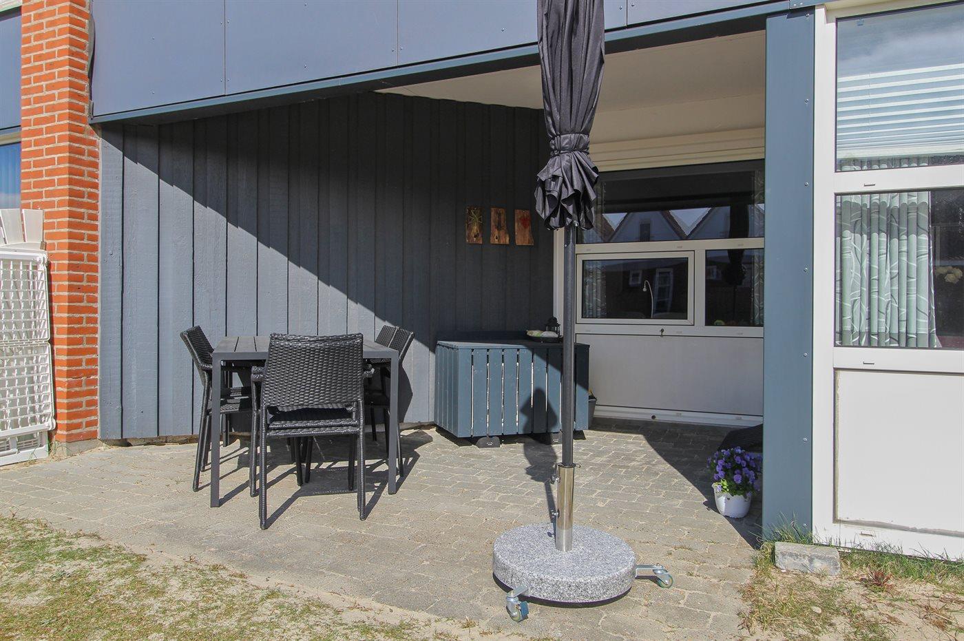 Comfortabel vakantieappartement op Fanø met warmtepomp, dichtbij zee en met overdekt terras.