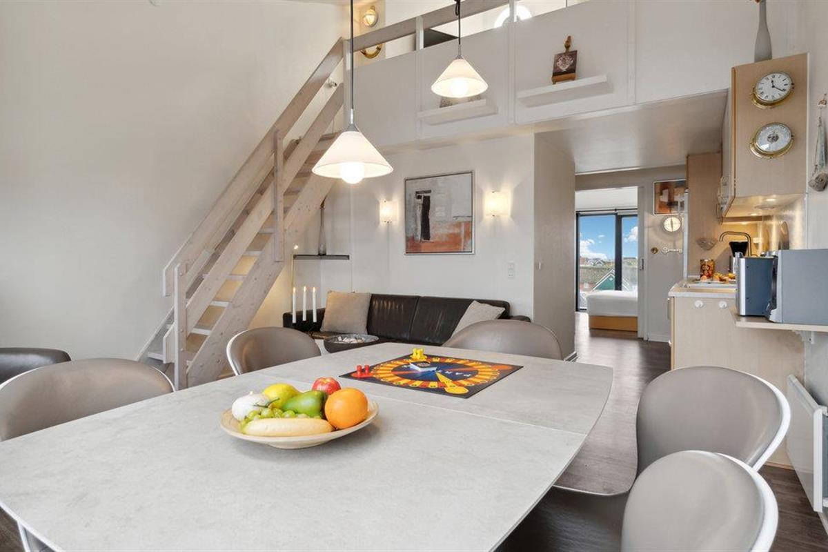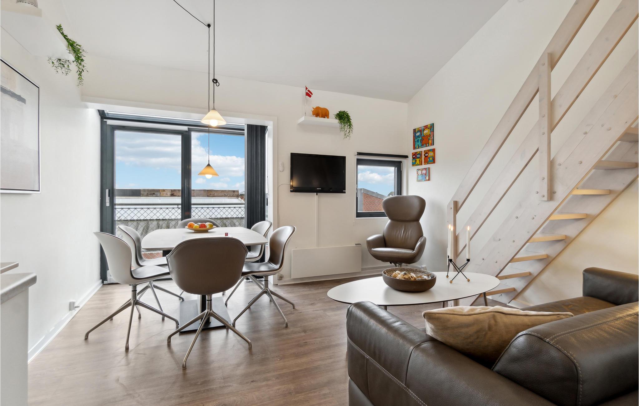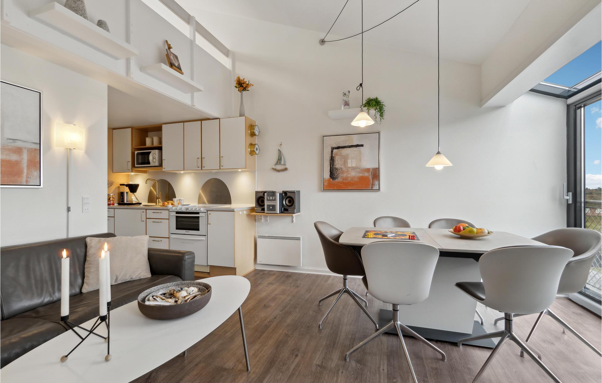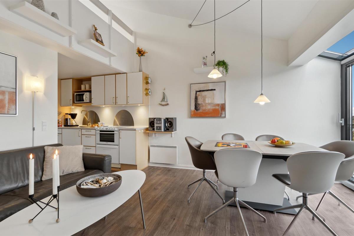 Dit gemoderniseerde vakantieappartement ligt op slechts een steenworp afstand van het brede zandstrand van Fanø en biedt een stijlvolle ambiance. De open woonkamer is smaakvol ingericht met designmeubels en creëert een gezellige sfeer met mooie details, kunst aan de muren en grote ramen. Begin de dag met een ontbijt in de lichte woon- en eetkamer en geniet van de frisse bries op het Franse balkon. De moderne loft biedt je extra comfort met een design ventilator die het klimaat aangenaam houdt.