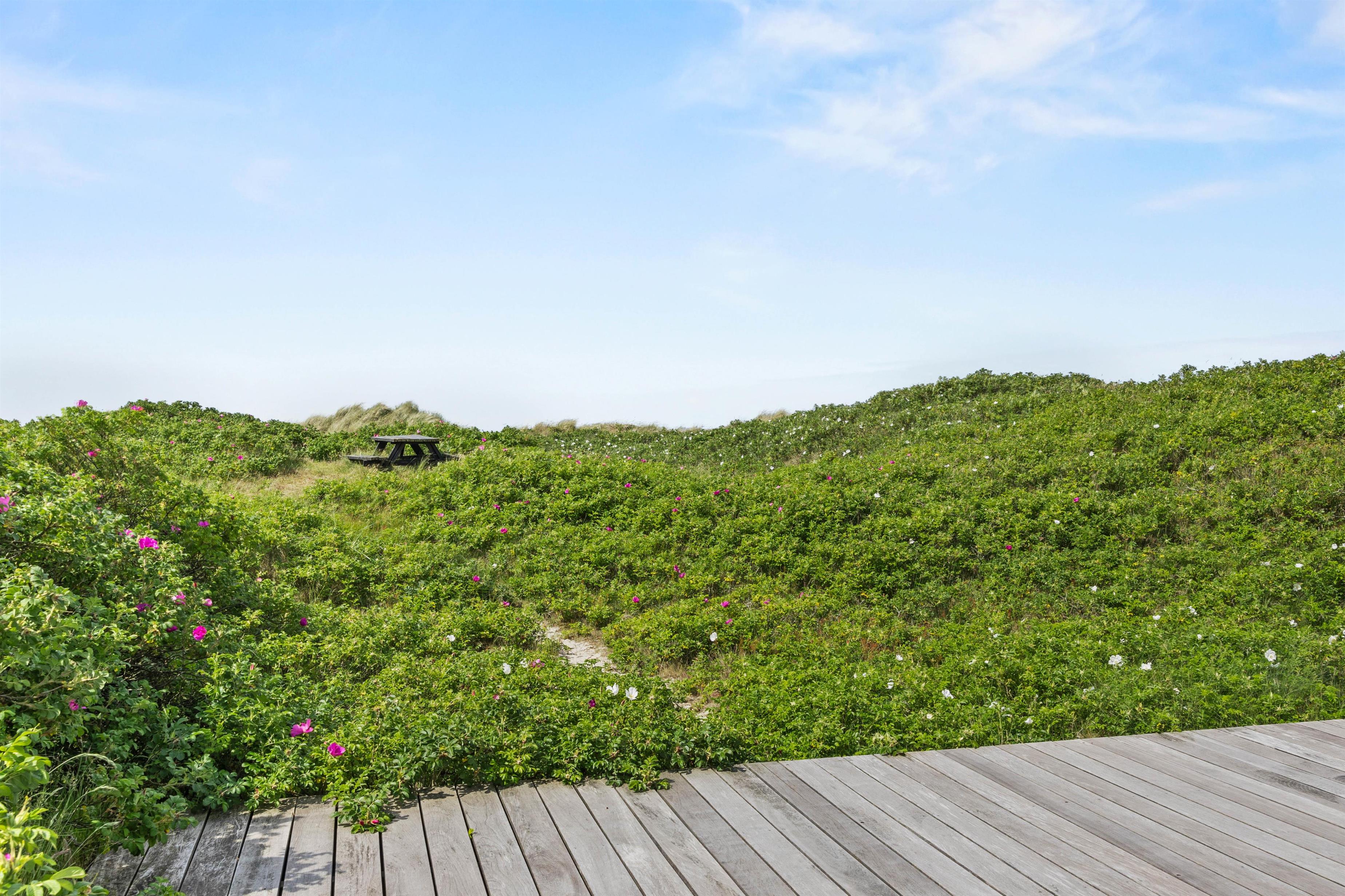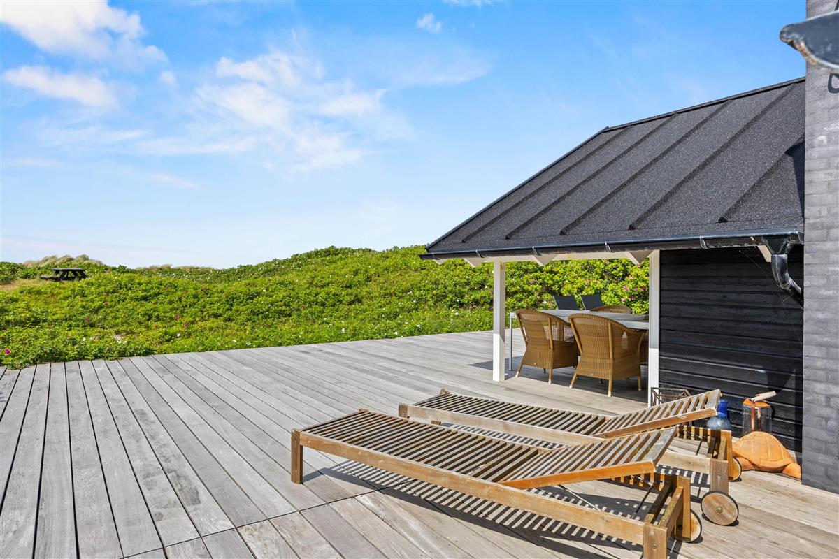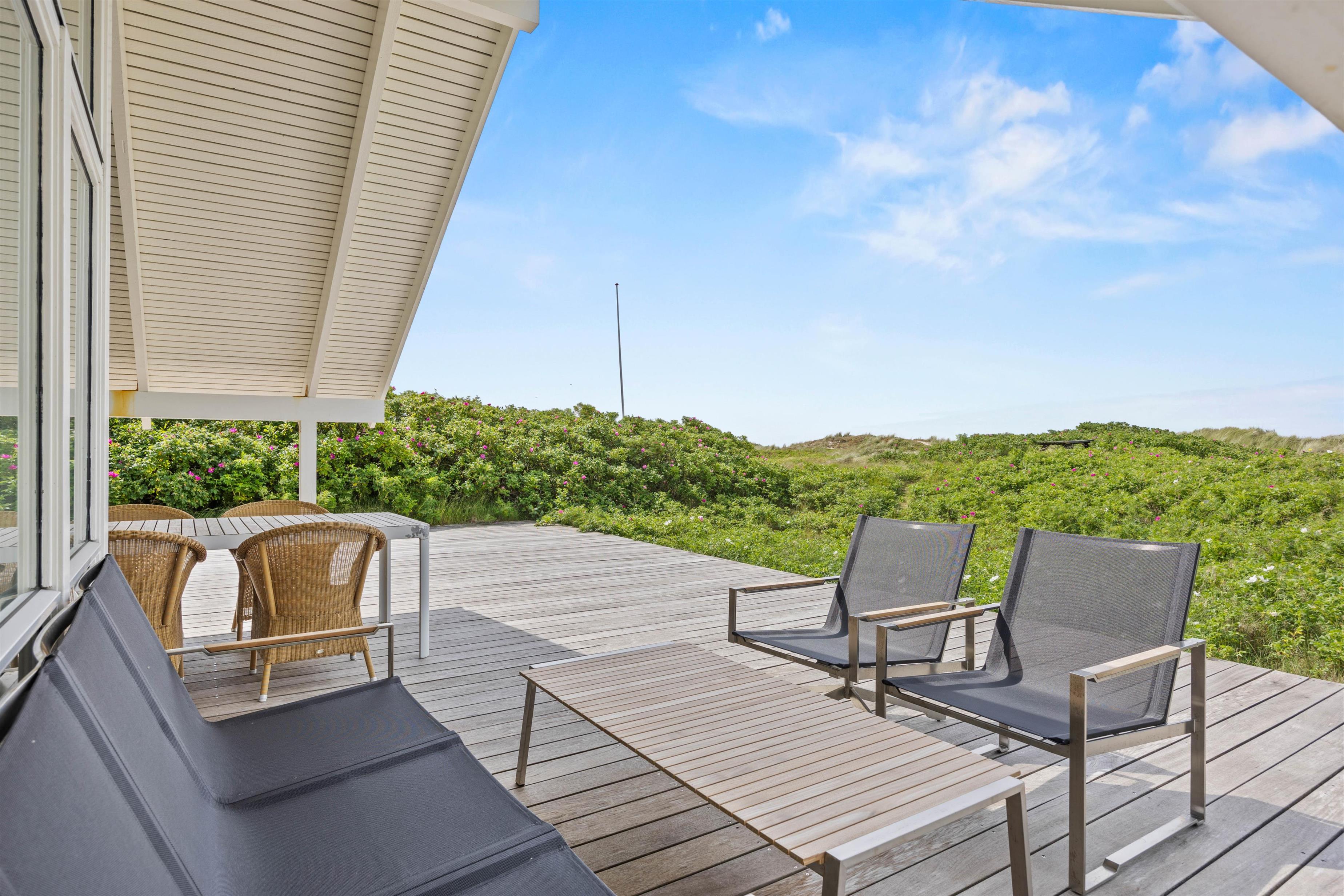 A beautiful wooden deck surrounds the holiday home - perfect for barefoot wandering while your steaks sizzle on the gas barbecue or while relaxing on the sun loungers. A few metres away, on slightly elevated ground, wooden furniture provides a unique vantage point for North Sea views and spectacular sunsets.