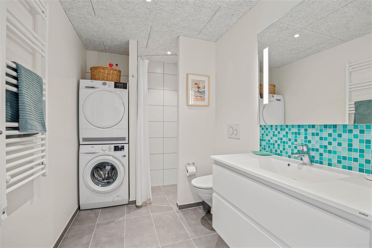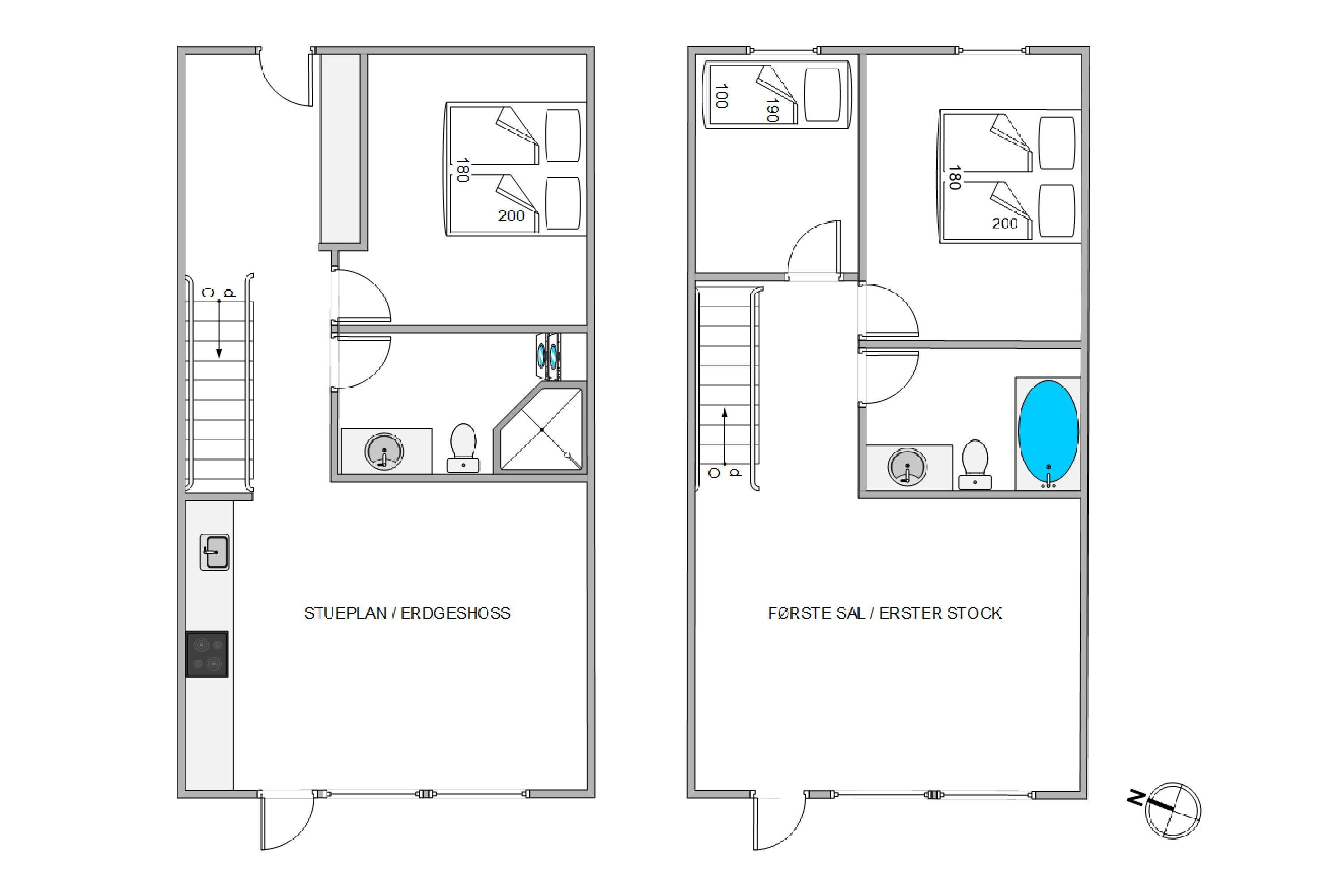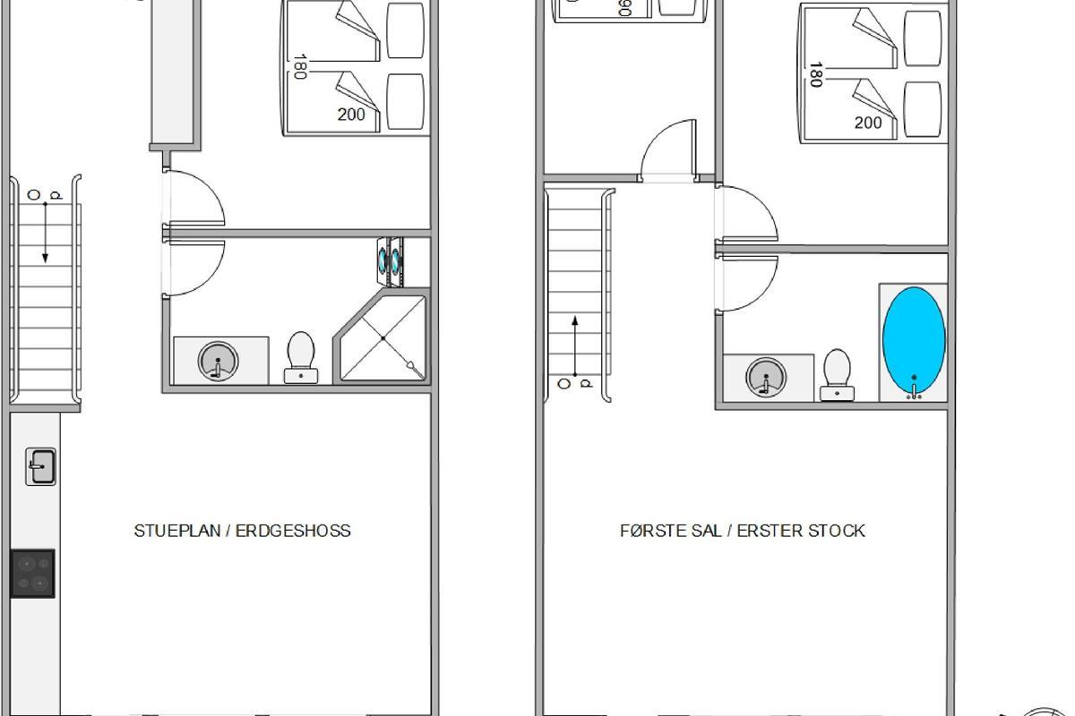 The holiday home offers two bedrooms with comfortable double beds (both 180 x 200 cm) and an additional room with bunk beds, perfect for children. There are two bathrooms, both with underfloor heating. The first-floor bathroom features a bath, while the other includes a shower, washing machine and tumble dryer. Both bathrooms benefit from heated towel rails. Whether travelling as a family or with friends, the layout is ideal with bedrooms and bathrooms spread across both floors.