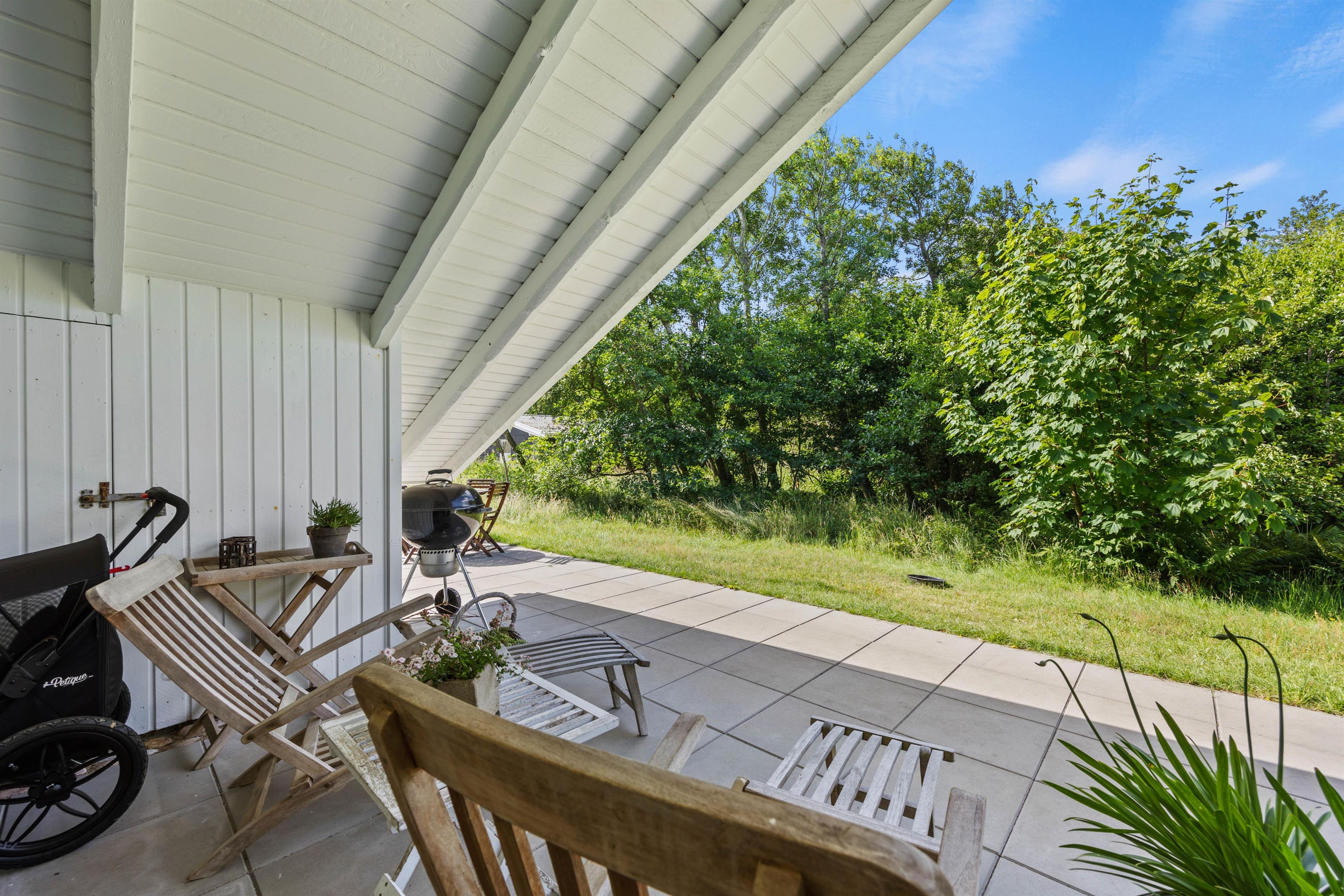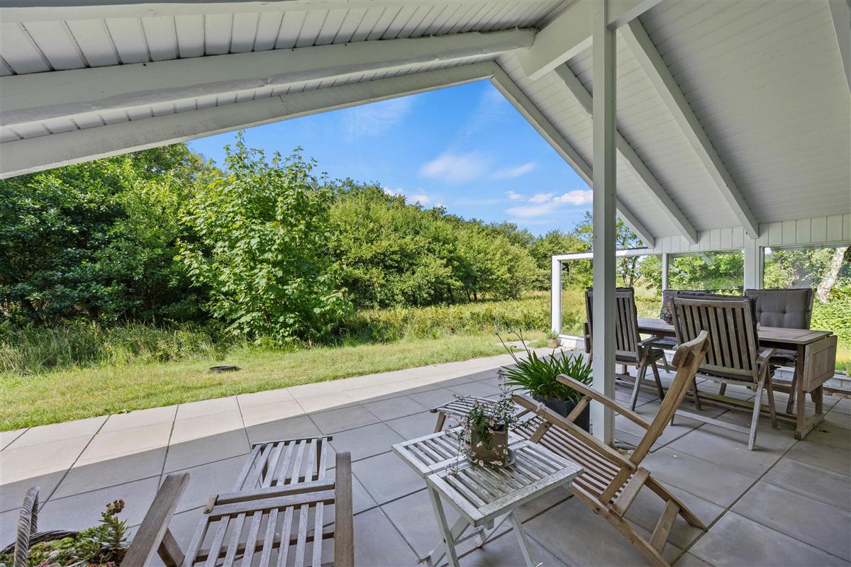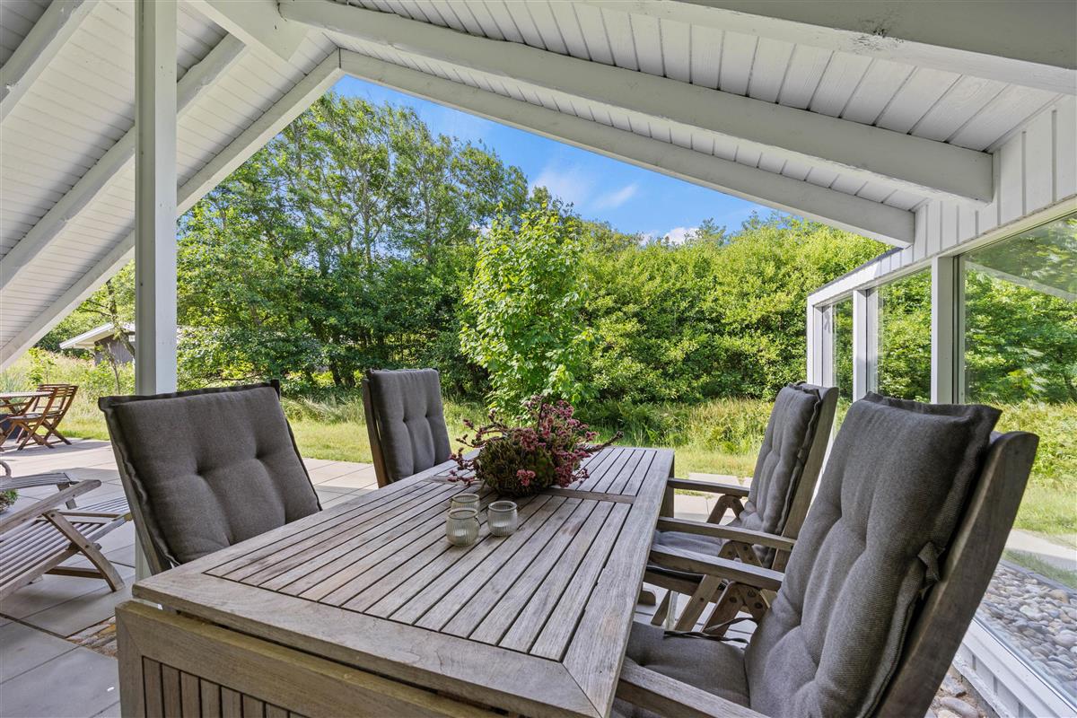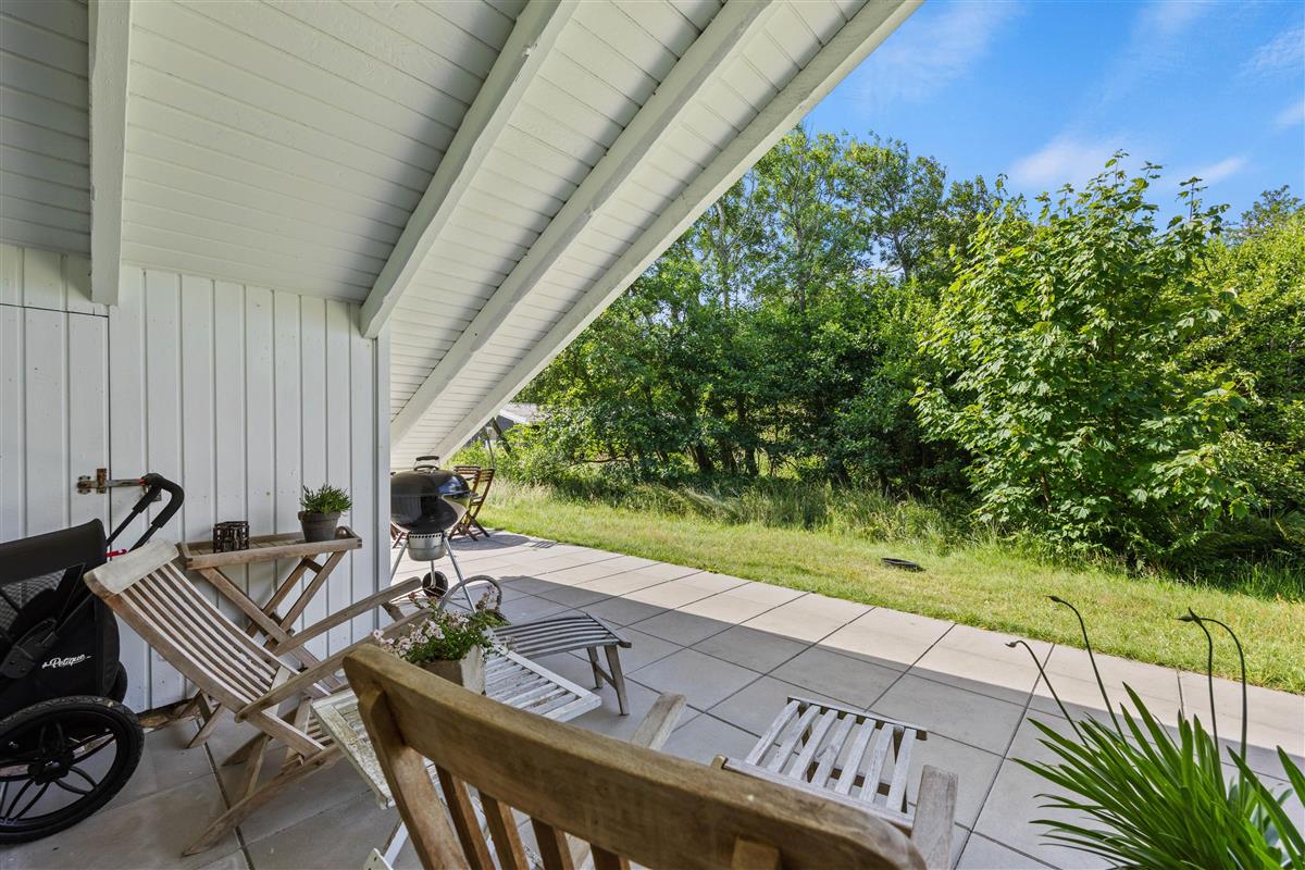 A lovely terrace, partially covered, wraps around two sides of your idyllic holiday home. Surrounded by approximately 1,900 square metres of natural grounds, you can enjoy complete privacy. The shrubs and trees provide excellent shelter from the wind.