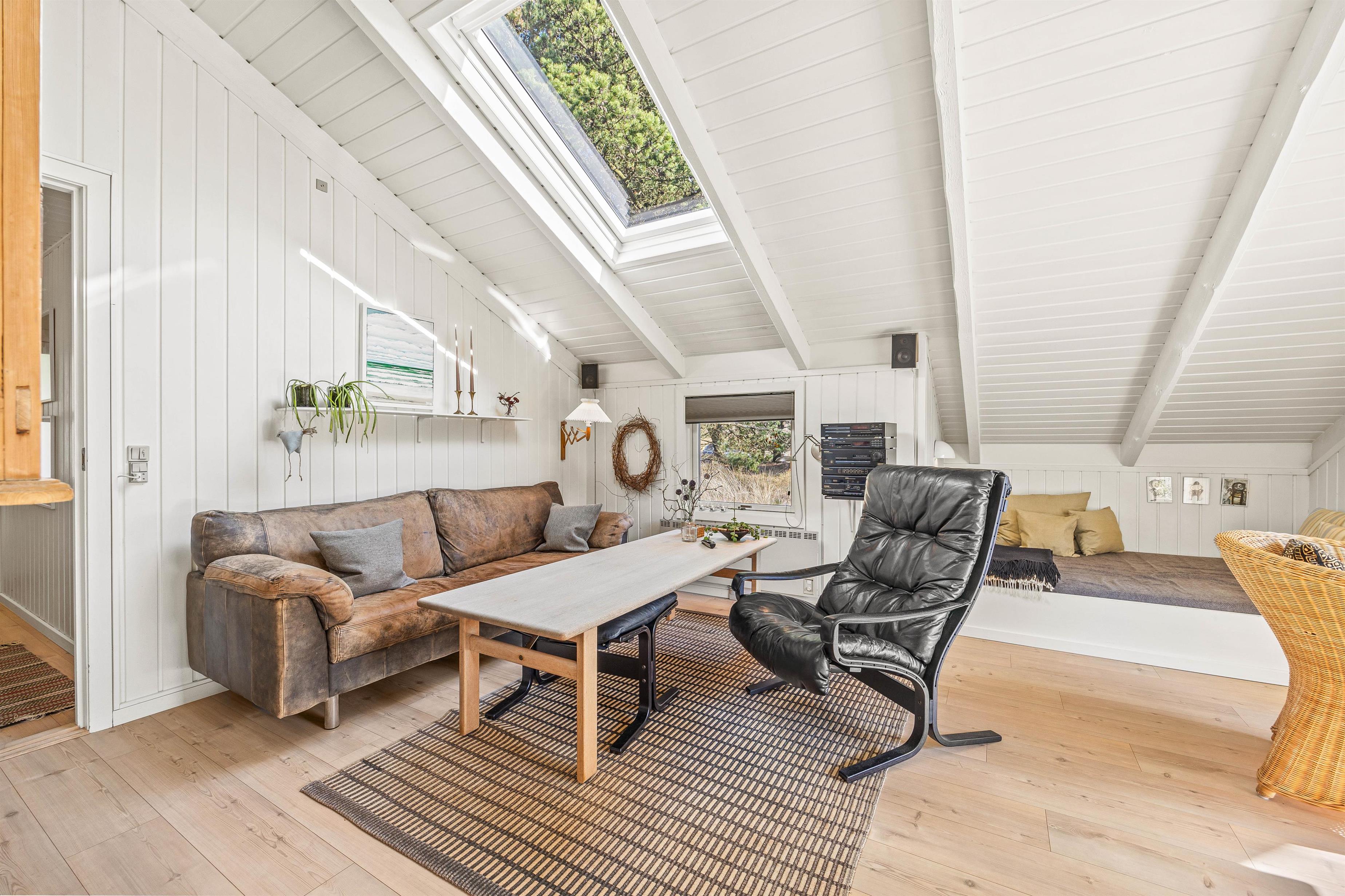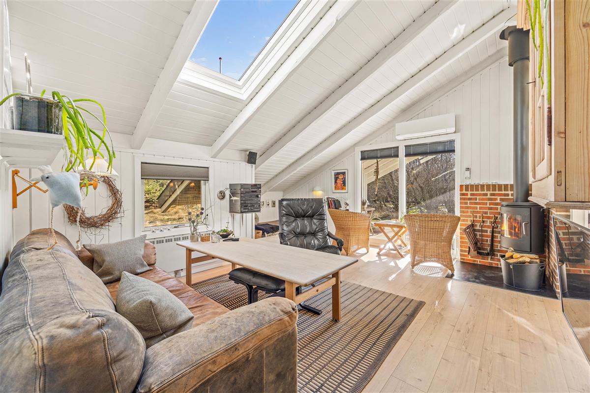 The heart of this beautiful holiday home is the cosy living area with sloping ceilings, thoughtfully furnished with attention to detail. Here you can make yourself comfortable on the sofa or in the sleeping nook, watch television, or enjoy your favourite book. The warmth and crackling of the wood-burning stove add an extra touch of Scandinavian cosiness. Additionally, you can use the energy-efficient heat pump for heating.