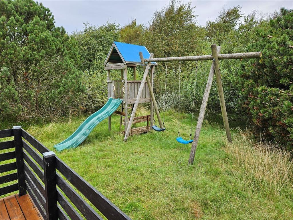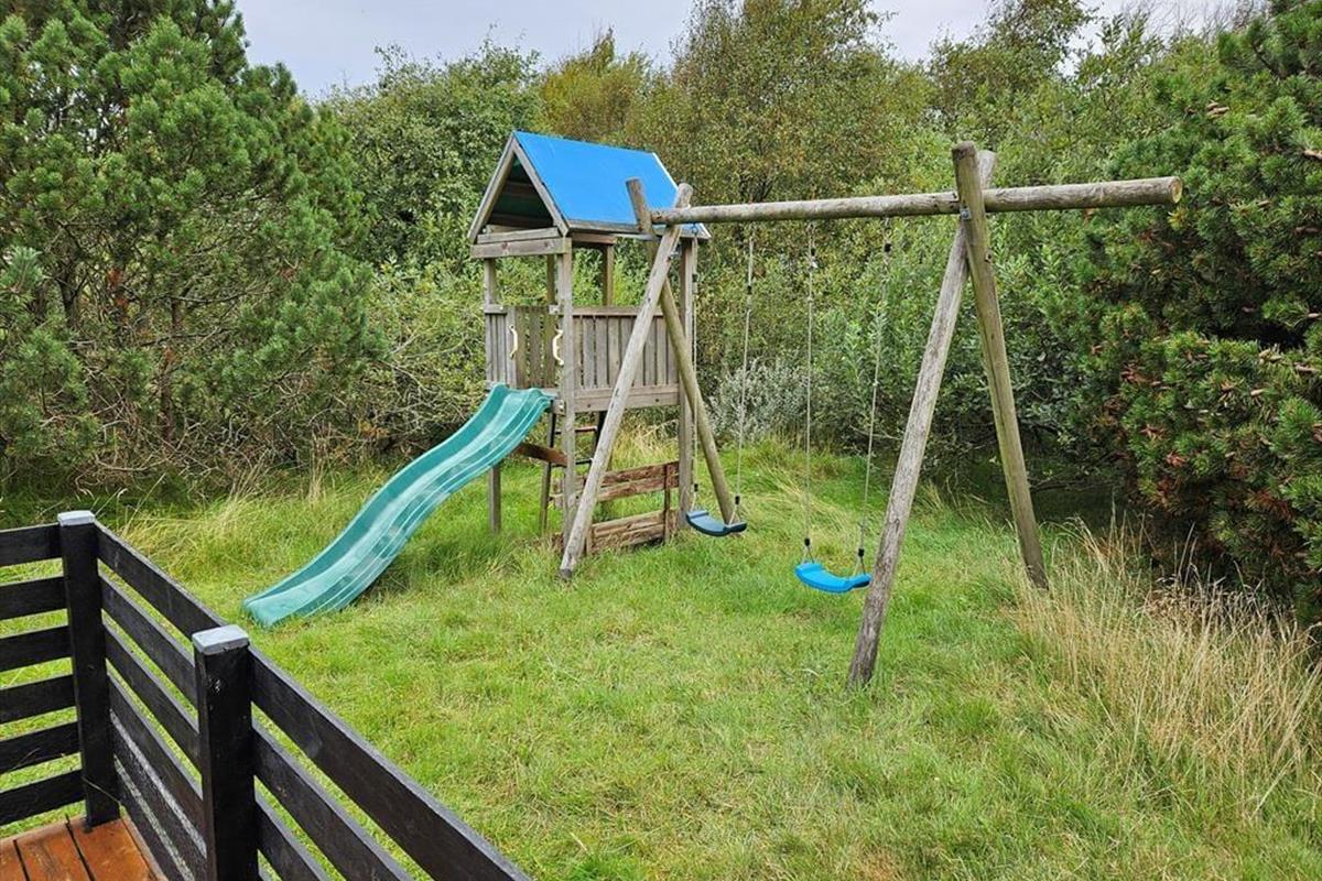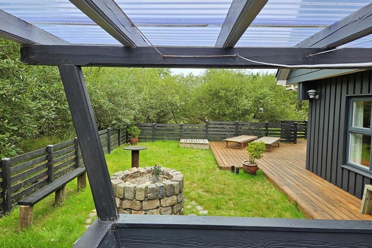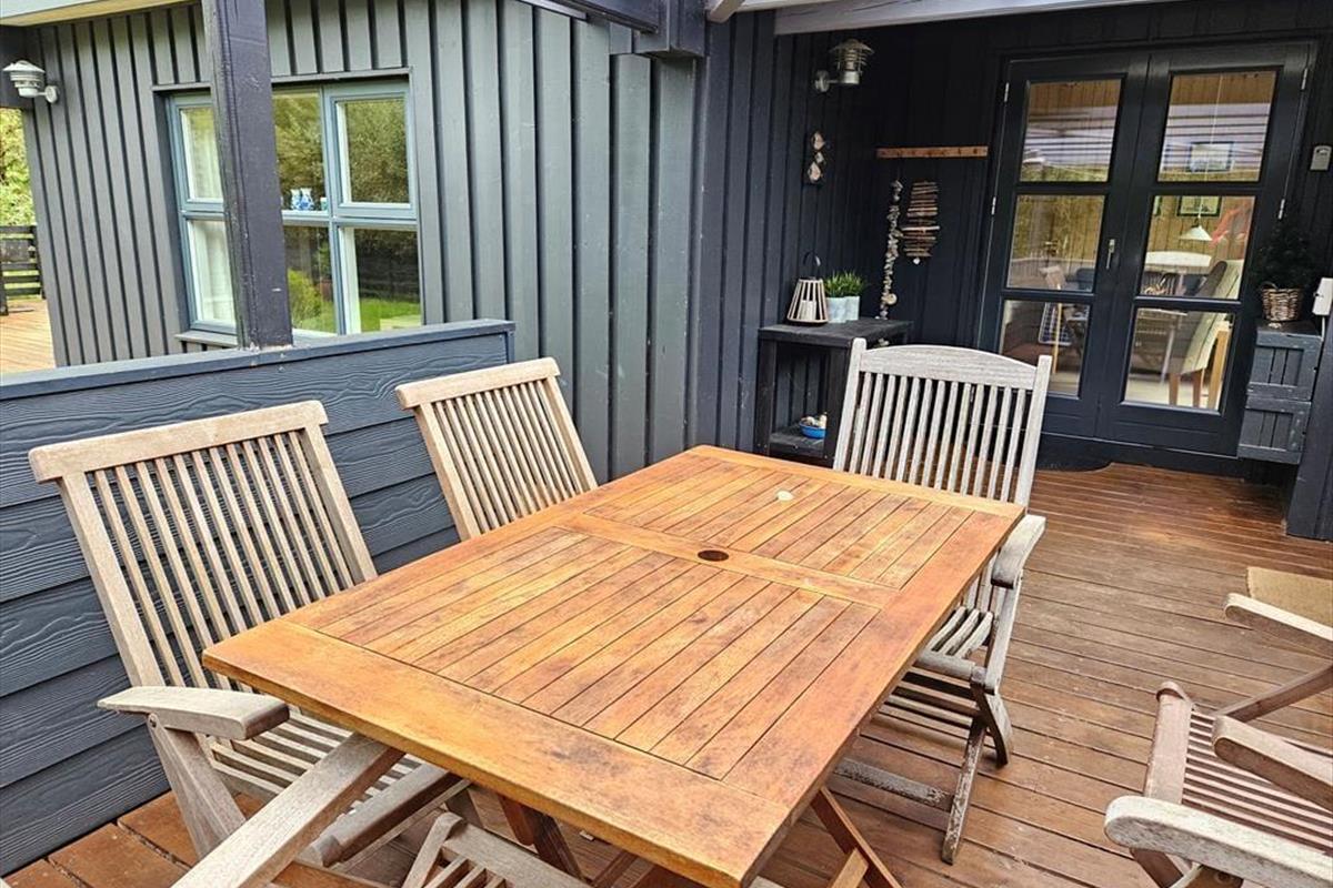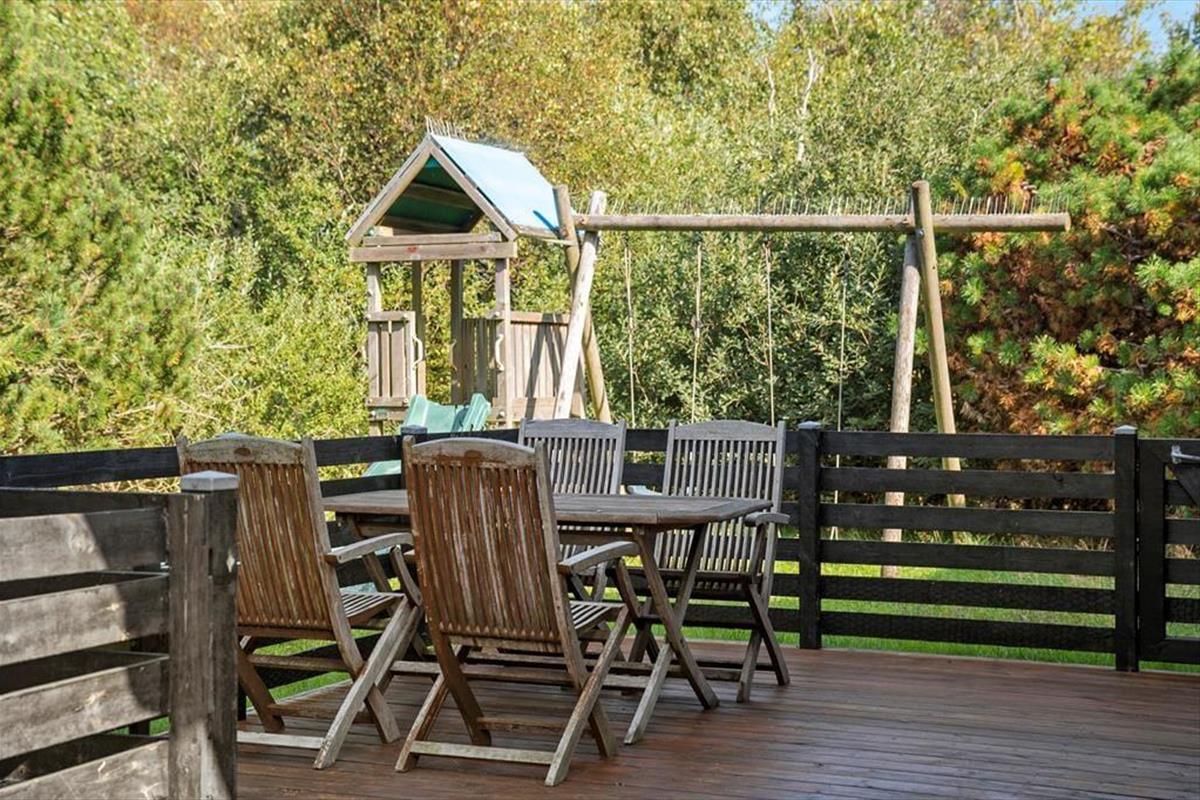 Draußen erwartet dich ein Naturgrundstück, das wie eine Oase für die ganze Familie ist. Unter Bäumen und Büschen findest du Spielgeräte, einen Lagerplatz und mehrere schöne Terrassenbereiche. Sogar ein kleiner Teich, der das malerische Bild des Ferienhauses abrundet, ist hier zu finden! Die Kinder können sich beim Schaukeln, Klettern und Rutschen vergnügen, während du dich mit einer guten Tasse Kaffee entspannen kannst. Abends könnt ihr gemeinsam grillen und entweder auf der offenen Terrasse nach Westen oder im gemütlichen, überdachten Wohnbereich essen.