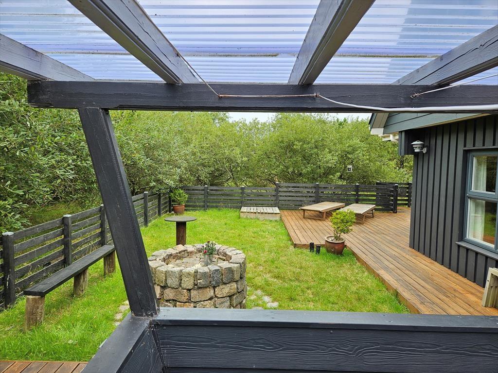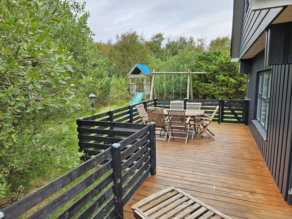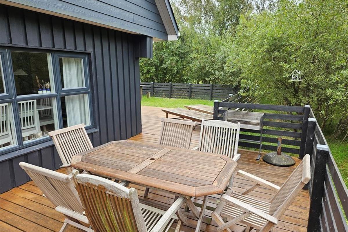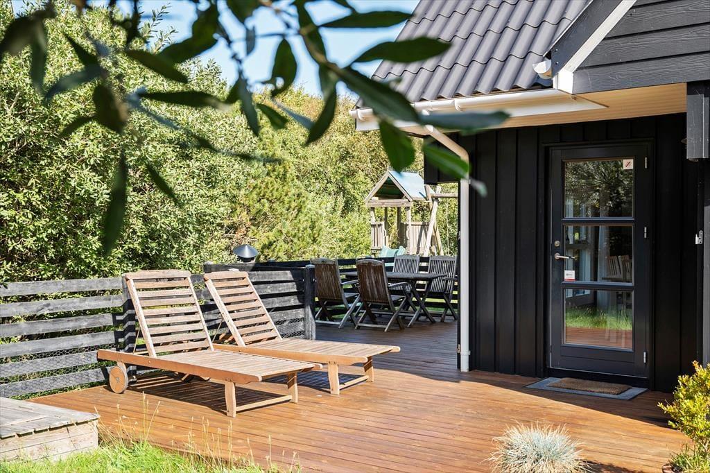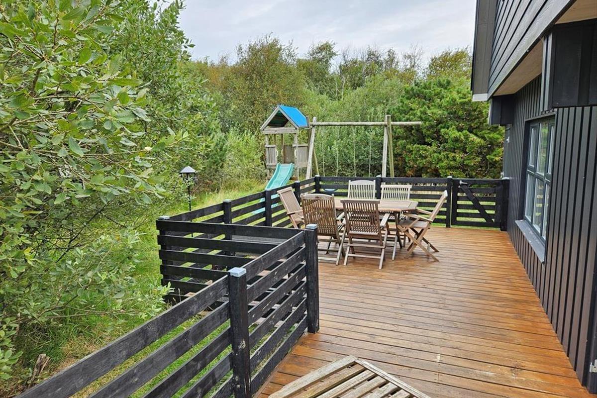 Draußen erwartet dich ein Naturgrundstück, das wie eine Oase für die ganze Familie ist. Unter Bäumen und Büschen findest du Spielgeräte, einen Lagerplatz und mehrere schöne Terrassenbereiche. Sogar ein kleiner Teich, der das malerische Bild des Ferienhauses abrundet, ist hier zu finden! Die Kinder können sich beim Schaukeln, Klettern und Rutschen vergnügen, während du dich mit einer guten Tasse Kaffee entspannen kannst. Abends könnt ihr gemeinsam grillen und entweder auf der offenen Terrasse nach Westen oder im gemütlichen, überdachten Wohnbereich essen.